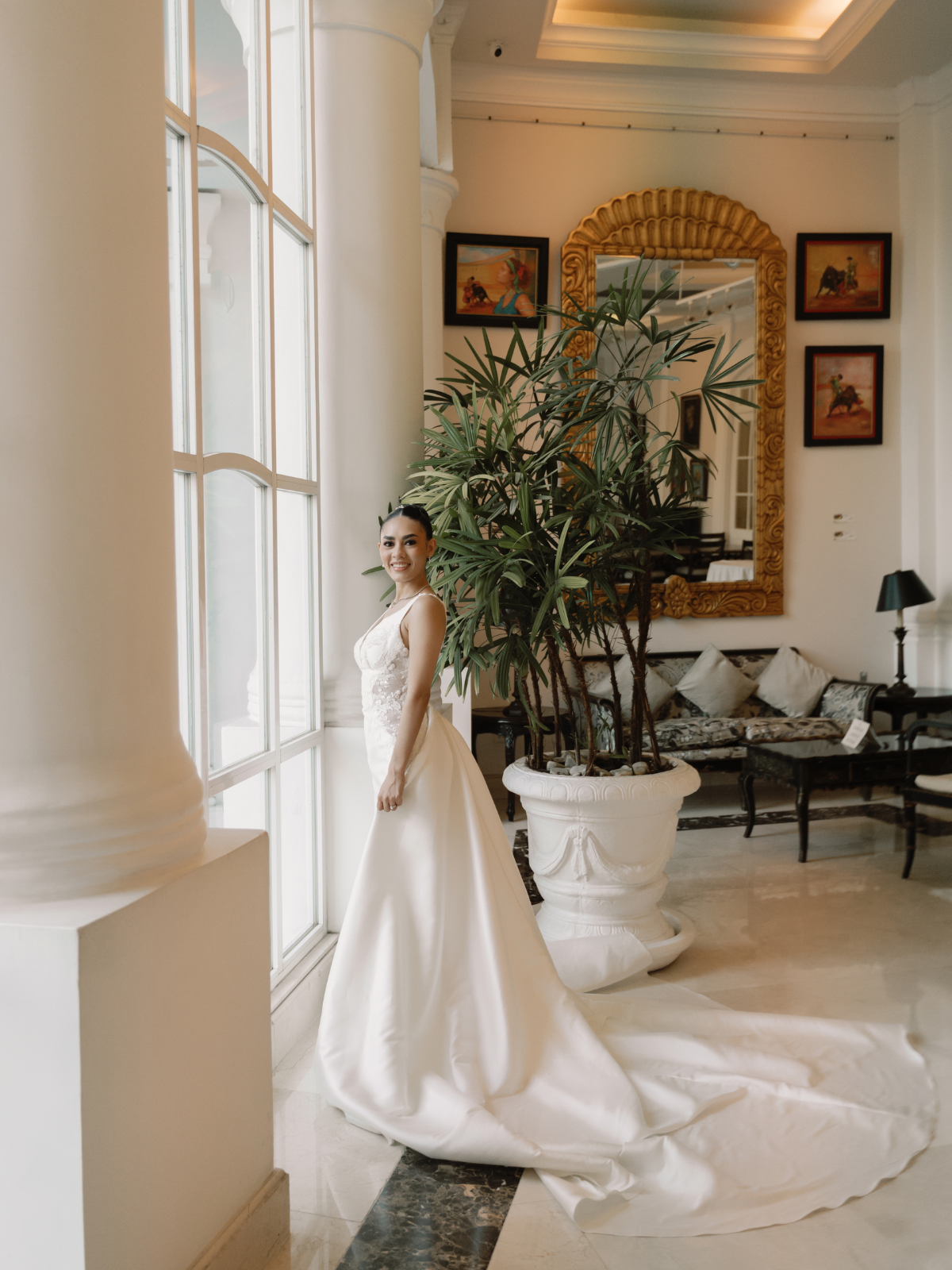 Vestido de Novia en corte Sirena, con cola desmontable, línea de abotonadura española, bordado en piedras en la cintura y los tirantes.