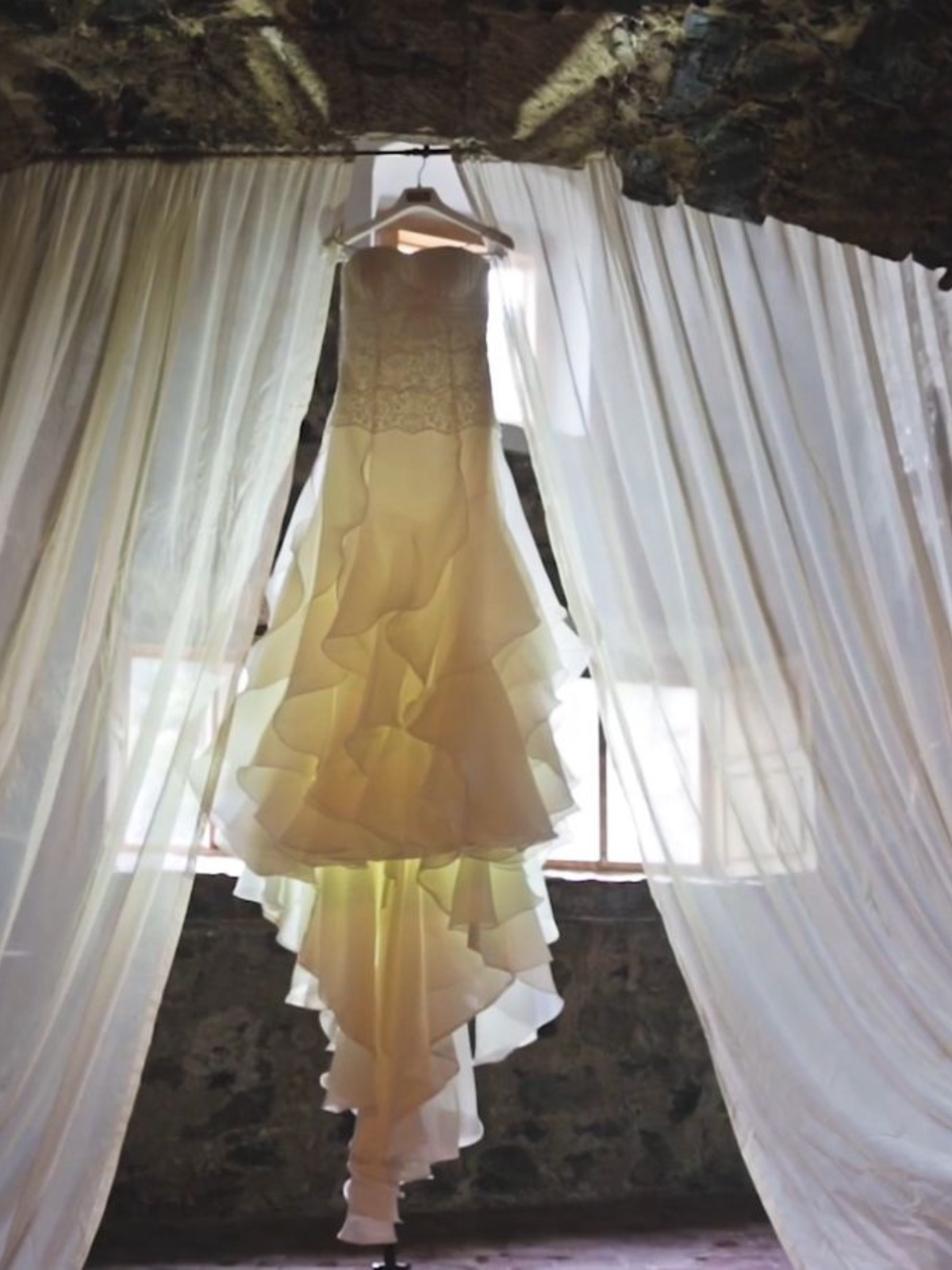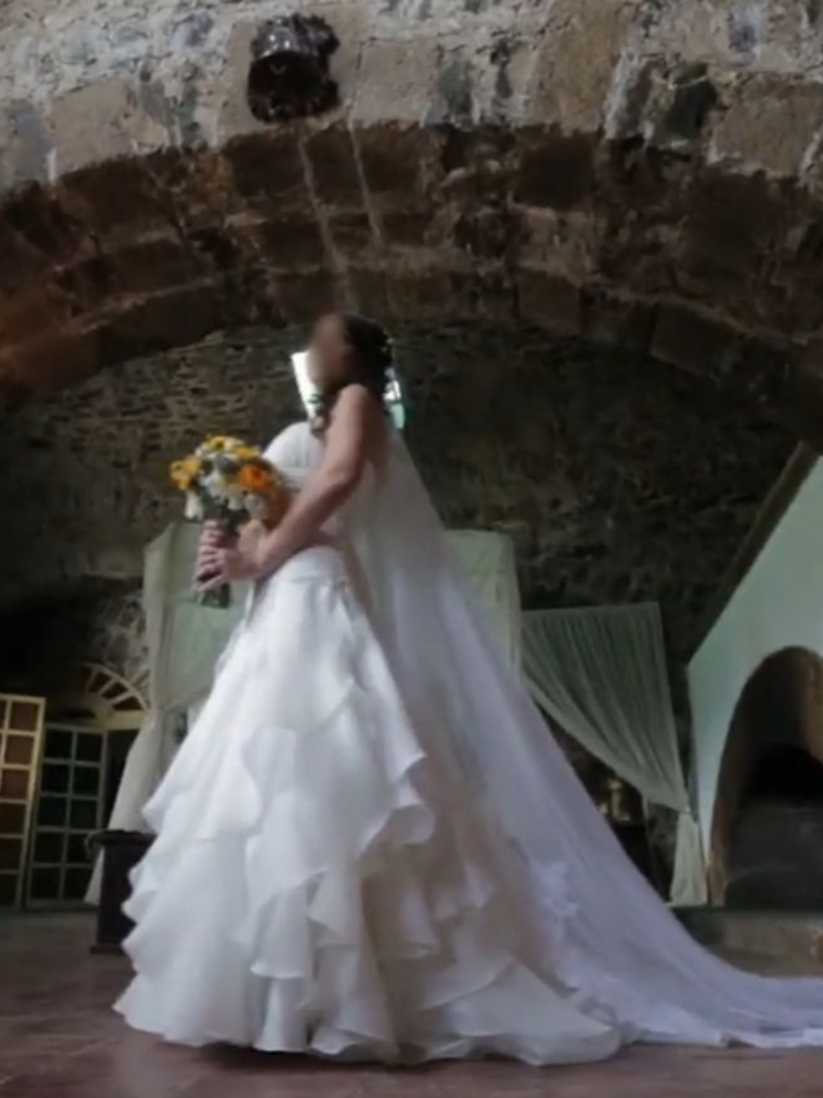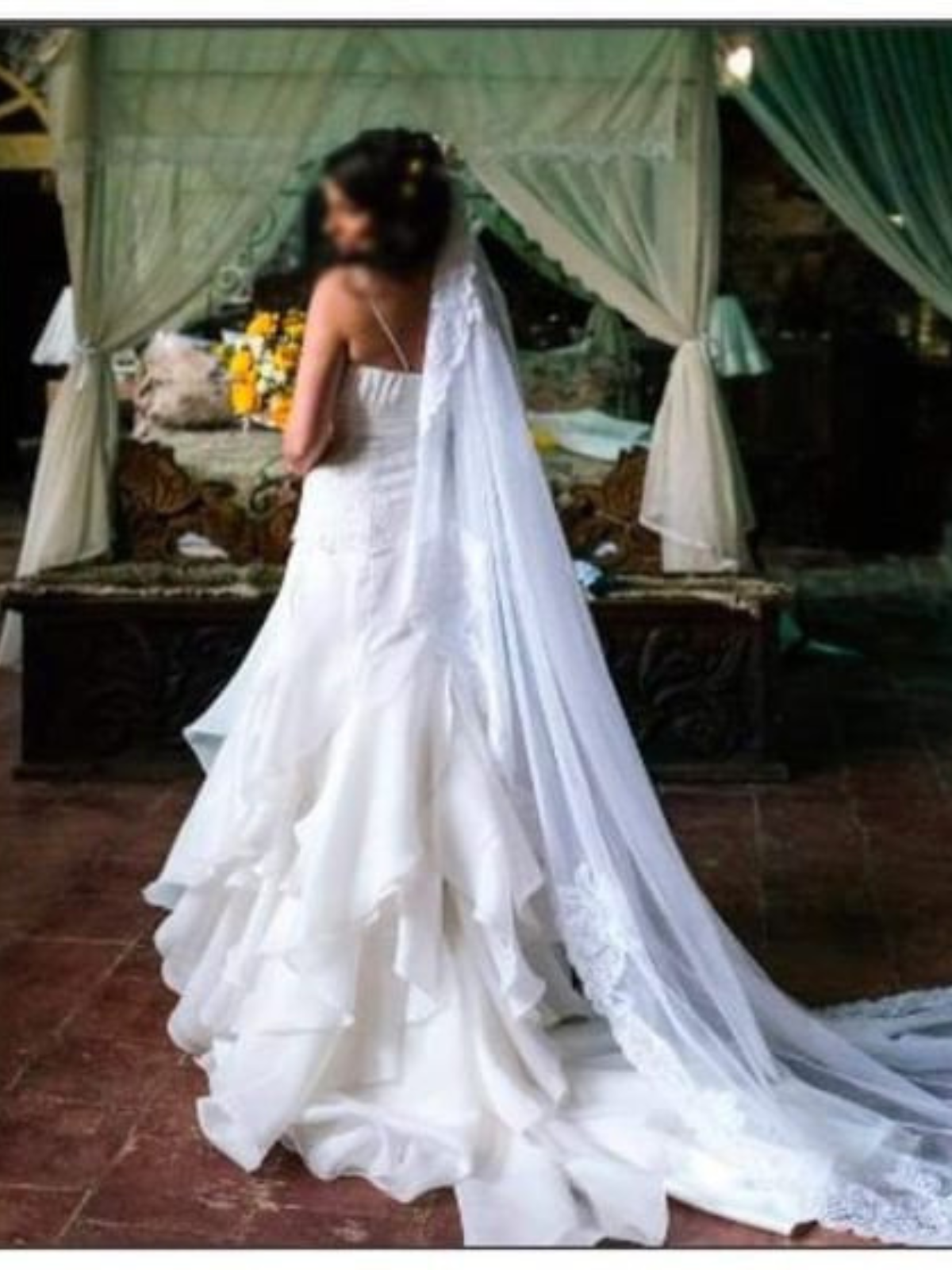 Hermoso vestido corte trompeta, con olanes. Hace un cuerpo precioso tiene aplicaciones y moño