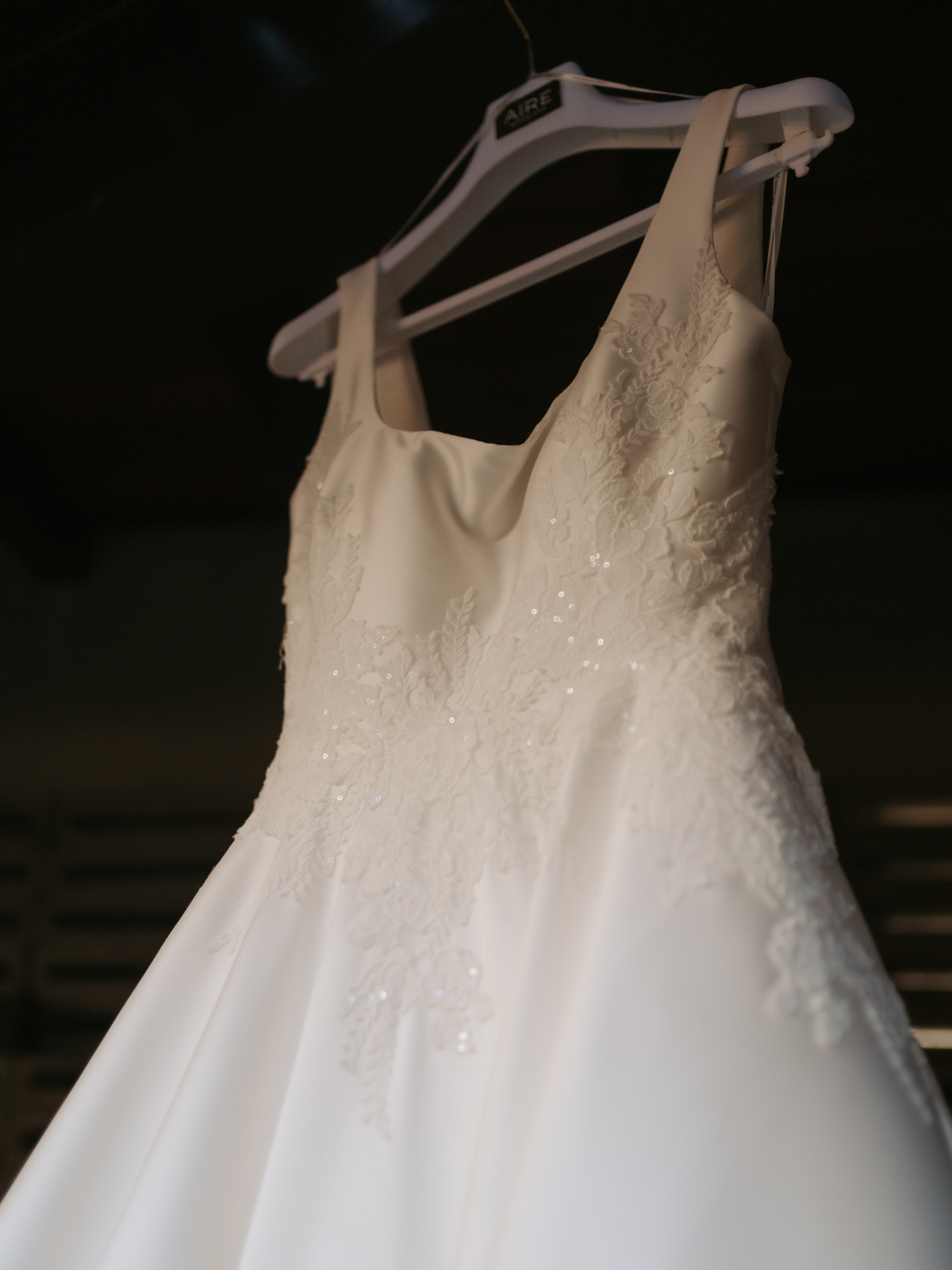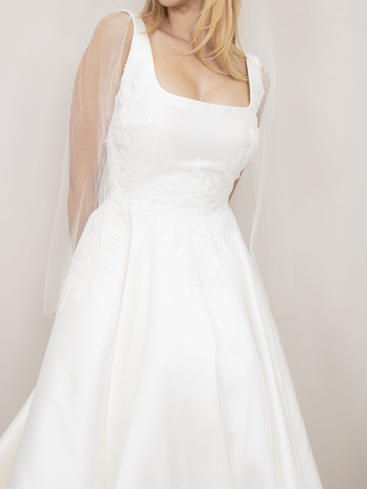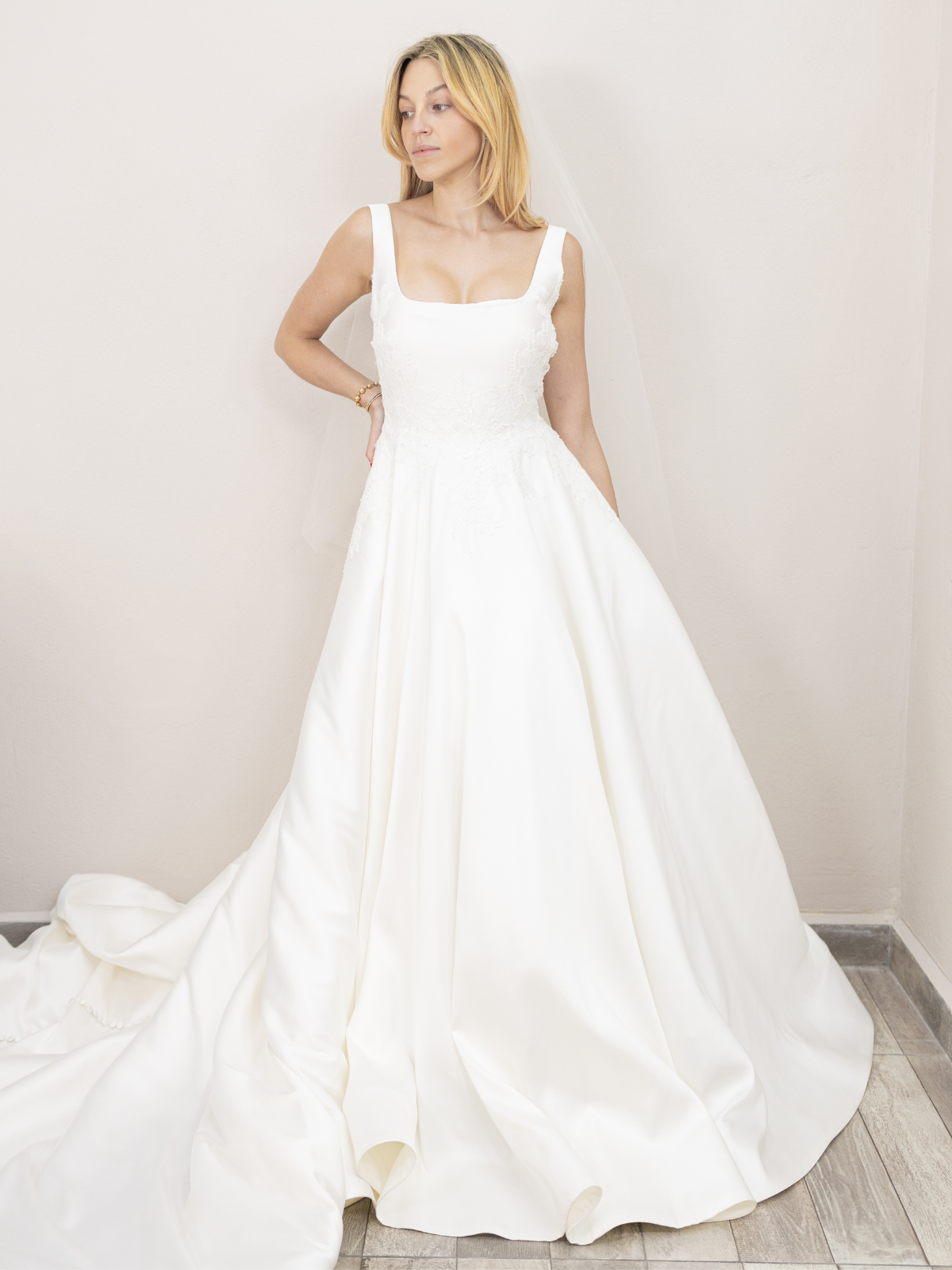 Es un vestido hermoso y elegante en color blanco natural y tela de mikado lo que le da una bonita caída y estructura. Cuenta con un pequeño toque de encaje en la cintura y también tiene bolsas. La alteración que le hicieron fue agregar los botones en toda la cola lo que lo hace ver increíble y diferente. Además la cola la puedes subir en 1 o 3 puntos para que puedas bailar sin problema. El largo no fue modificado y con tacones de 9cm el vestido queda perfecto para alguien de 1.75 de lo contrario puedes modificarlo para que te quede exactamente a la altura que necesitas.