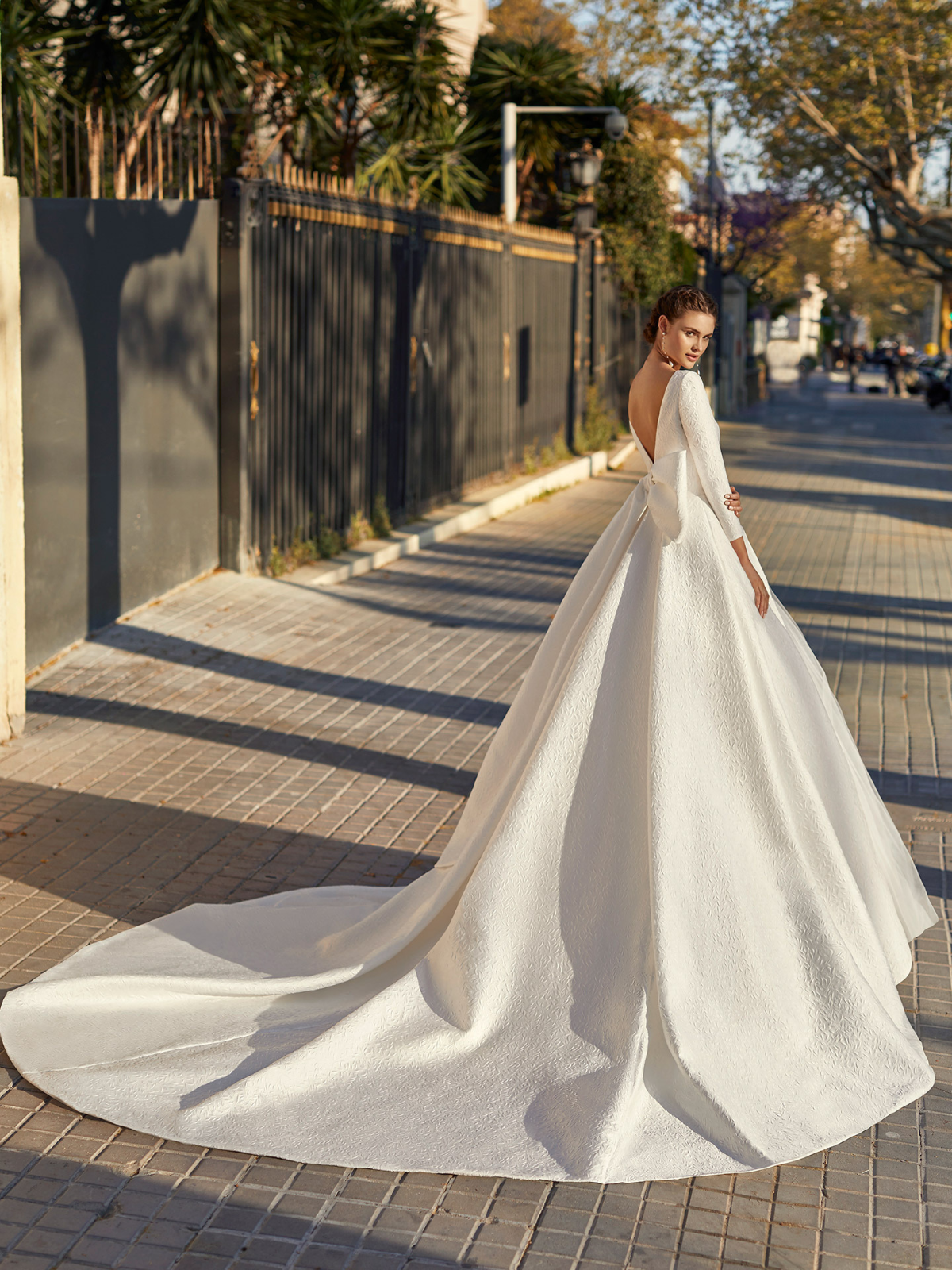Vestido que destila clase con su detallista brocado y su diseño de tul. Cuerpo limpio, escote barco, espalda ilusión, bolsillos y mangas largas son los rasgos que definen este vestido de novia de corte princesa. La falda con abertura tiene en los detalles de pedrería y el tul con vuelo los grandes protagonistas, mientras que un lazo overzise en la espalda completa el diseño. Incluye guardapolvos original, vestido nunca usado y no tiene ningun ajuste o alteración.