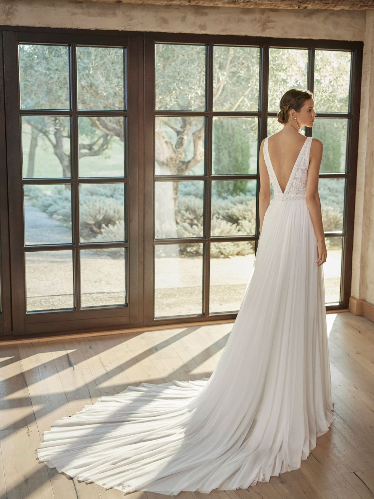 Vestido de novia sin mangas, con caída, corte V en la espalda, incluye velo.