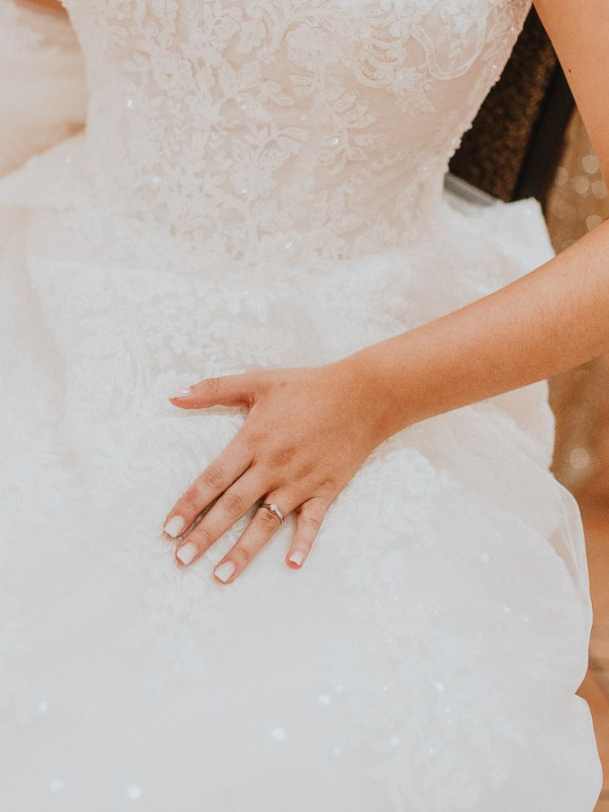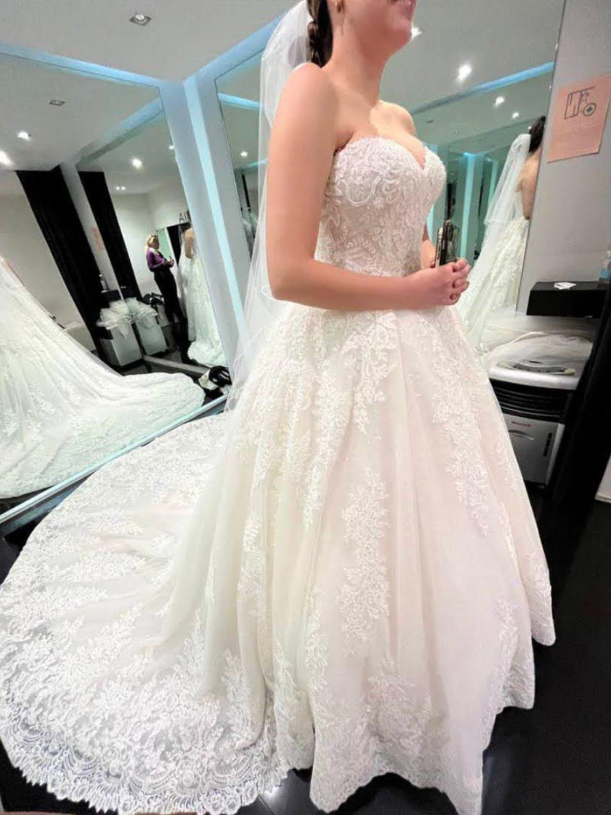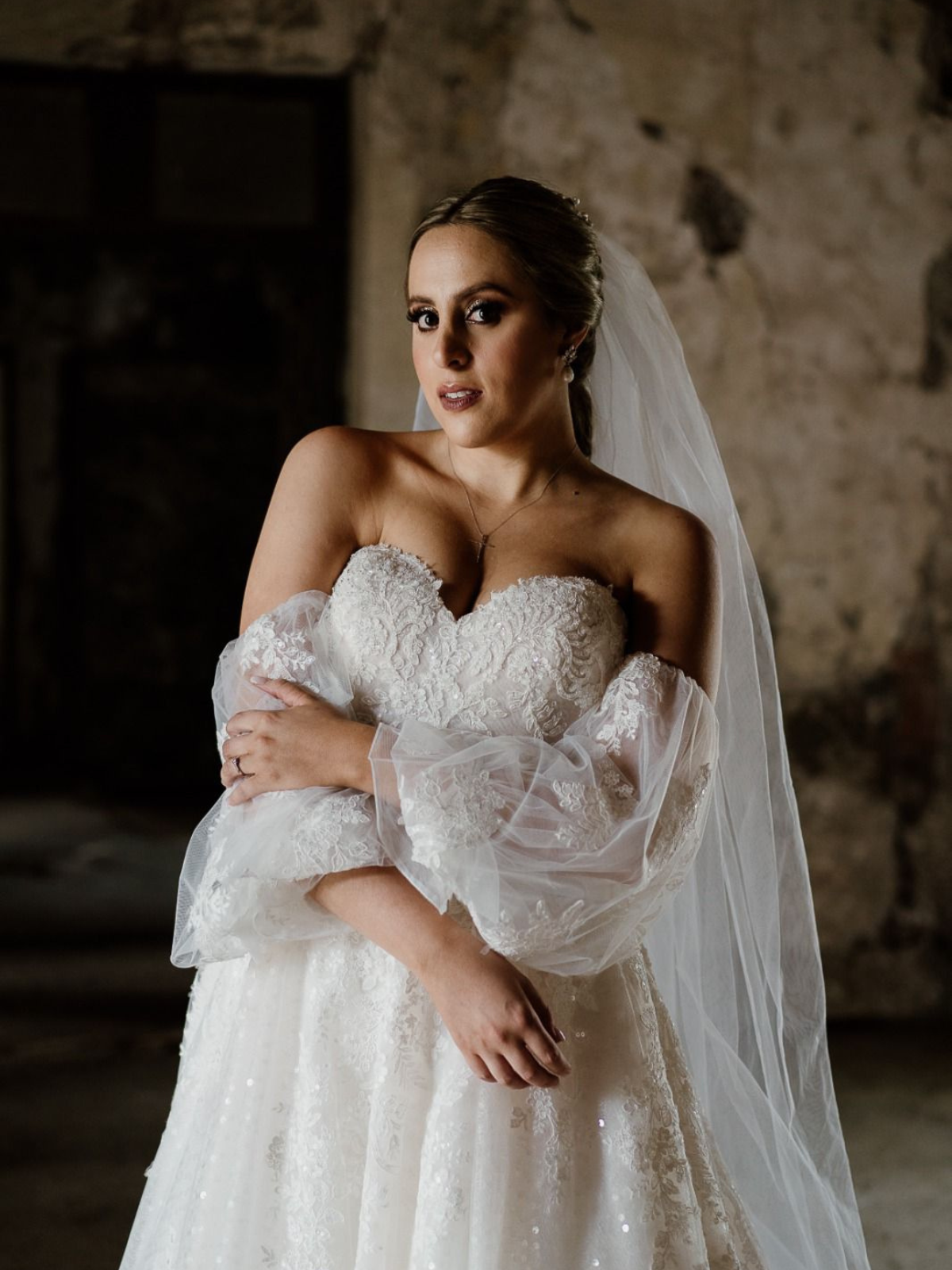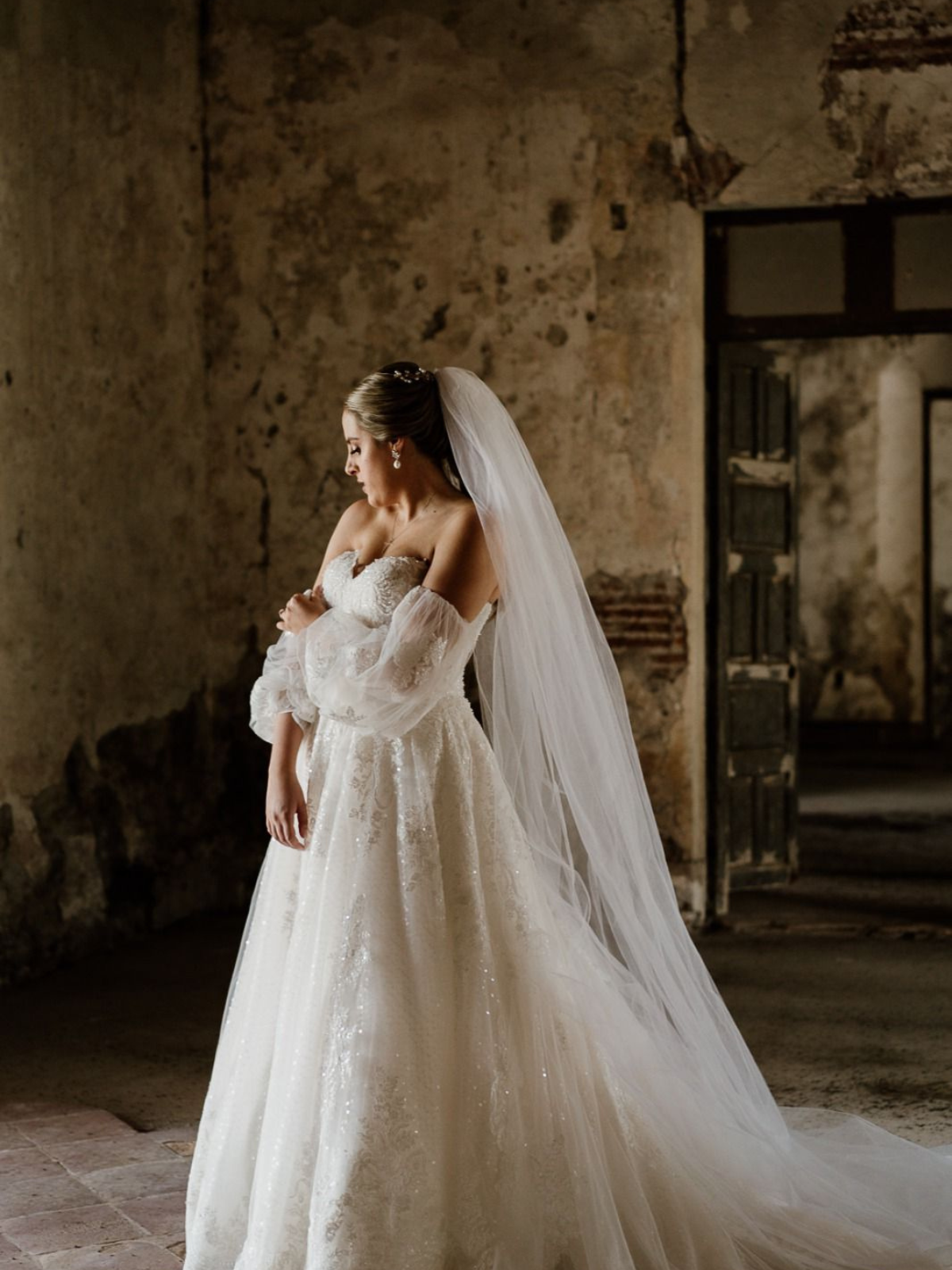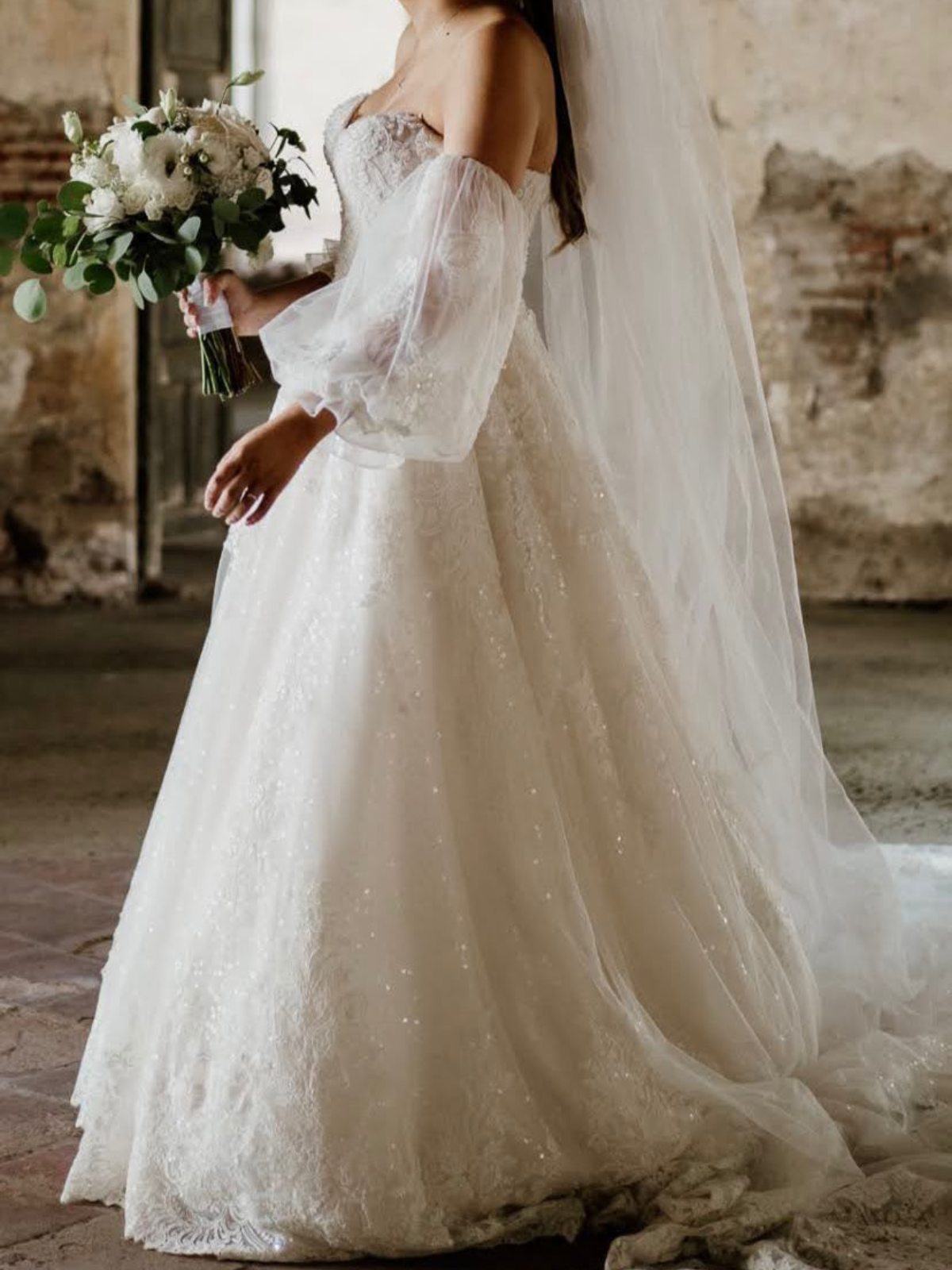 Un vestido de novia con detalles bordados a mano, tiene encaje y cola muy amplia. Cuenta con mangas que se pueden quitar y poner y por la espalda cuenta con agujeta lo que hace que sea un vestido muy cómodo porque puedes ajustarlo a tu medida.