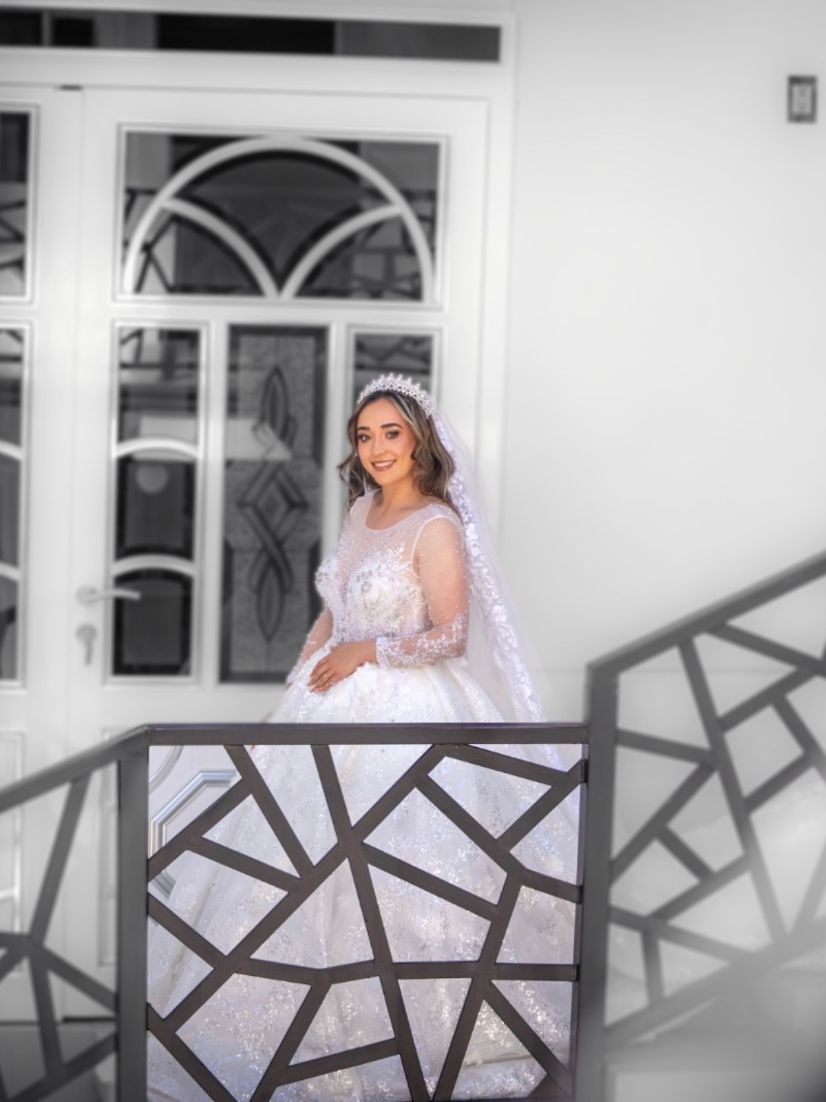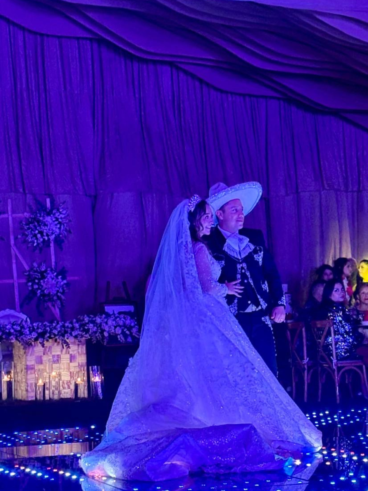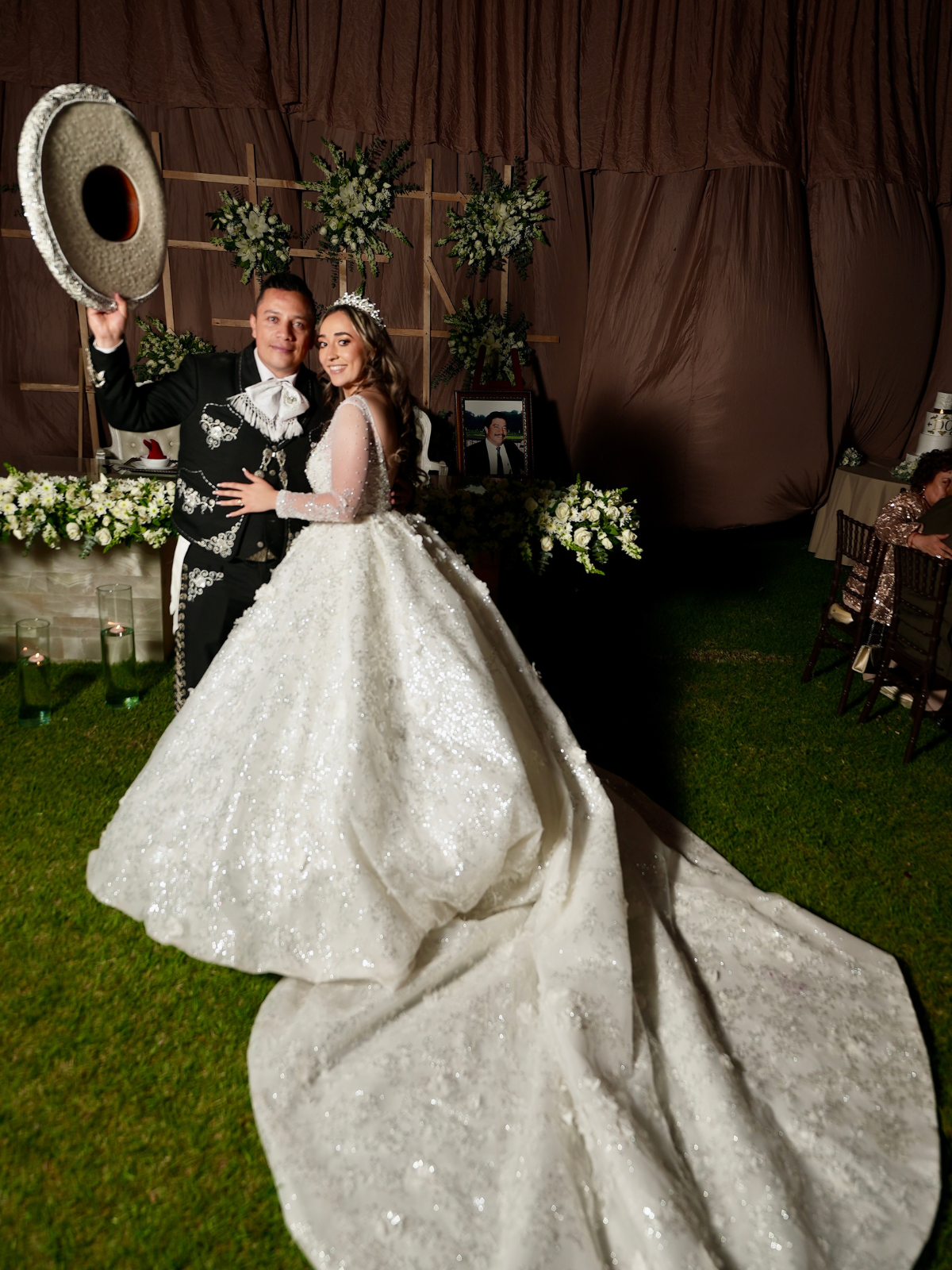 Es correcto princesa con un escote en la espalda en v transparencia en el pecho y mucho brillito lo entrego con su velo bordado y de 5 mts de largo también cuenta con transparencia en las mangas pero es muy cómodo.
