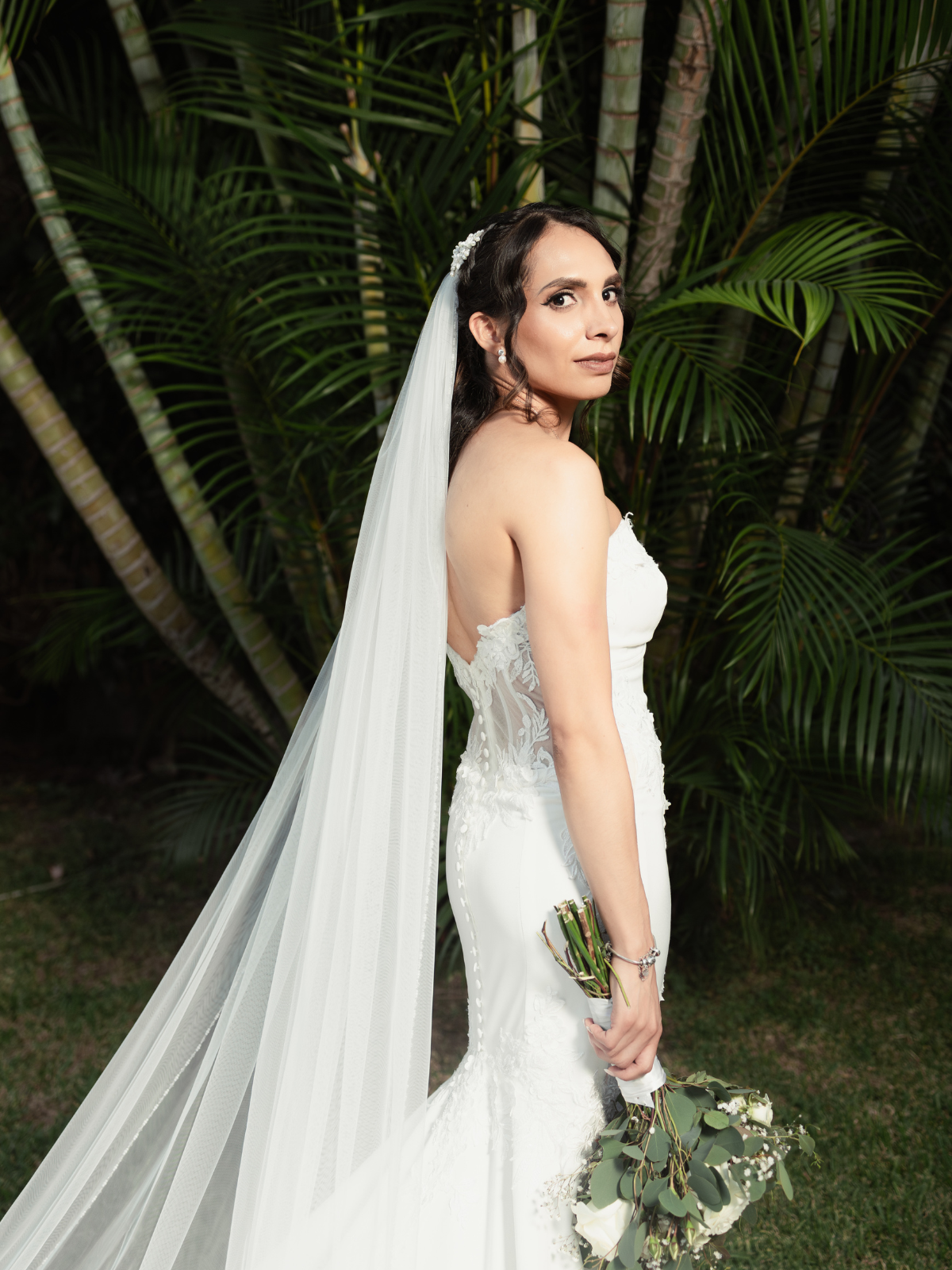 Vestido color Ivory en corte sirena. Con corset y su forma de cierre es con cierre. Detalle de botones desde el corset hasta donde inicia la cola. Mangas caídas al hombro con detalles florales en mangas, cola, y enfrente. Con escorte en forma de corazón.