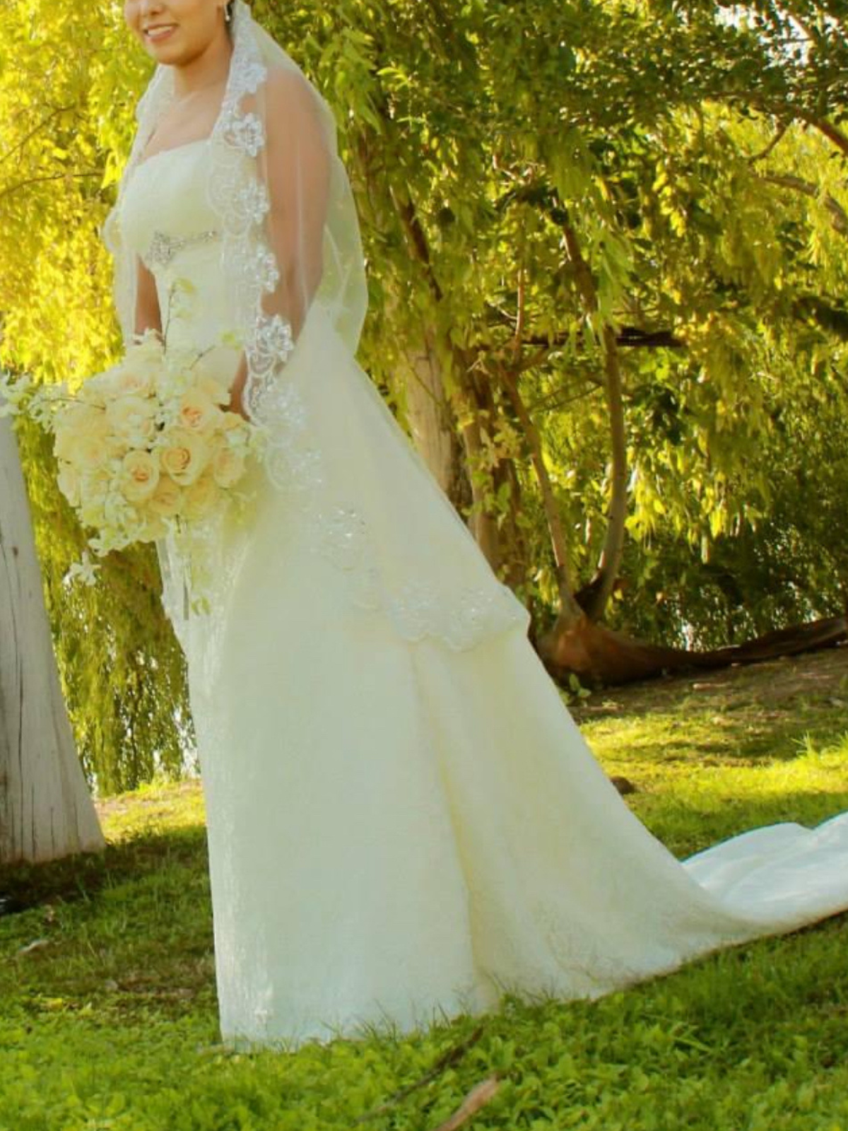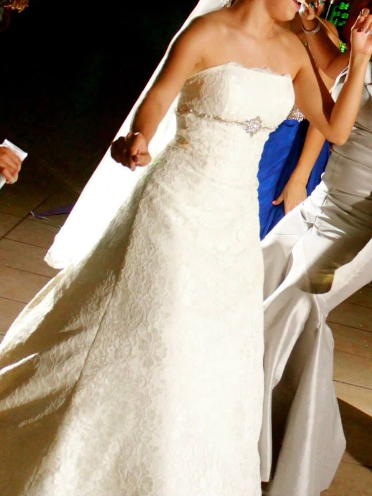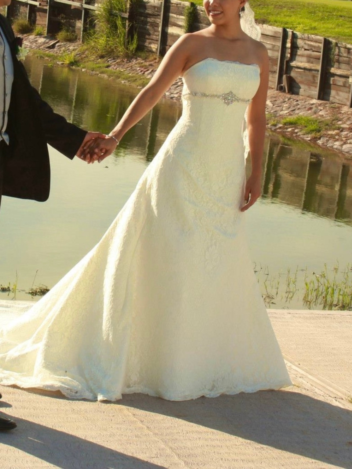 Hermoso vestido de encaje, elegante, sencillo y cómodo. Pedrería en la línea bajo el busto, zíper en la espalda y botones.