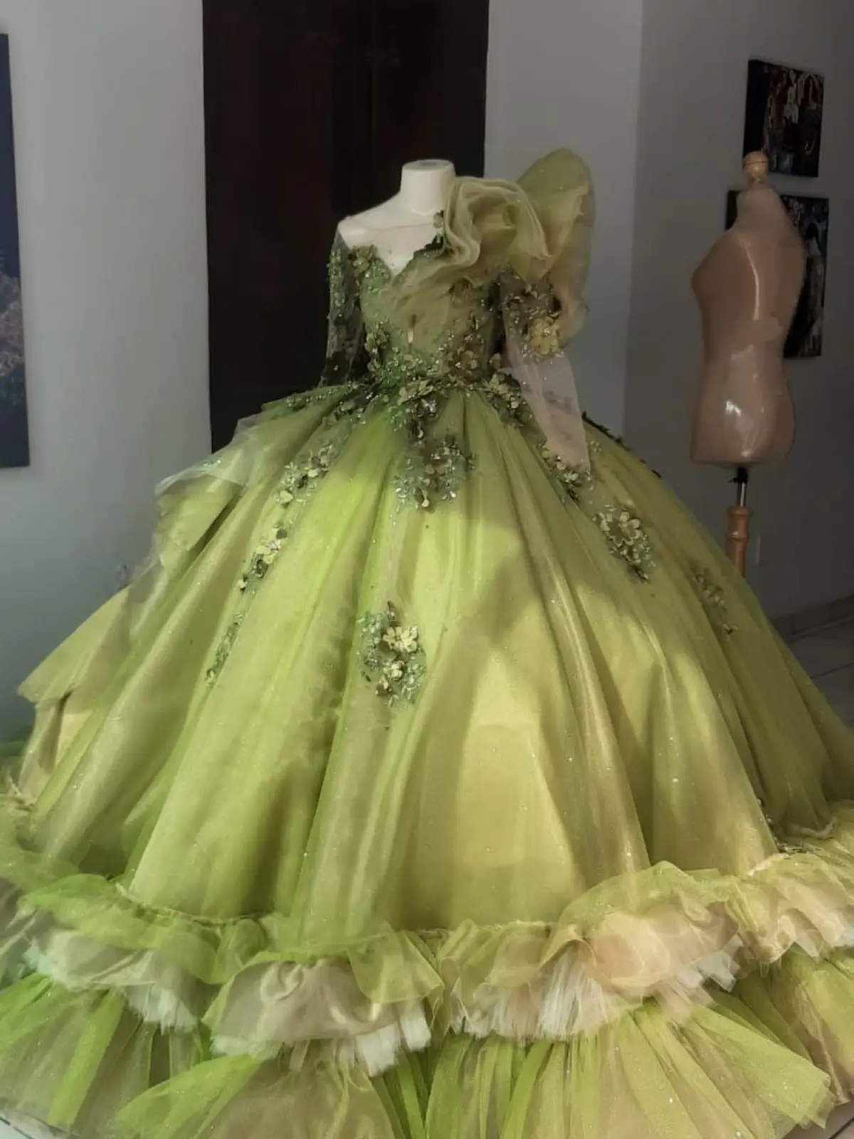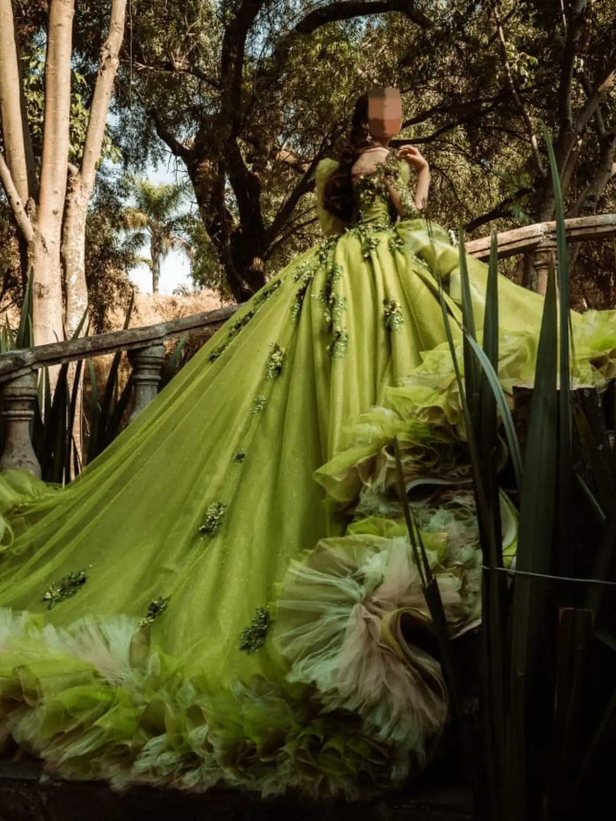 Vestido de XV años hermoso, color verde, con diseño único, hecho con materiales de alta calidad, por costurera de especialidad en vestidos de boda y XV años, altamente reconocida en el medio en Guadalajara, con amplia cauda y detalles con flores y pedrería. Incluye crinolina muy flexible y ligera, la cual hace el uso del vestido muy agradable y adecuado para bailar. De hecho la cauda se recoge y sostiene por la parte trasera del mismo vestido de forma segura.