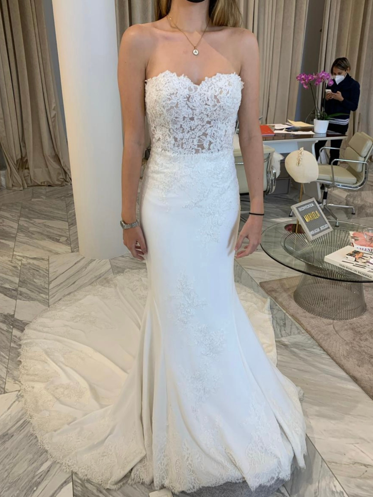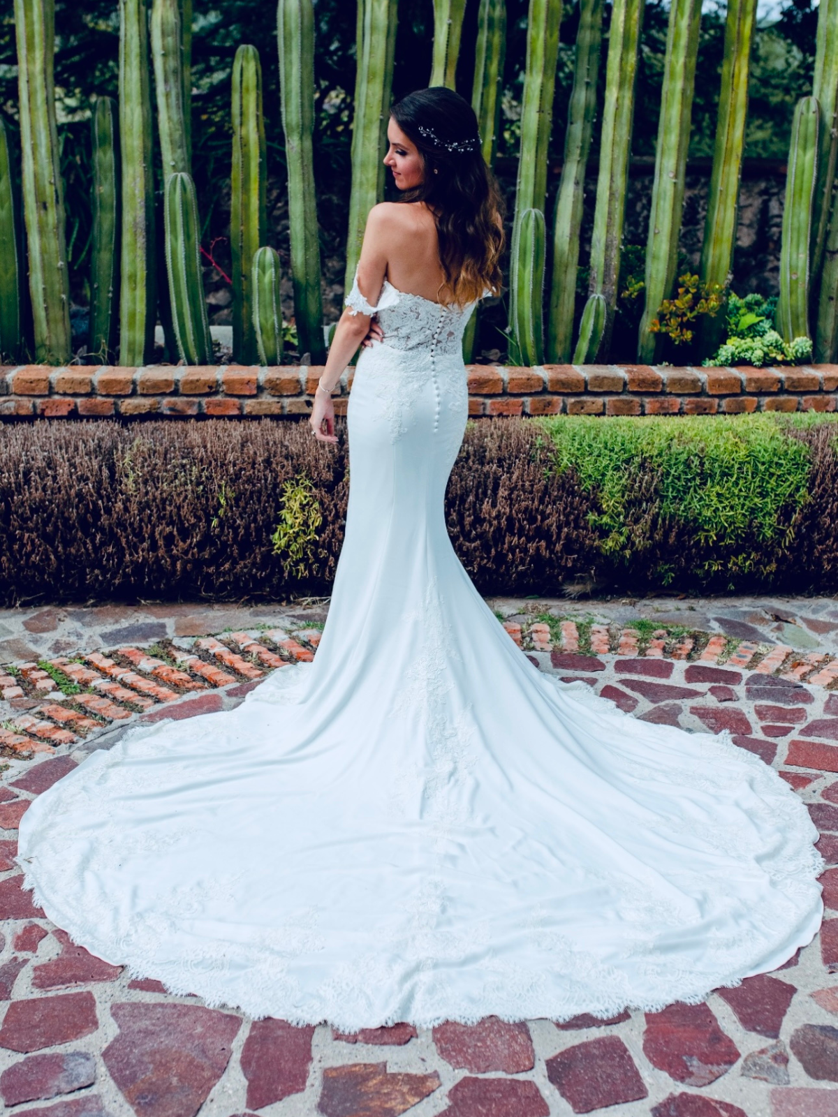 Vestido blanco, con encaje, strapless, con mangas que se puedan poner o quitar, cola.