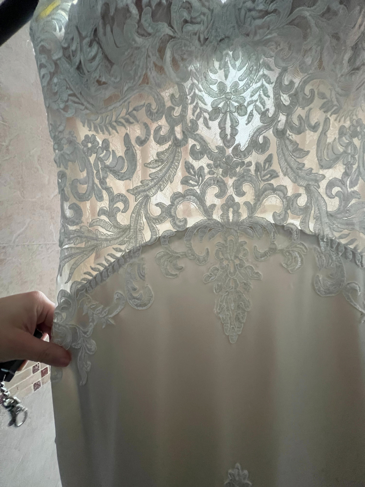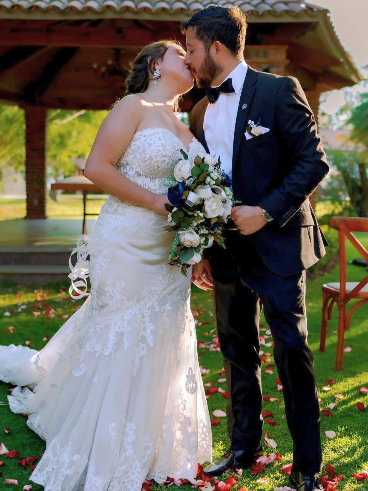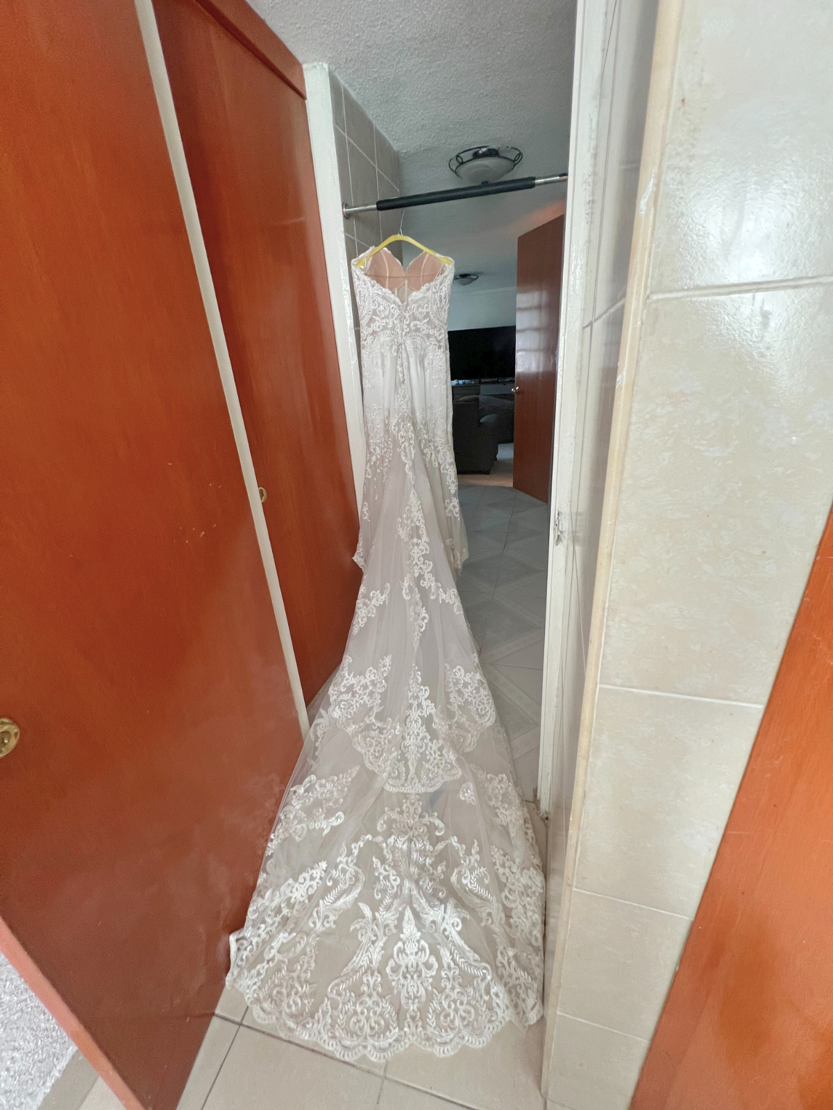 Este vestido de sirena petit es un sueño hecho realidad. Con su corte ajustado y su cola impresionante de 2 metros, es muy femenino. Los detalles de pedrería y encaje añaden un toque de romanticismo y magia.