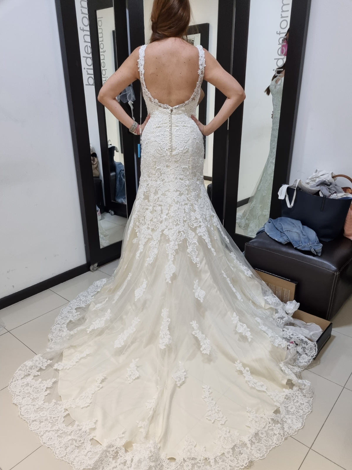 Es un vestido de novia estilo sirena elegante y romántico, confeccionado en un tono marfil suave que le da un aire clásico y luminoso. El cuerpo del vestido está completamente cubierto de encaje bordado, con aplicaciones florales que se extienden de manera delicada desde el escote hasta la falda.