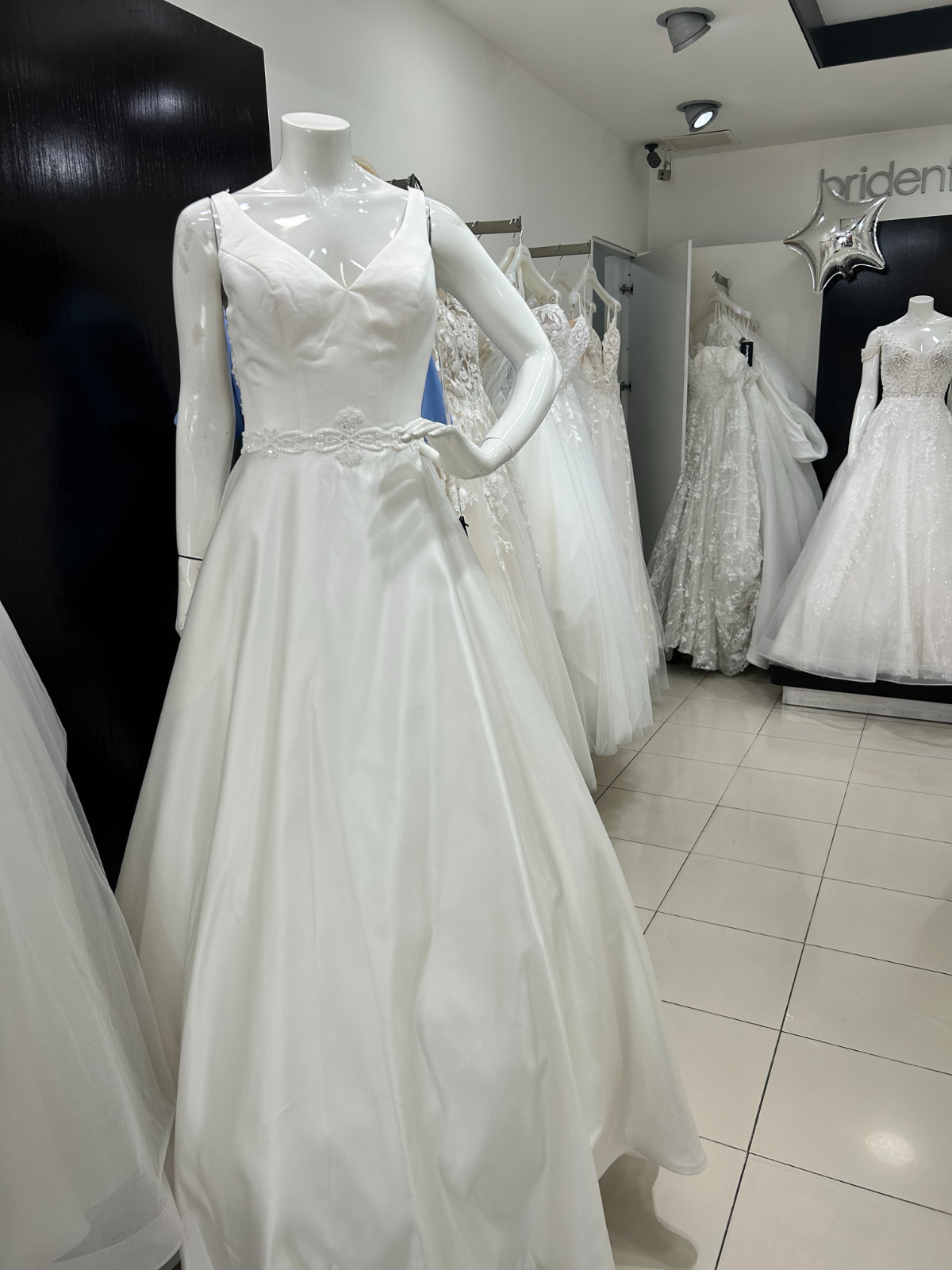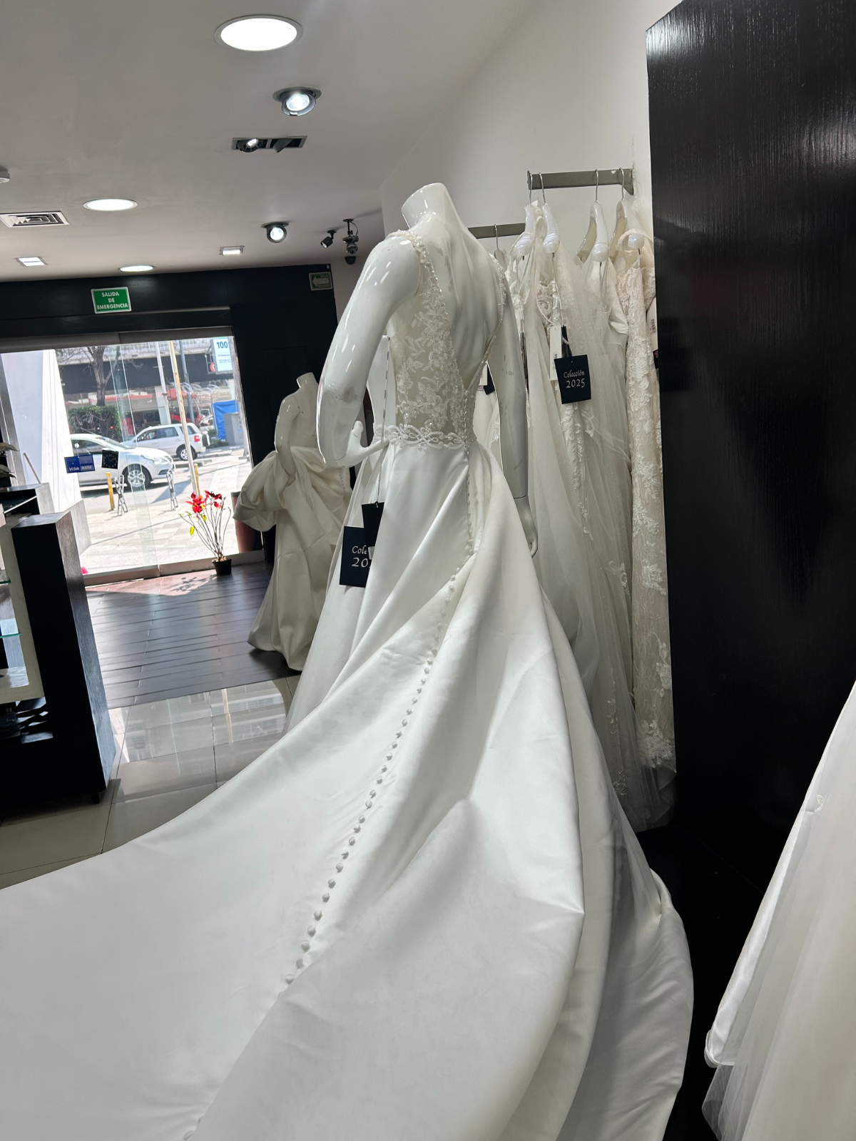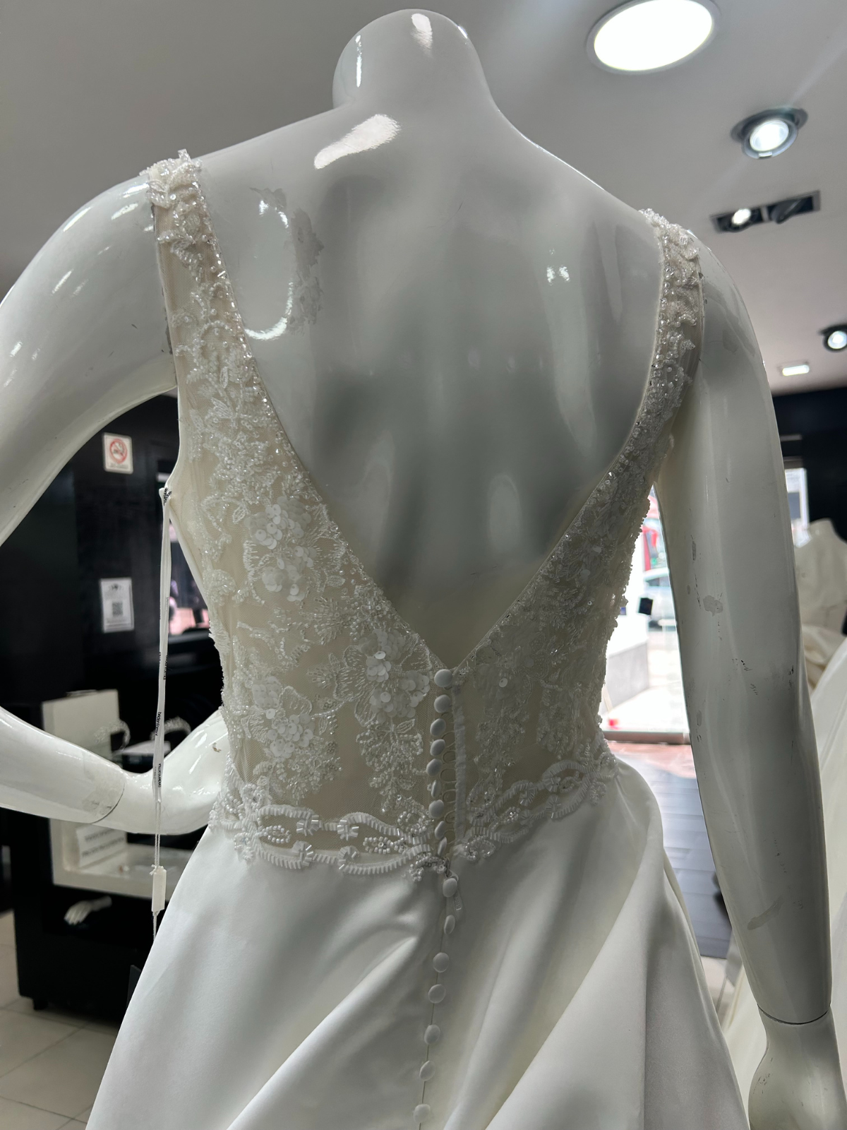 Vestido completamente nuevo, color perla, encaje en la espalda, con aplicaciones que realzan la cintura, botones que van desde el inicio del escote de la espalda hasta la cola del vestido. Talla 34; sin embargo, como jamás se le hicieron alteraciones puede aumentar dos tallas o disminuir una (ajustes completamente GRATIS directamente en Bridenformal con dos meses de anticipación).