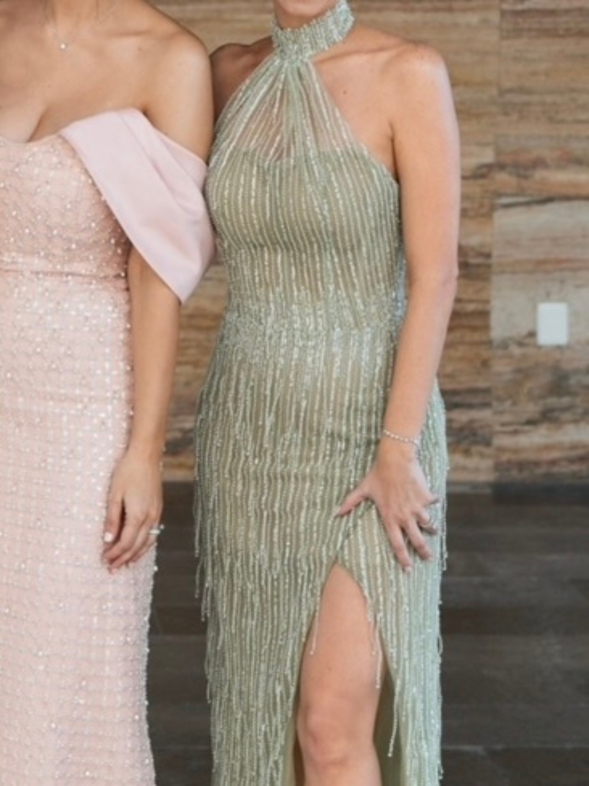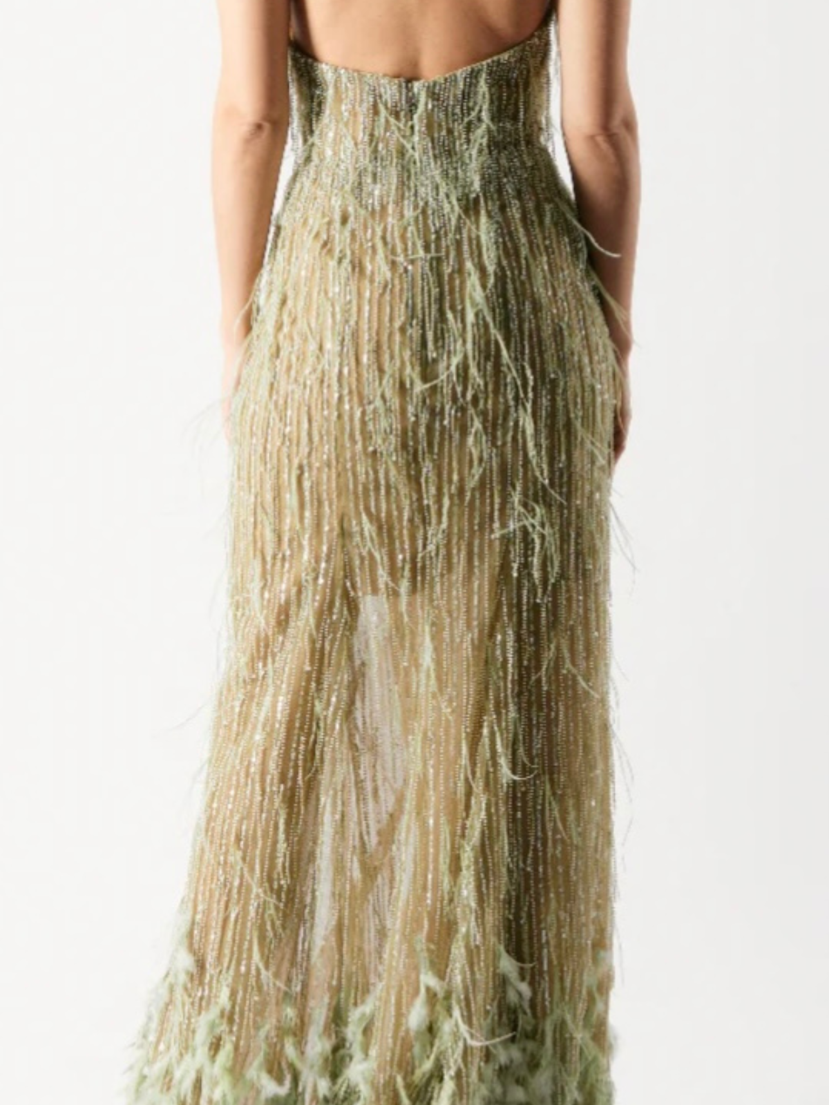 Vestido Vero Díaz verde con aplicaciones en pedrería. Sin plumas en su lugar se pusieron en pedrería simulando plumas.