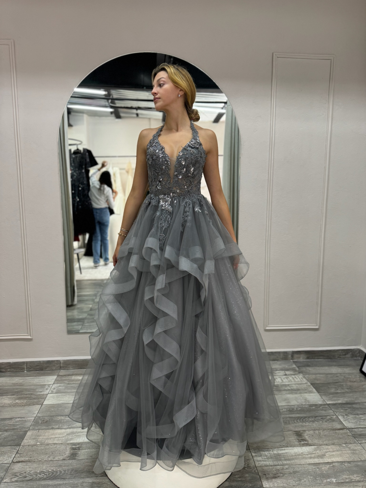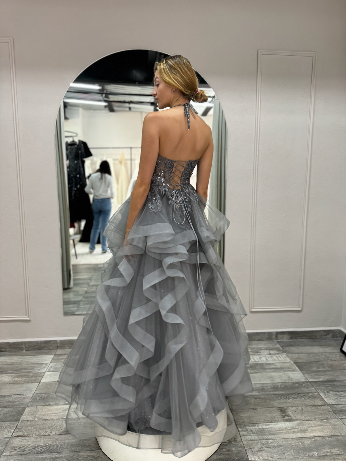 Hermoso vestido color gris con olanes, fluido. Excelente condición precioso para boda de noche.