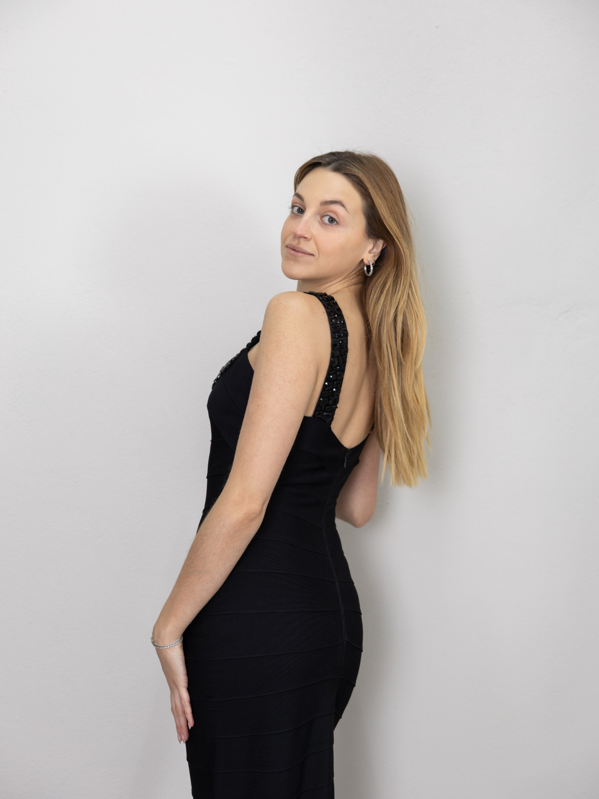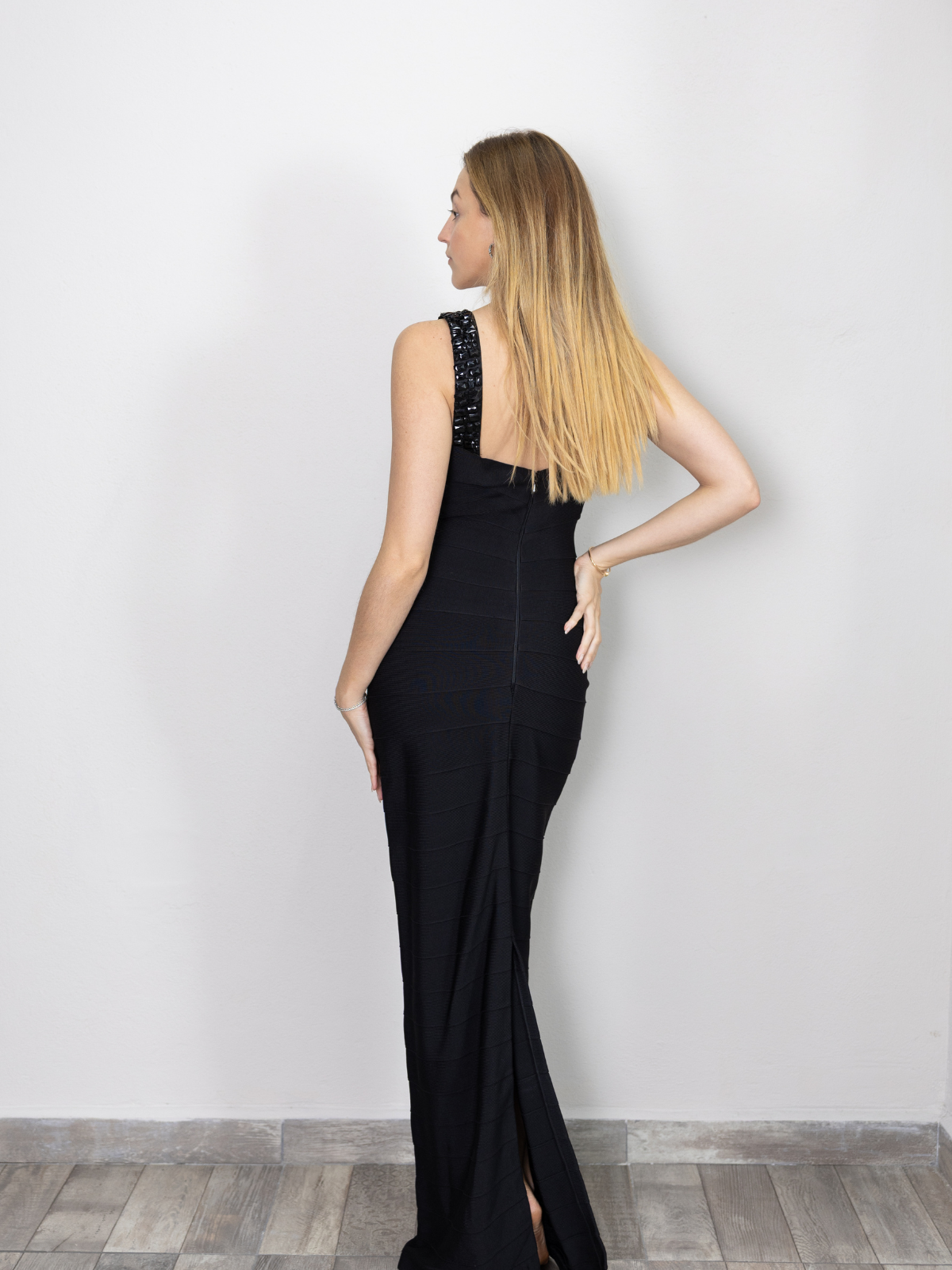 Vestido negro entallado que te hace una silueta hermosa, tiene una pequeña abertura en la parte de atrás muy lindo