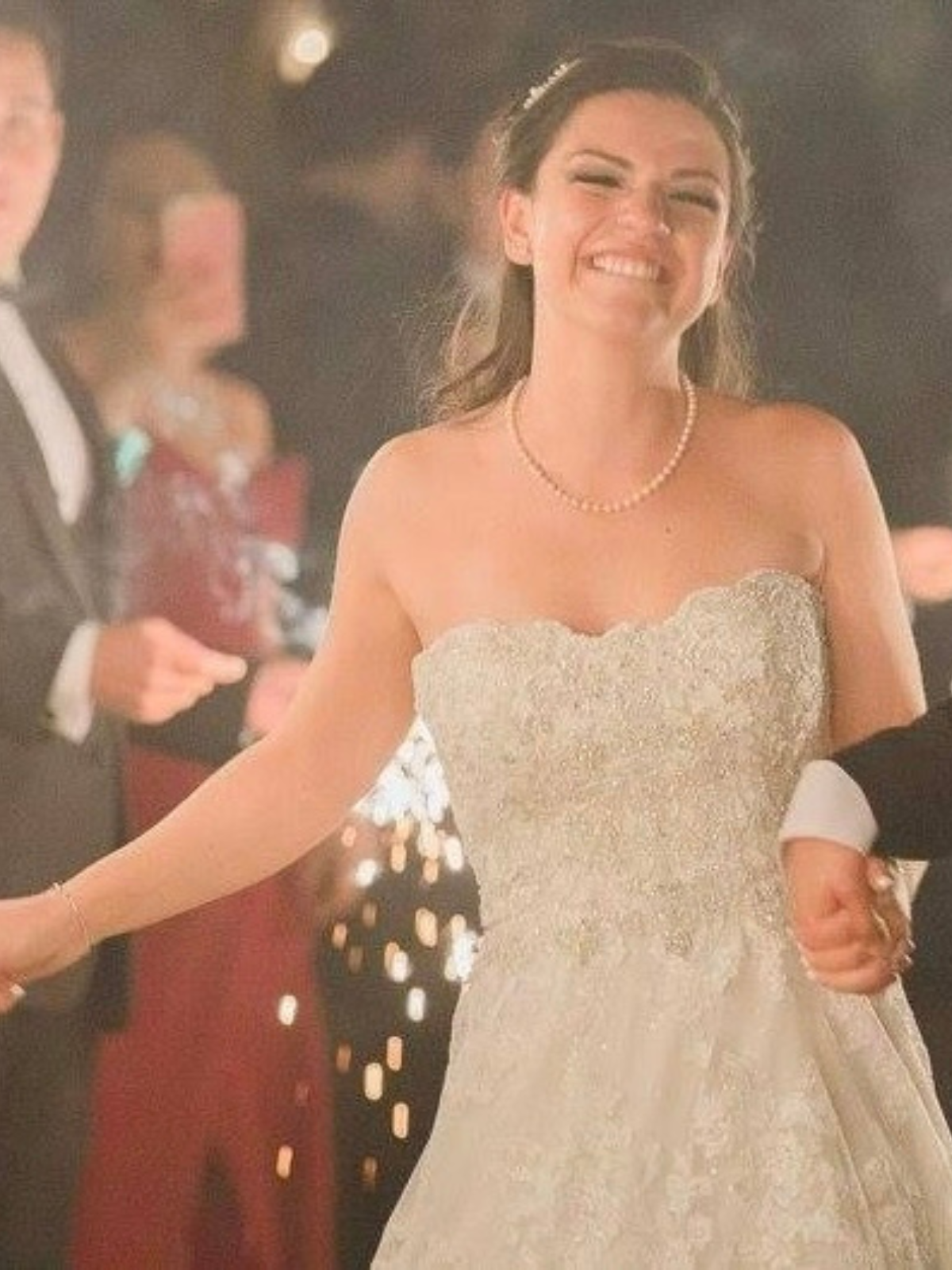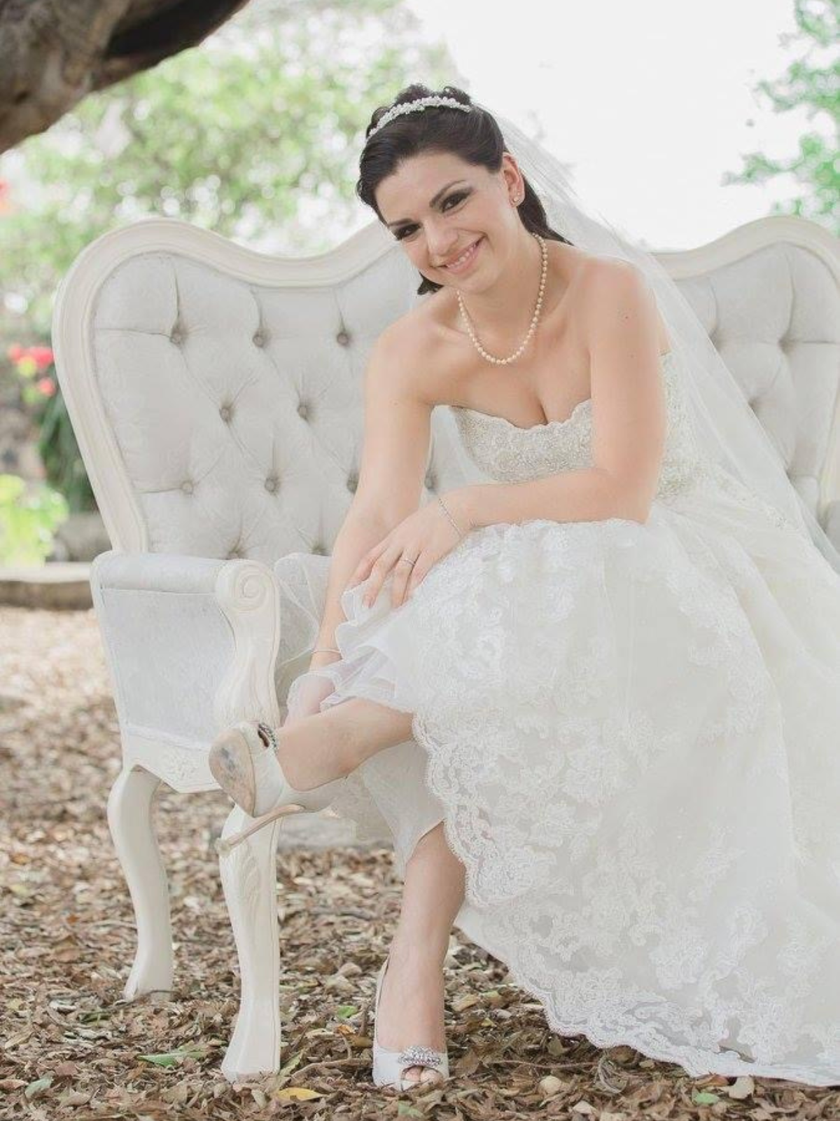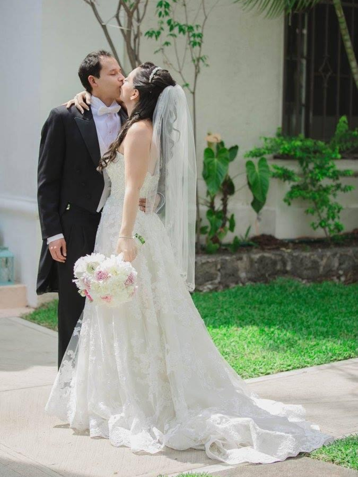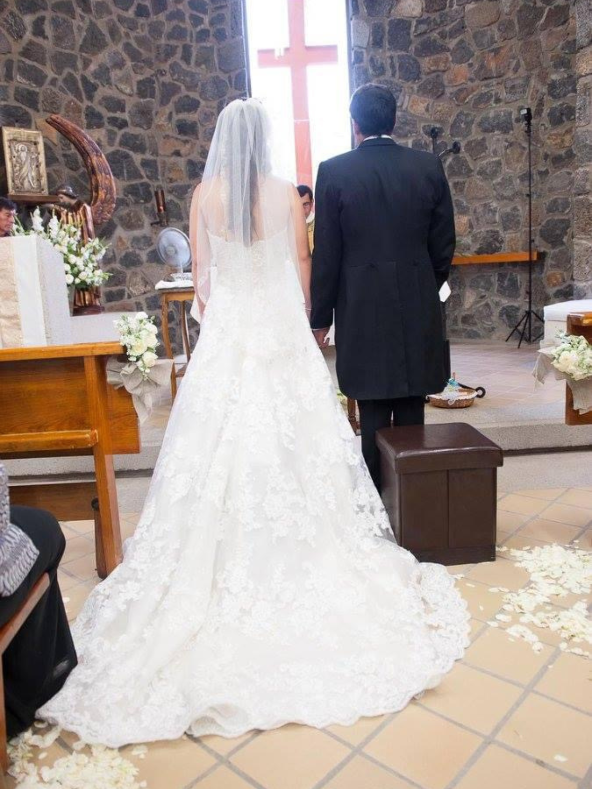 El vestido cuenta con un corset ajustado a una talla 4 con relleno en el busto que se puede retirar. El corset esta diseñado en pedreria y la cauda es de encaje. Tiene dos alteraciones para facilitar el dia de tu boda, unos brillantes muy sutiles qud sirve para levantar la cauda y una asa para cargarla suelta mientras bailas valz. El vestido solo se uso una vez y se envio a tintoreria especializada en vestidos de novia inmediatamente despues. No cuenta con ningun desperfecto en la pedreria o el encaje.