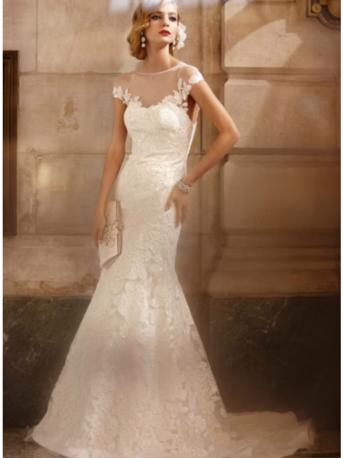 Vestido corte trompeta con transparencia en el pecho y espalda. Se cierra con botones en la espalda. Bordado con encaje y detalles de lentejuela muy sutiles.