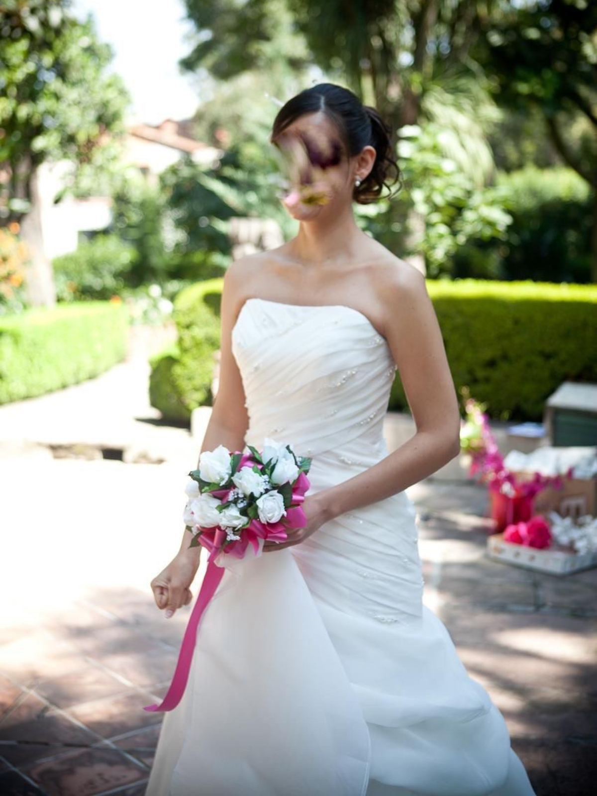 Vestido de novia del diseñador Eduardo Nieves. Corte sirena, strapless, amplio en la parte baja, drapeado en el torso y con decoraciones discretas de perla, chaquira y florecitas de tela. Usado una sola vez y está como nuevo. Tintorería profesional después del evento. Incluye accesorio de flor, chalina y tocado de flores para el cabello. Pruébatelo! A mí me enamoró desde el primer momento, seguro a ti también.
