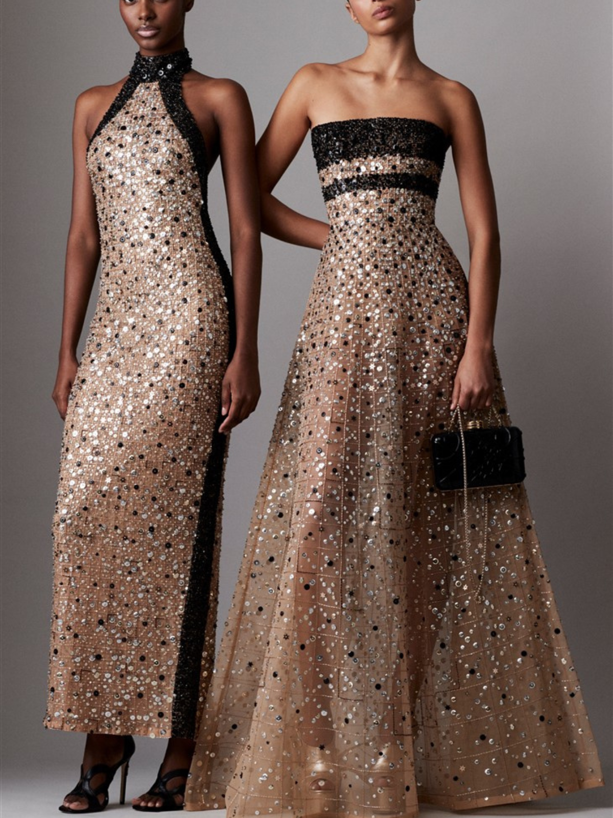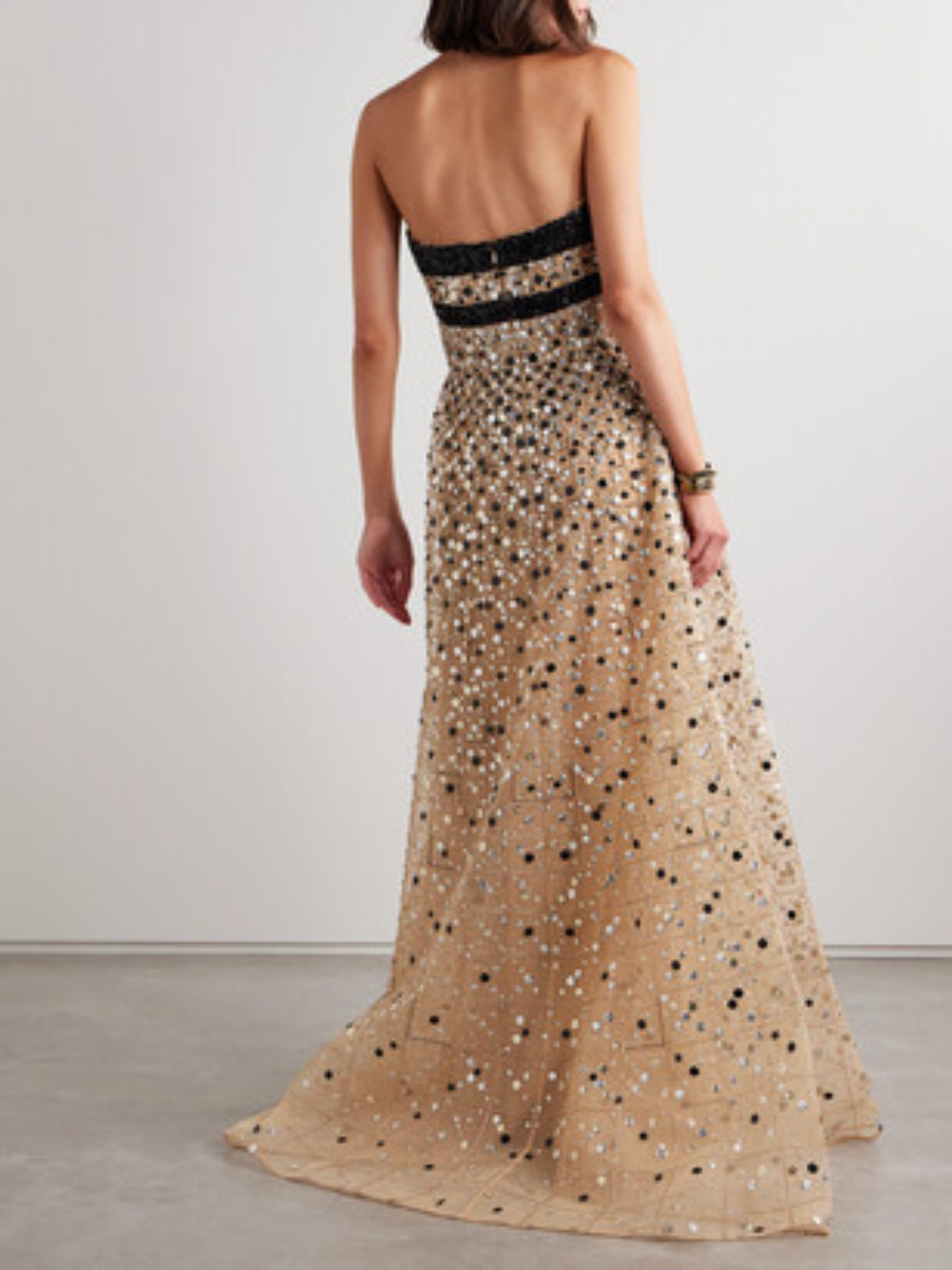 BORDADO EN DORADOS Y NEGRO, STRAPLESS, TULE