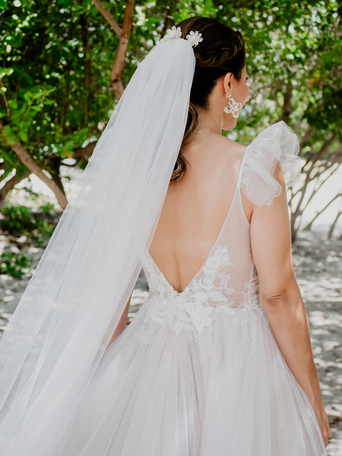 Vestido de novia corte A con tirantes delgados con detalles de tul en cada uno. Escote profundo en V en la parte de enfrente y espalda con escote en V amplia. Color ivory con fondo color nuede. La tela tiene flores bordadas con pedrería discreta y la tela brilla. 3 capas de tela en la falda. Tiene copas en la parte del busto. Puedo incluir el velo.