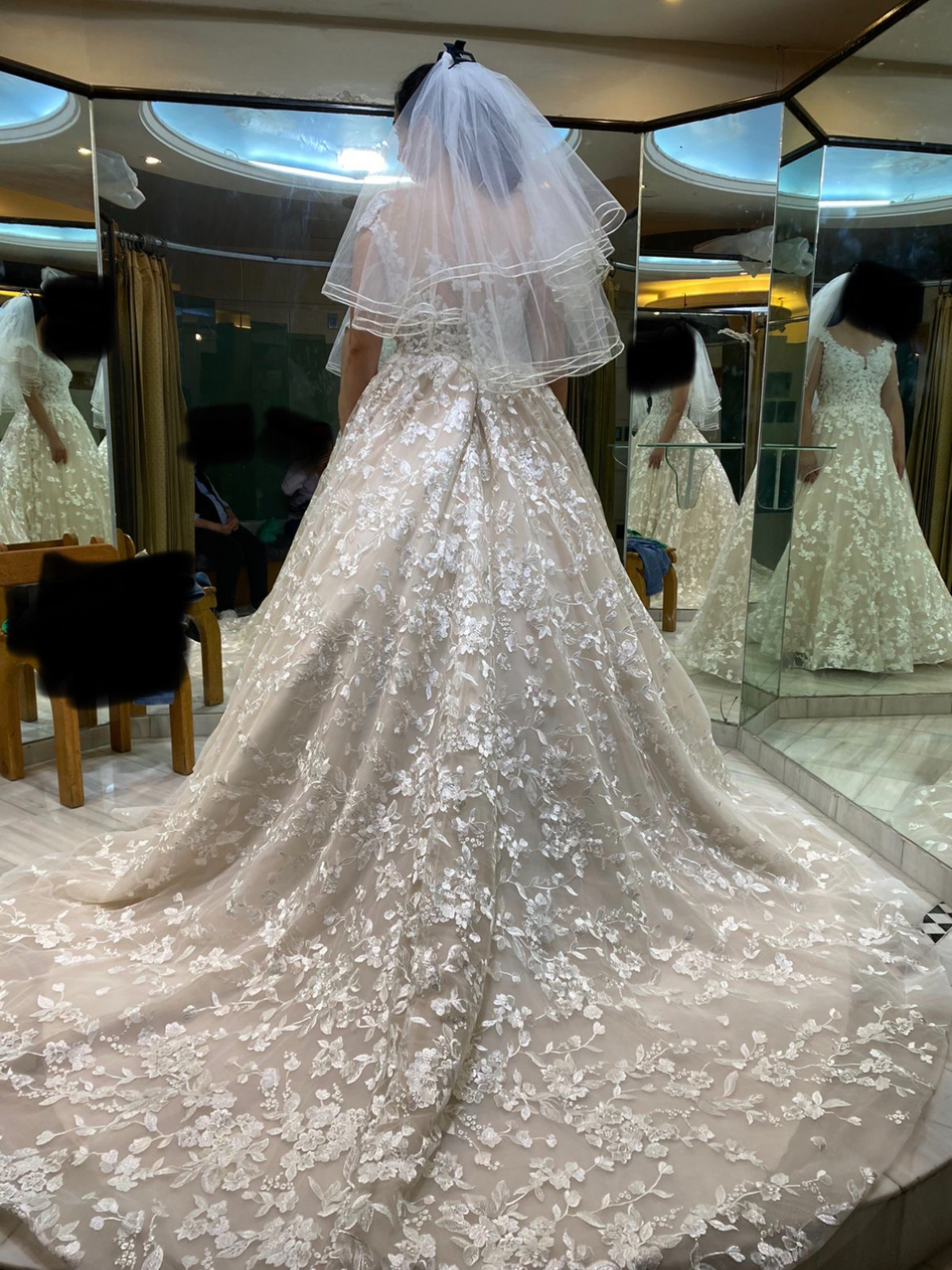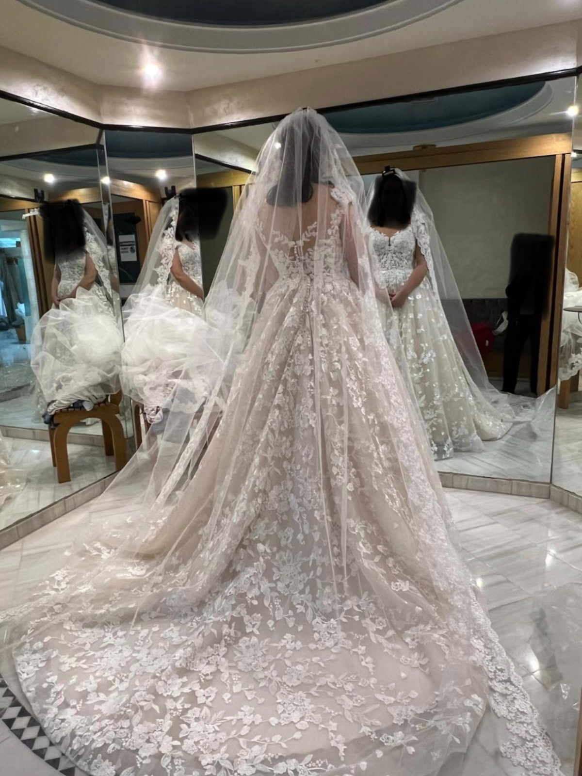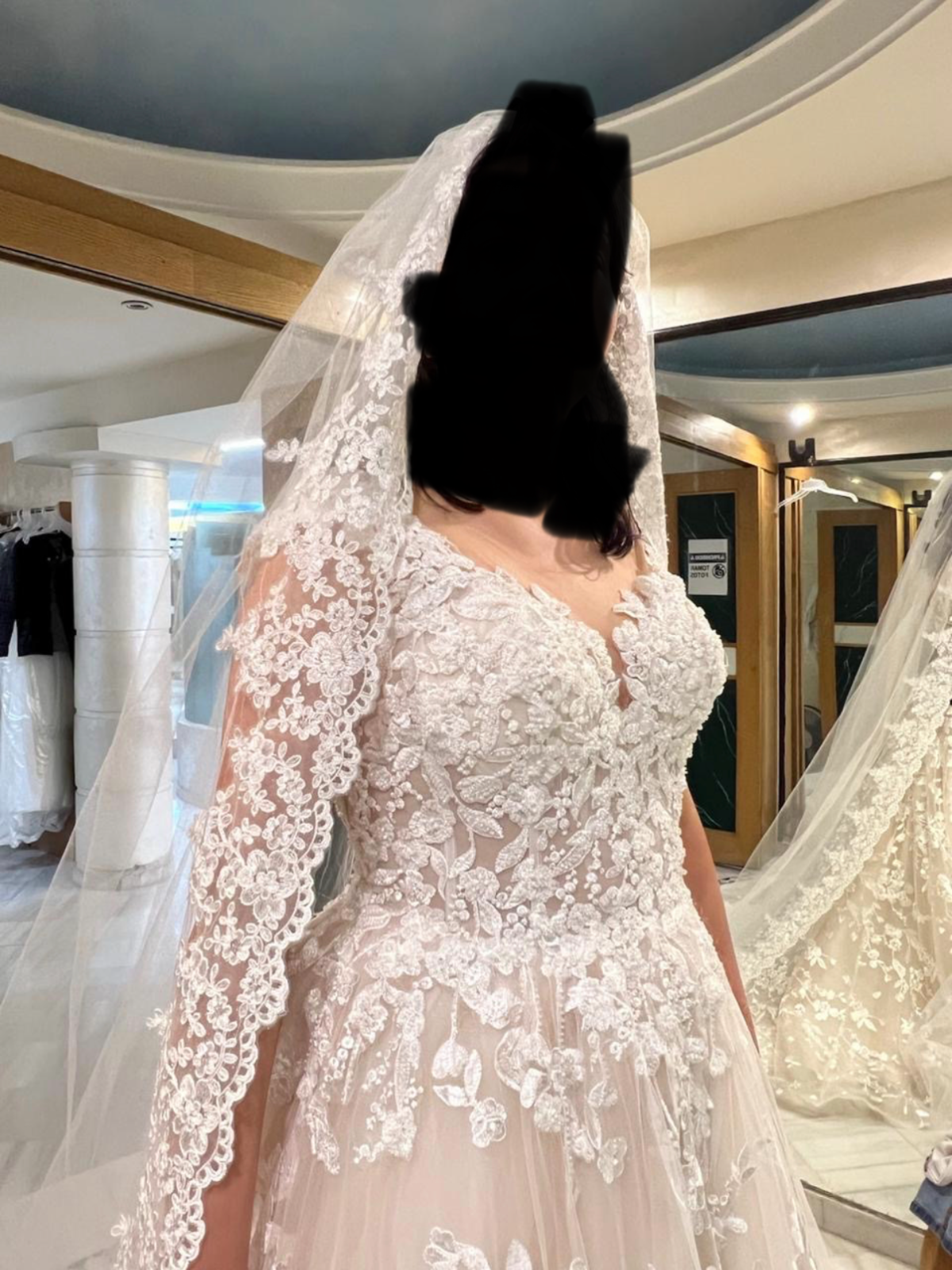El vestido incluye una crinolina sencilla, un velo corto y una mantilla de encaje, todos nuevos también. La nota de la tienda donde se adquirió el vestido incluye el pago de mangas por $1,500MXN, mismas que no se las pusieron, por lo que, esta cantidad se está restando del precio de la compra del vestido.
