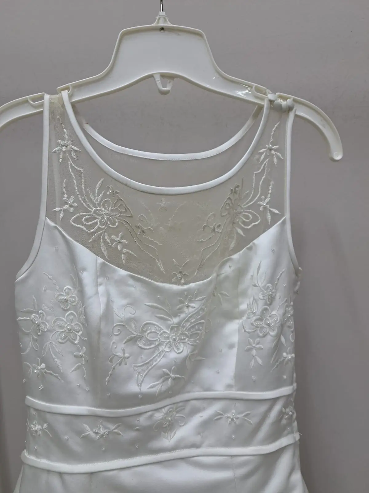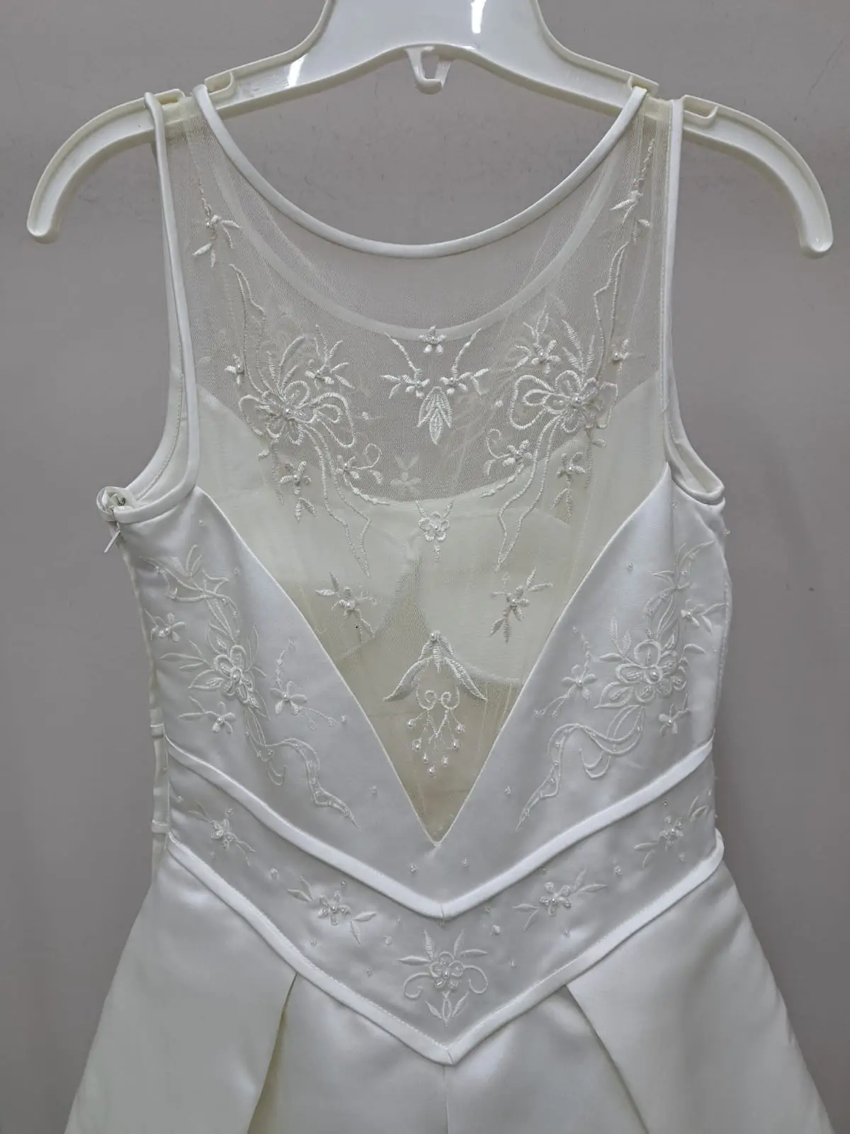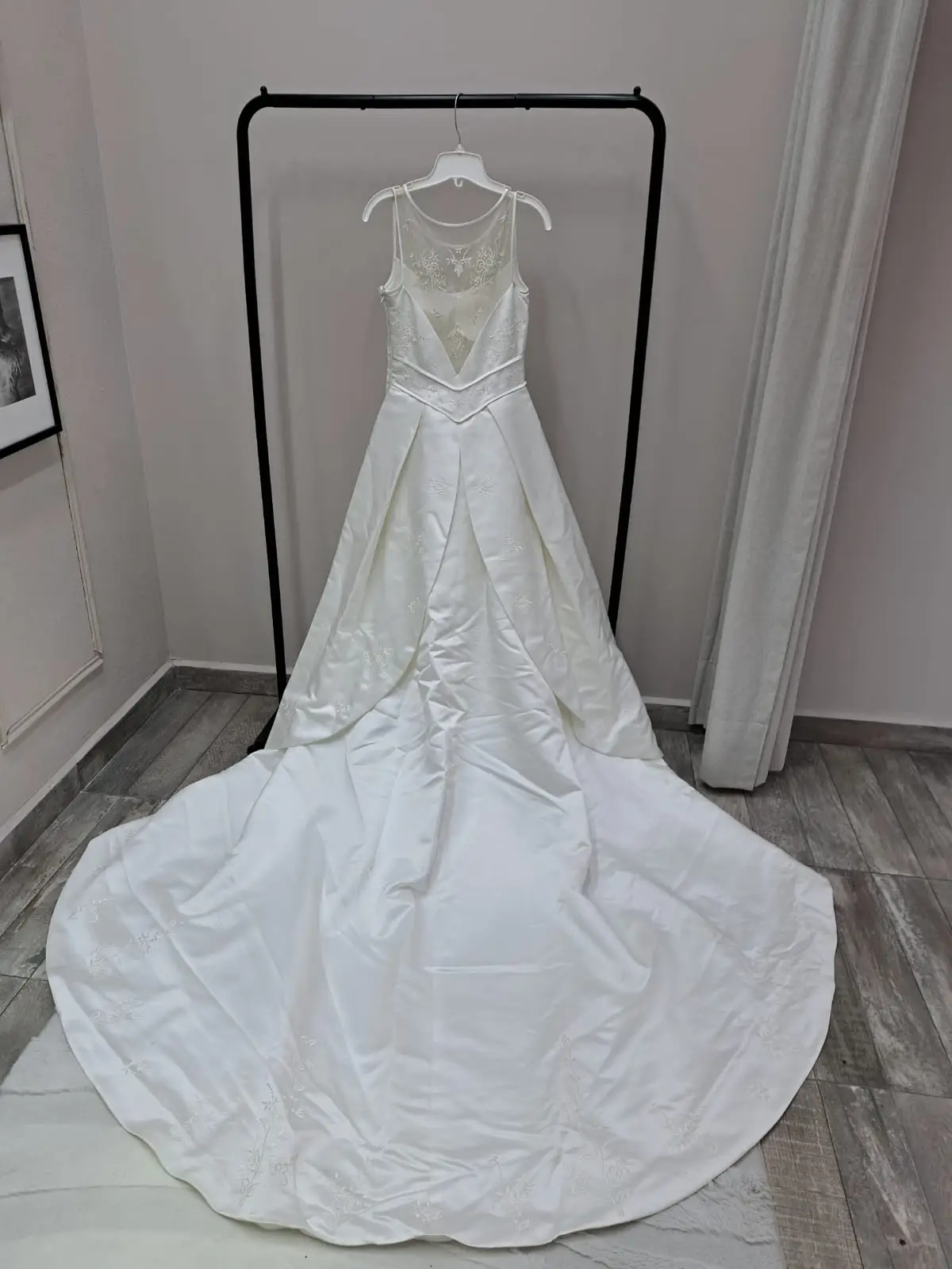 Vestido precioso con aplicaciones de flores y perlas, espalda en V de malla de tul. Con cauda larga.