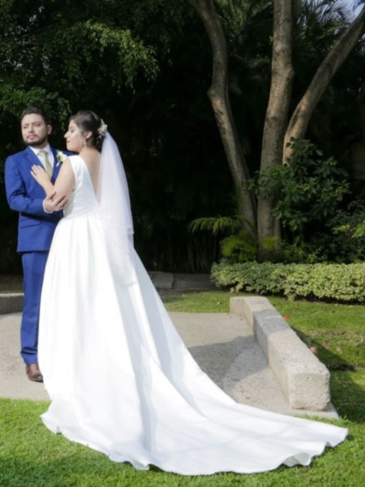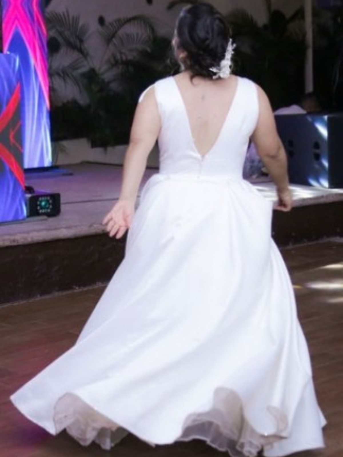 Sencillo y elegante vestido en corte A color Ivory en tela lisa y brillante con escote en V en frente, espalda y laterales, cuenta con cauda que se puede recoger Tiene bolsas en la falda, copas y cinturón con pedrería.
