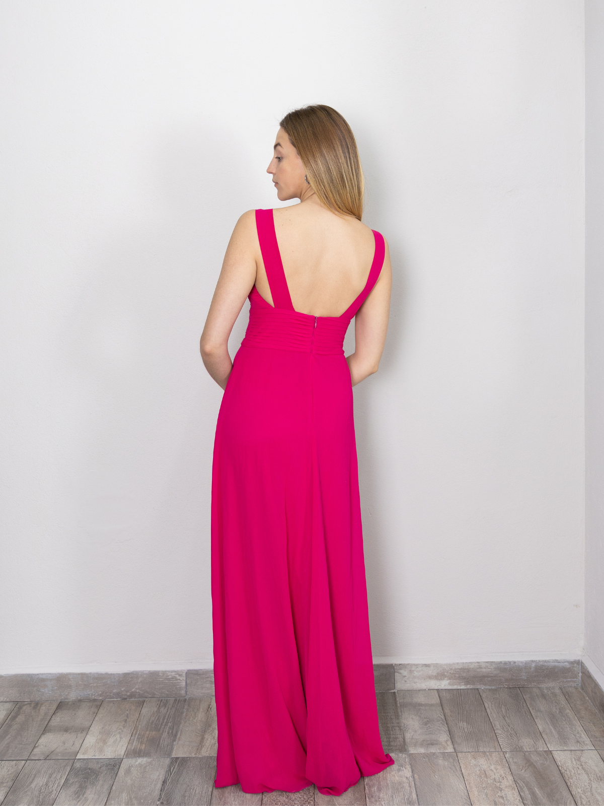 Vestido recto color fiucsa con corte en busto en V