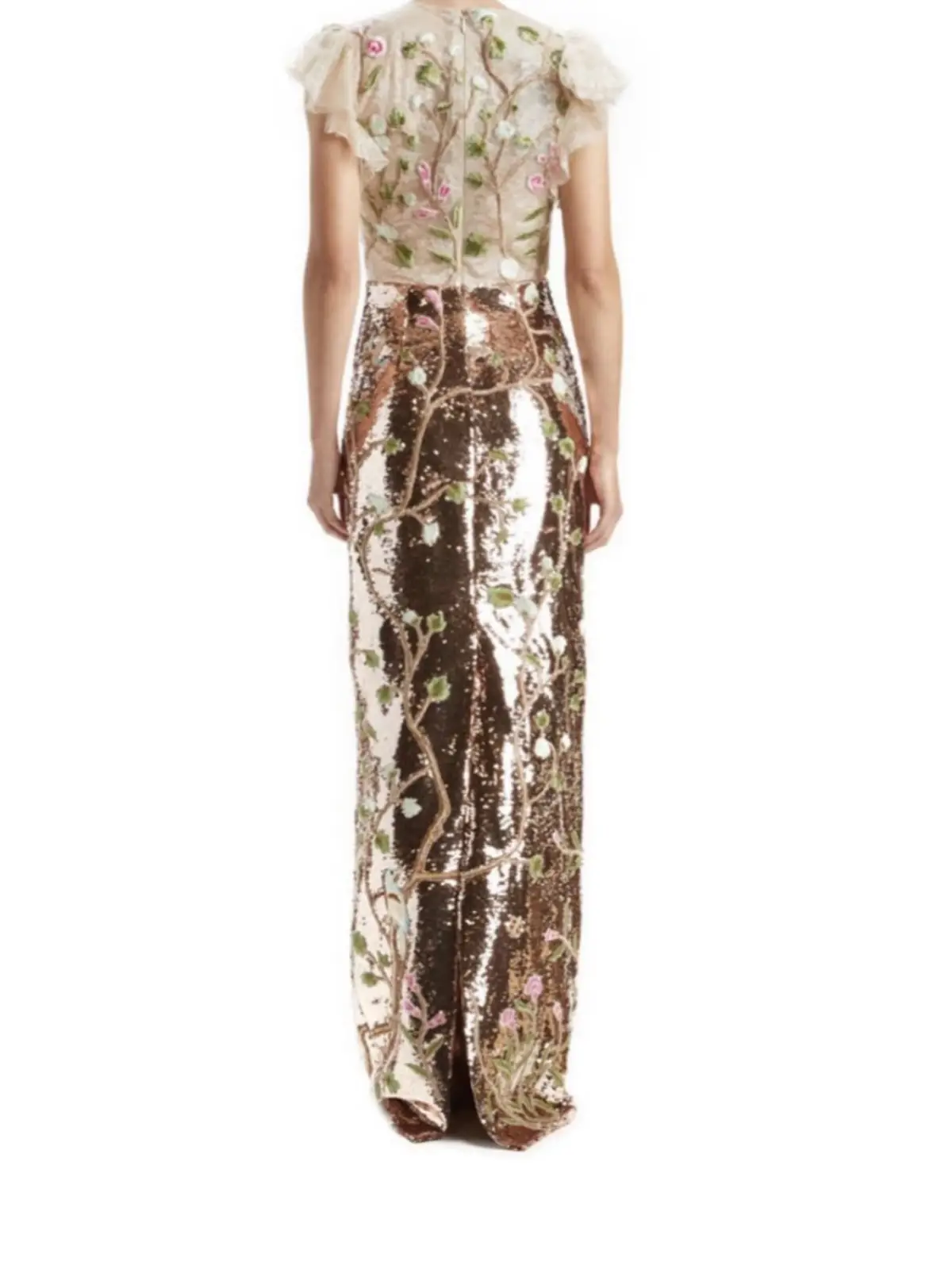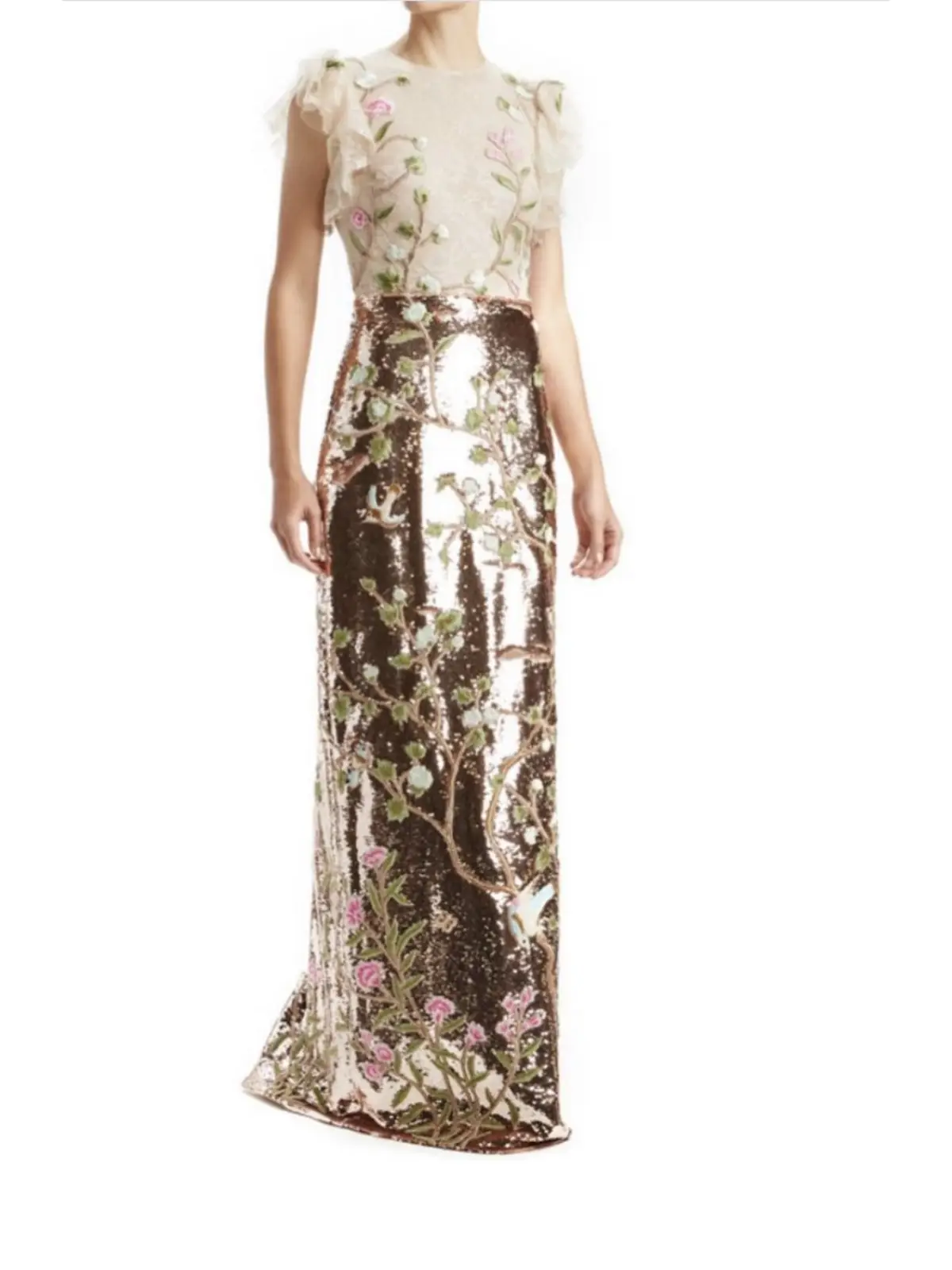 Vestido de encaje en la parte superior con aplicaciones bordadas y en la parte de la falda de lentejuela ros golf con aplicaciones bordados es hermoso muy fino .