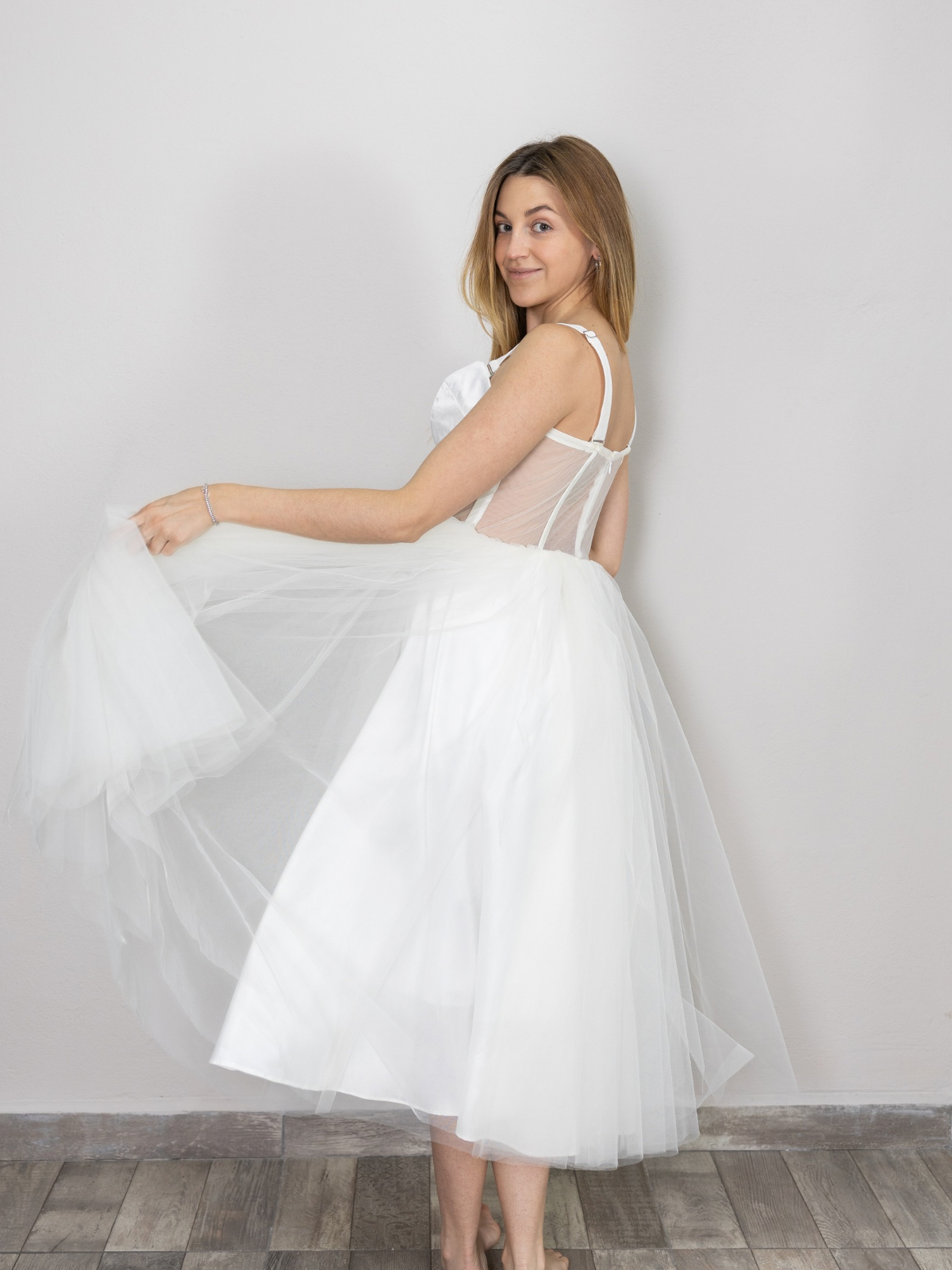 Diseño tipo corset con copas estructuradas y transparencias en tul, que estiliza y aporta un look moderno. La falda es de tul ligero y vaporoso con caída amplia en línea A, creando un efecto romántico y femenino. Perfecto para eventos especiales, civil o como segundo vestido de novia.