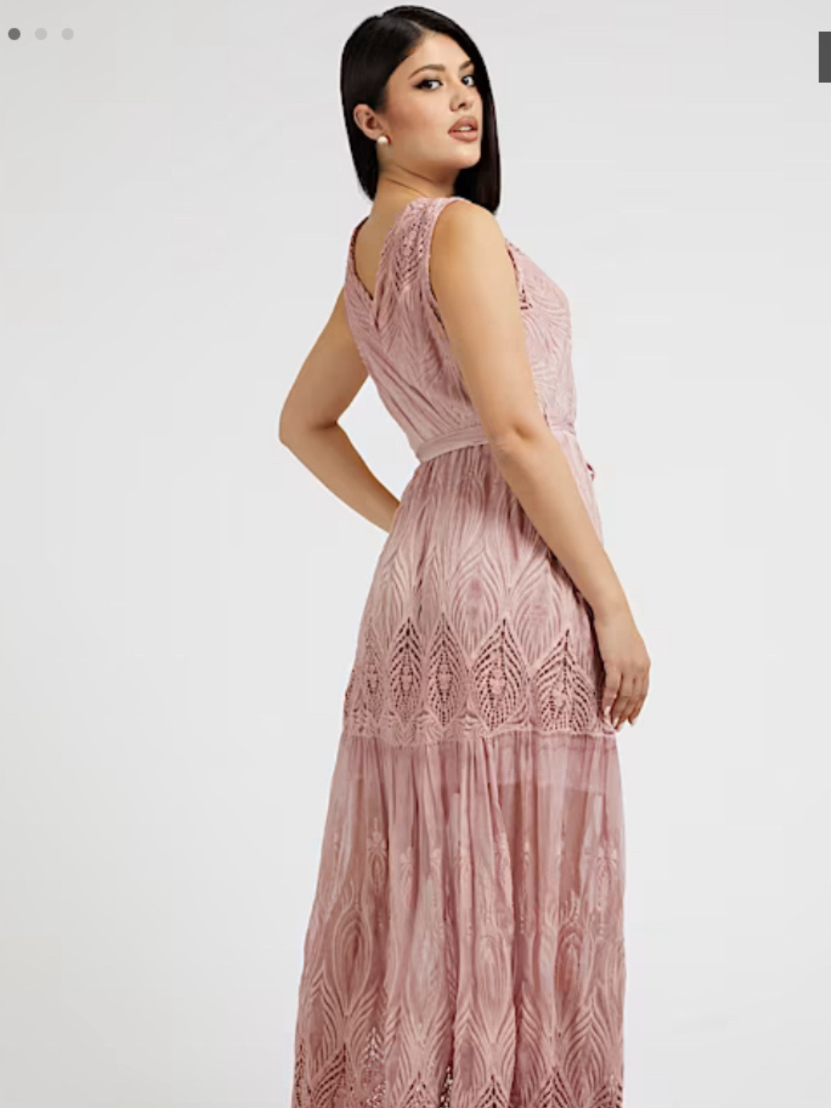 Vestido largo. Cuello y espalda en pico. Sin mangas. Estampado floral calado en los hombros, delante, detrás y en el bajo. Tiras anudables en la cintura. Frunces. Con etiqueta.
