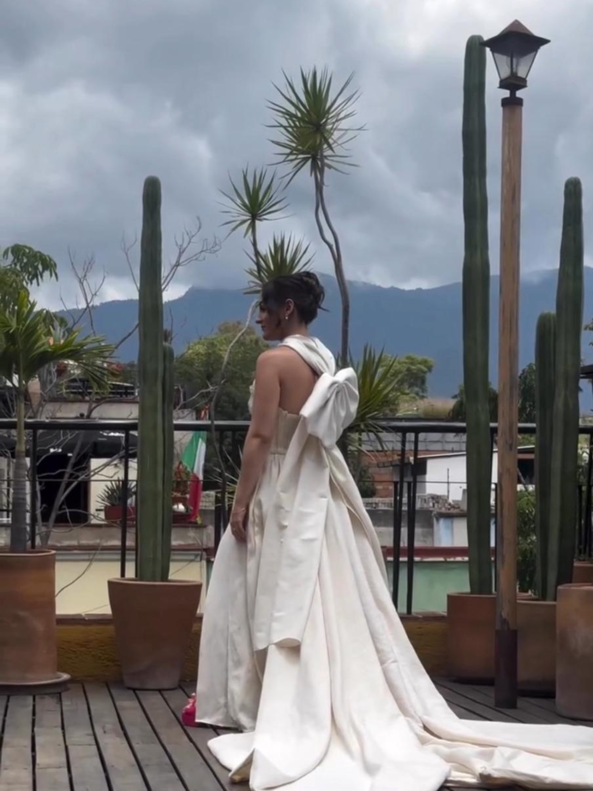 Es un diseño de Rara Avis y son 3 piezas: vestido con cauda larga, cinta para el cuello (u hombros) y moño que se puede quitar y poner en la cinta de cuello a la altura que gustes.