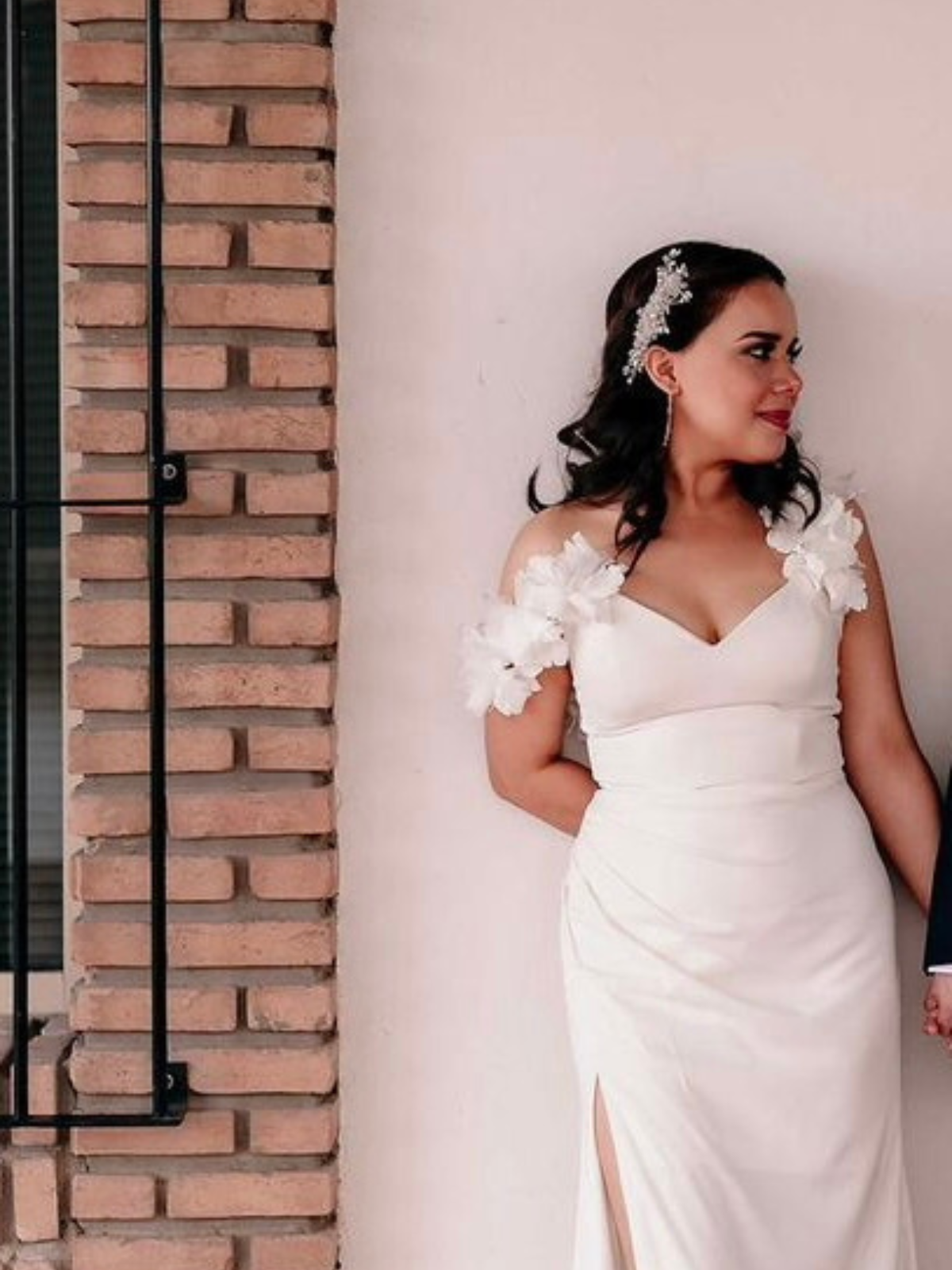 Silueta de sirena, con escote en V y adornado con un elegante lazo de flores con una textura sutil hace de él un vestido único para una boda moderna y chic.