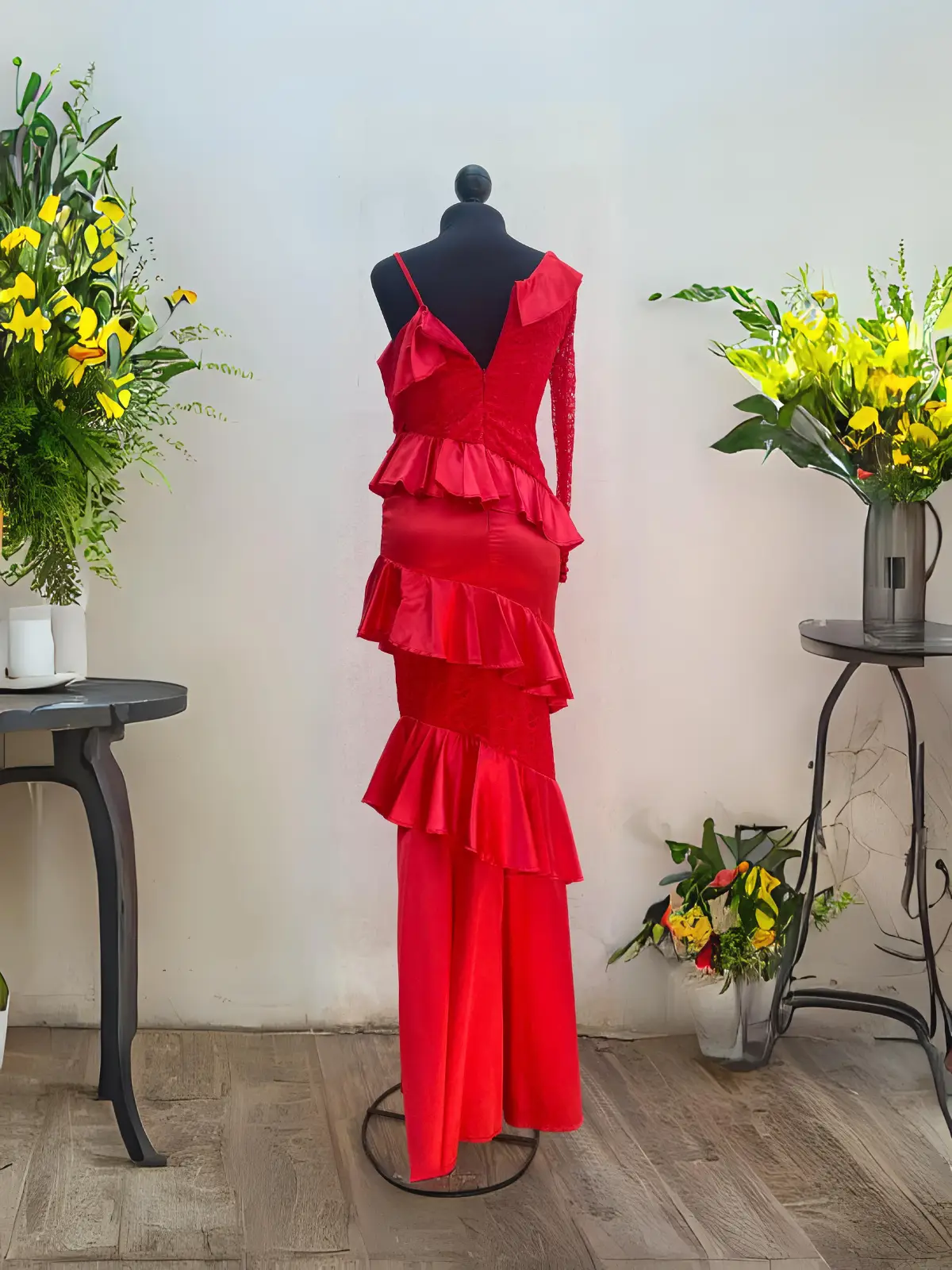 Vestido rojo de silueta recta. Con escote en “V” adornado con escarolas, la manga izquierda de tirante y la manga derecha larga de encaje. El resto del vestido también presenta encaje y escarolas. ¡Perfecto para ocasiones especiales y deslumbrar con estilo!