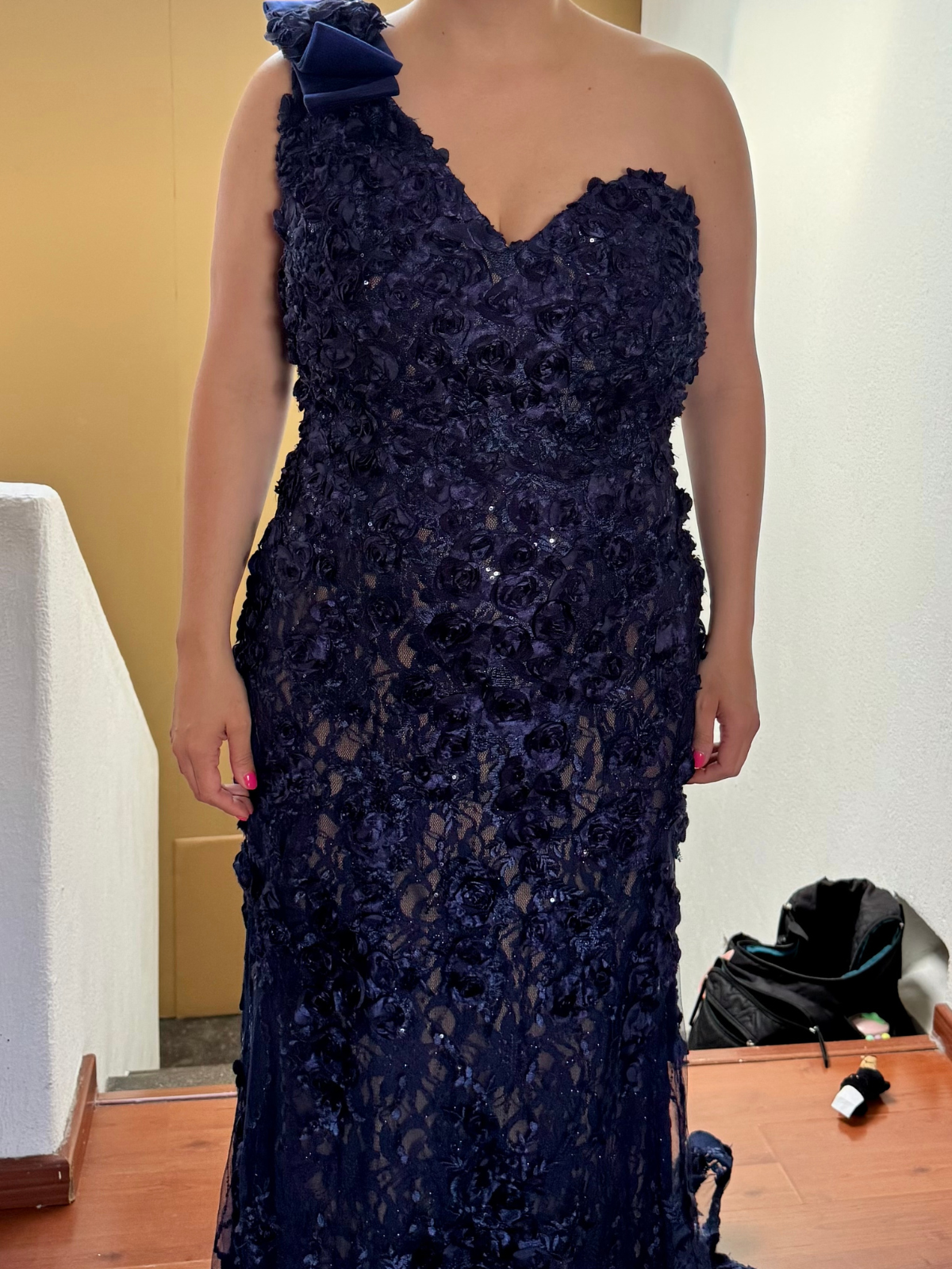 Vestido color azul marino, marca jovani, de un hombro con moño, fondo beige y tela bordada de flores azul con algo de lentejuelas.