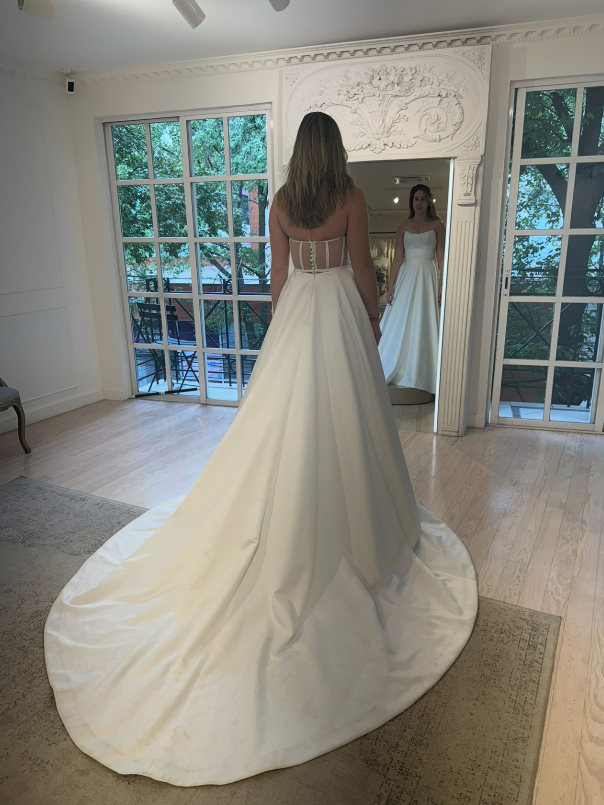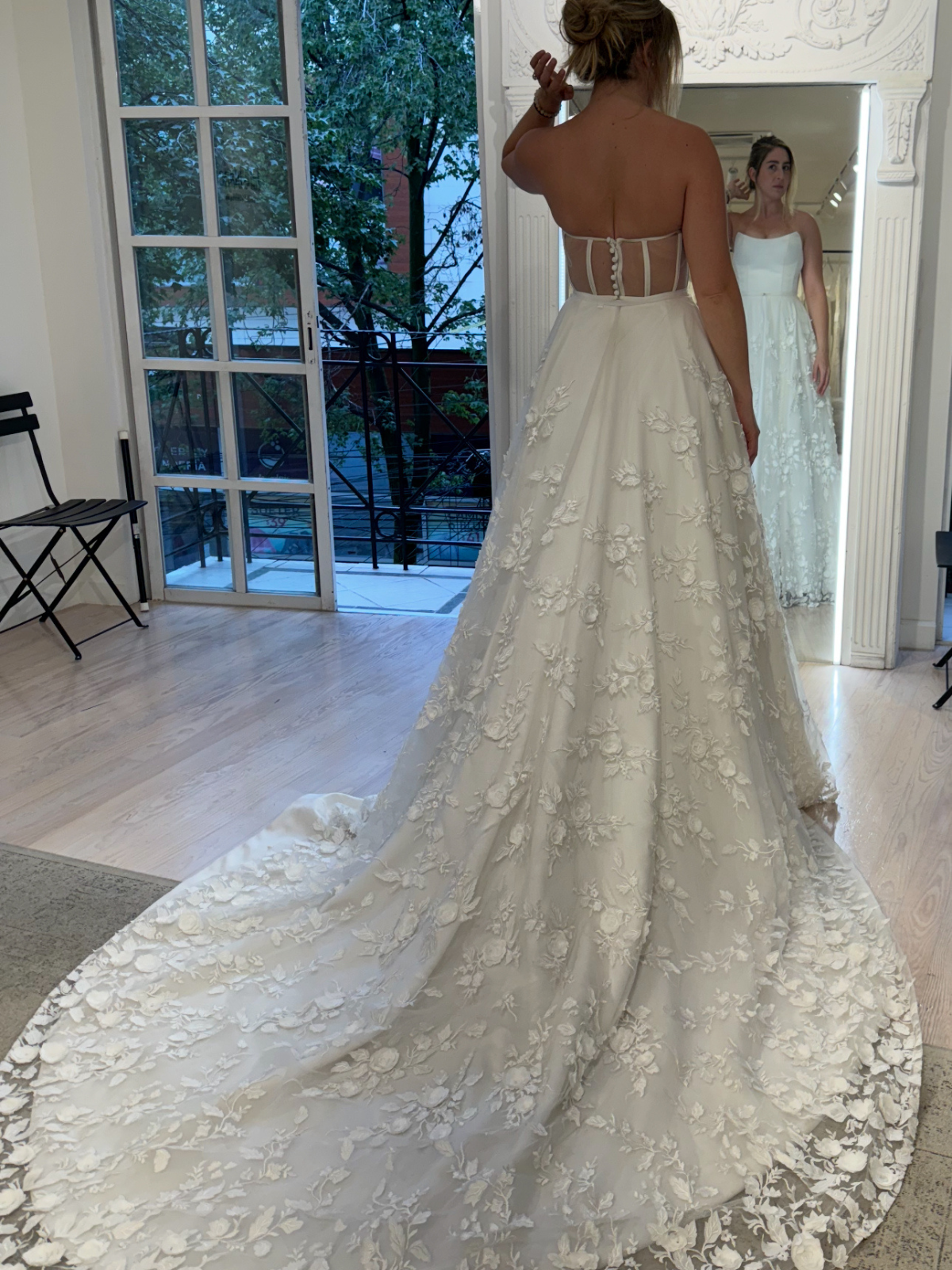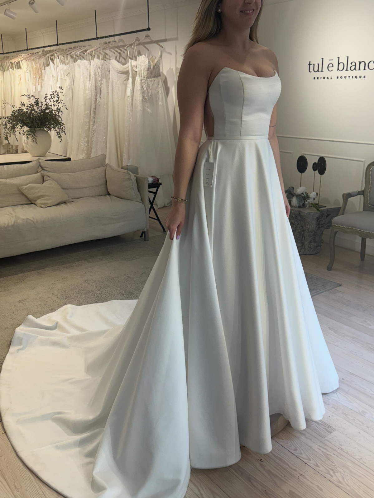 El vestido más original y hermoso con la espalda abierta y la sobrefalda que se puede quitar y poner para la ceremonia, no existe otro igual.