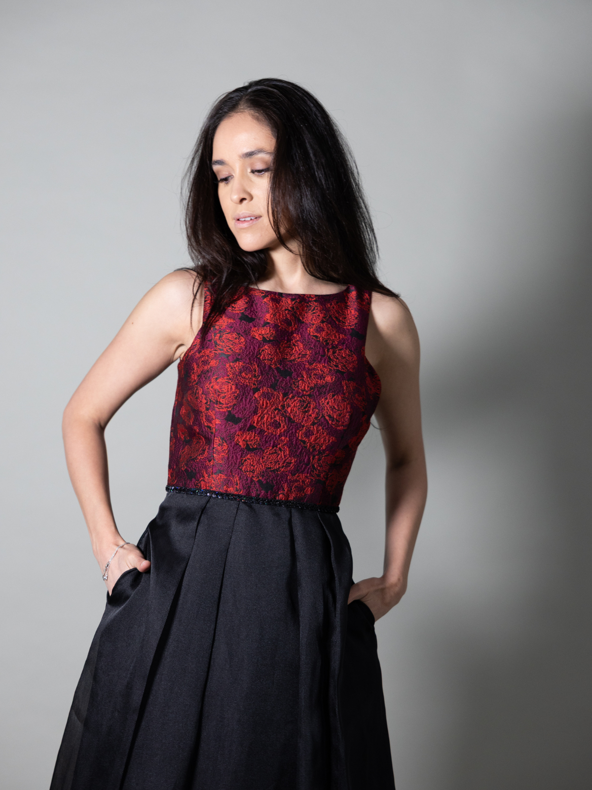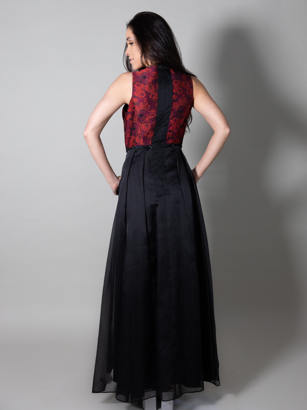 Vestido formal de noche, color negro con vino en perfectas condiciones.