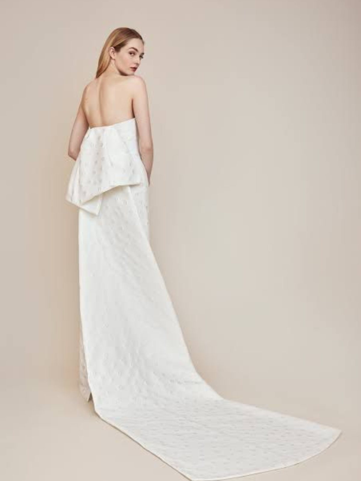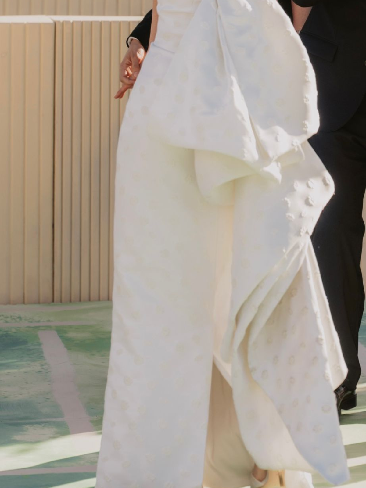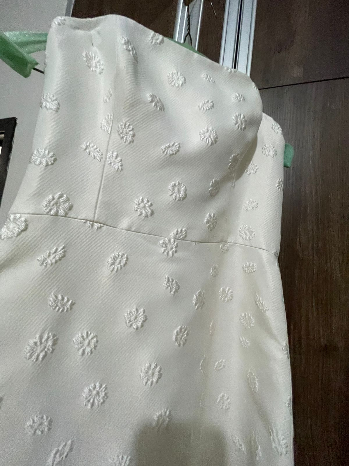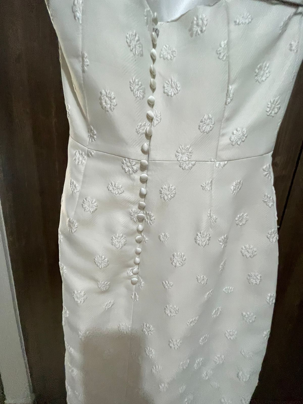 Vestido súper cómodo, con moño y cola desmontables, es de una tela con textura y con costuras muy elegantes, tiene un fit perfecto. En excelentes condiciones. Se agrega velo gratis.