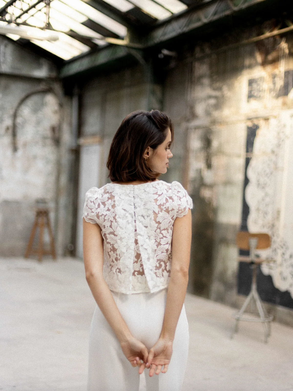 Conjunto para boda civil compuesto por una falda larga de corte recto, elegante y atemporal, con una delicada abertura frontal adornada con botones forrados. Se complementa con un top de encaje, con manga corta y una elegante abertura en la espalda, que aporta un toque romántico y sofisticado.