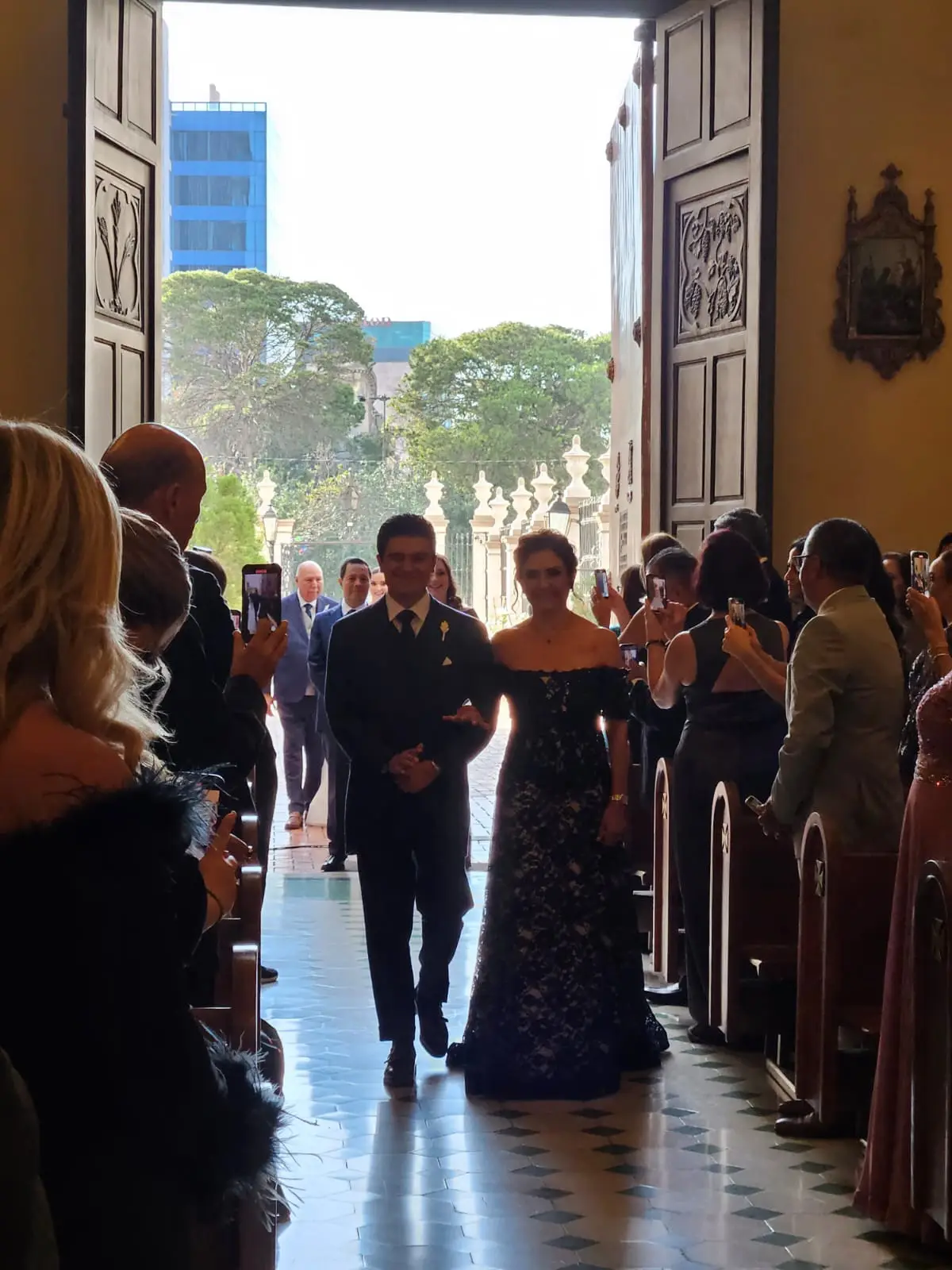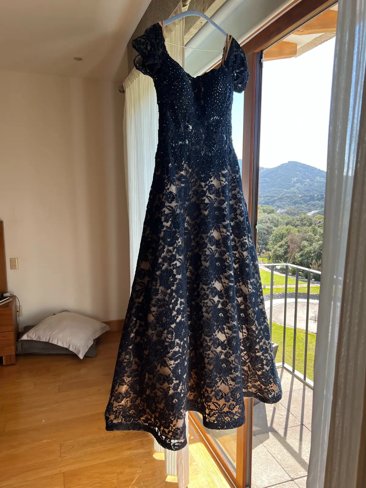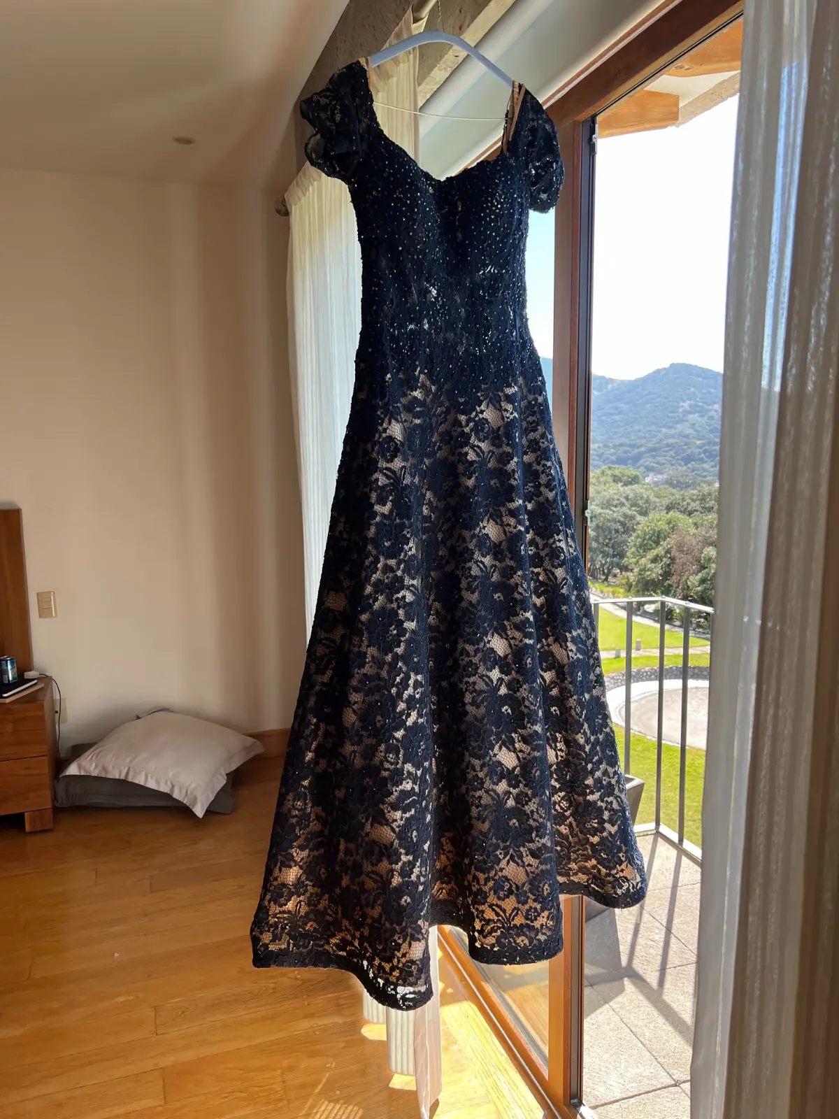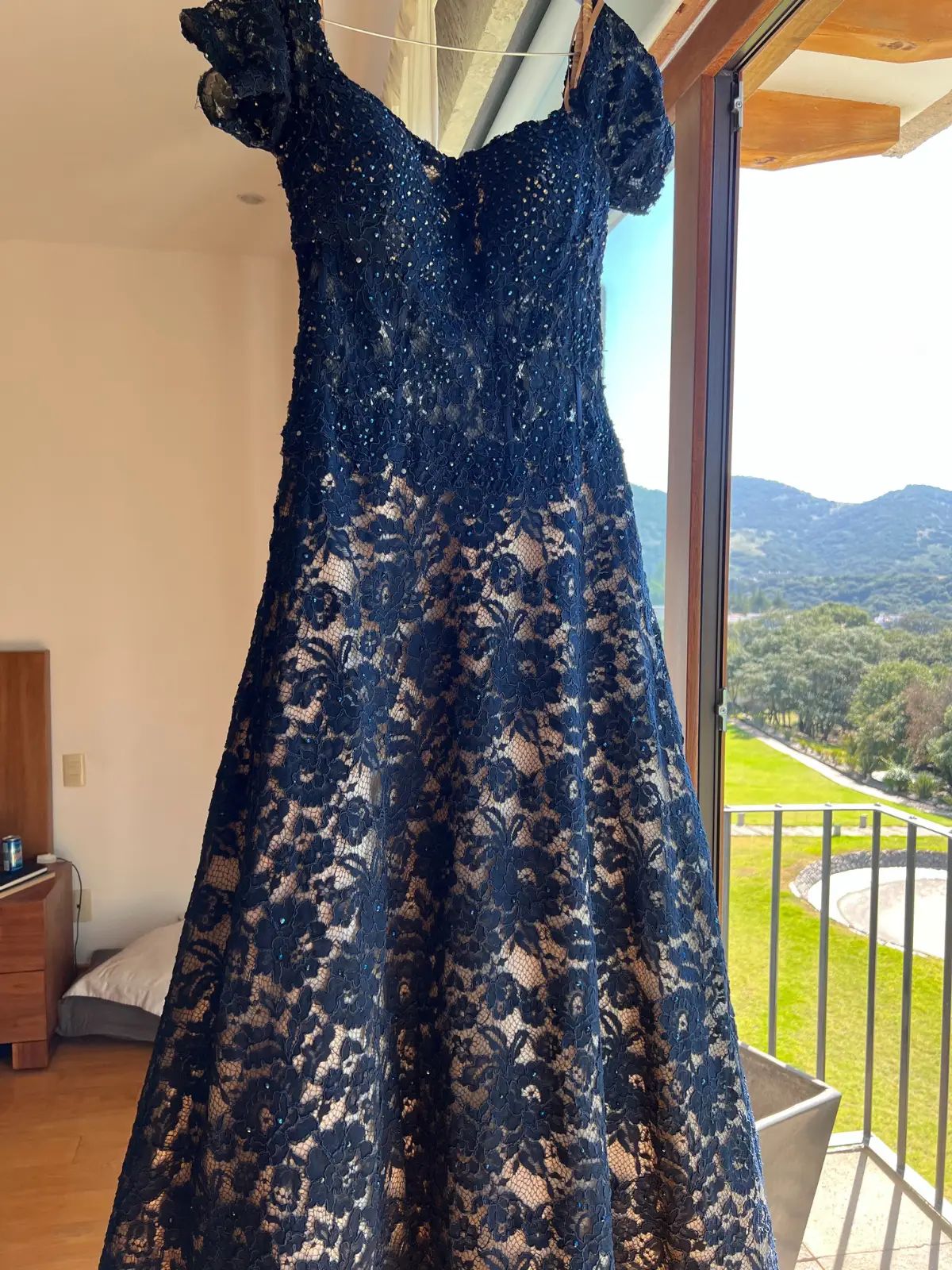 Es un vestido de encaje con pocas lentejuelas opacas . Forro beige con el encaje azul marino