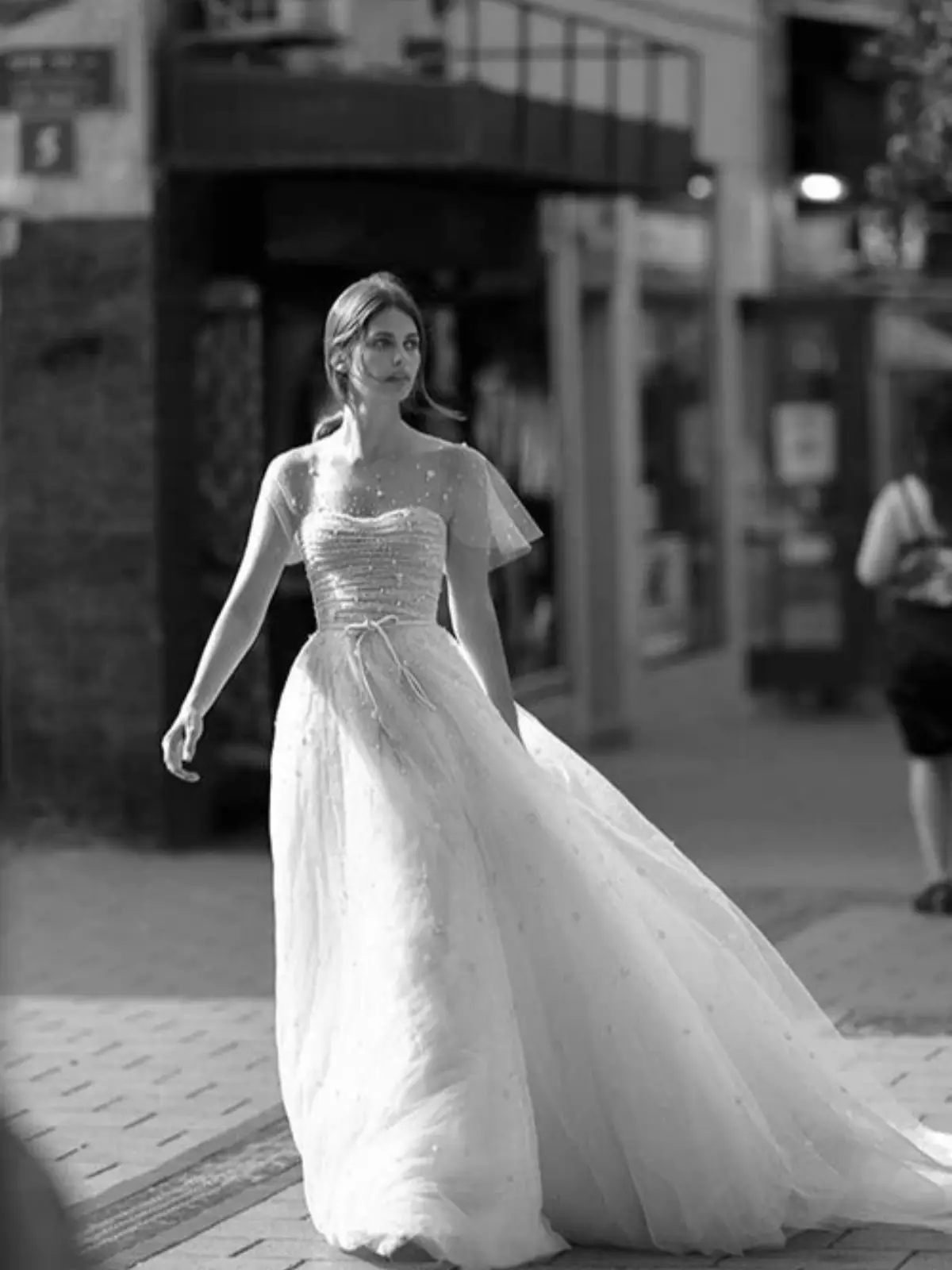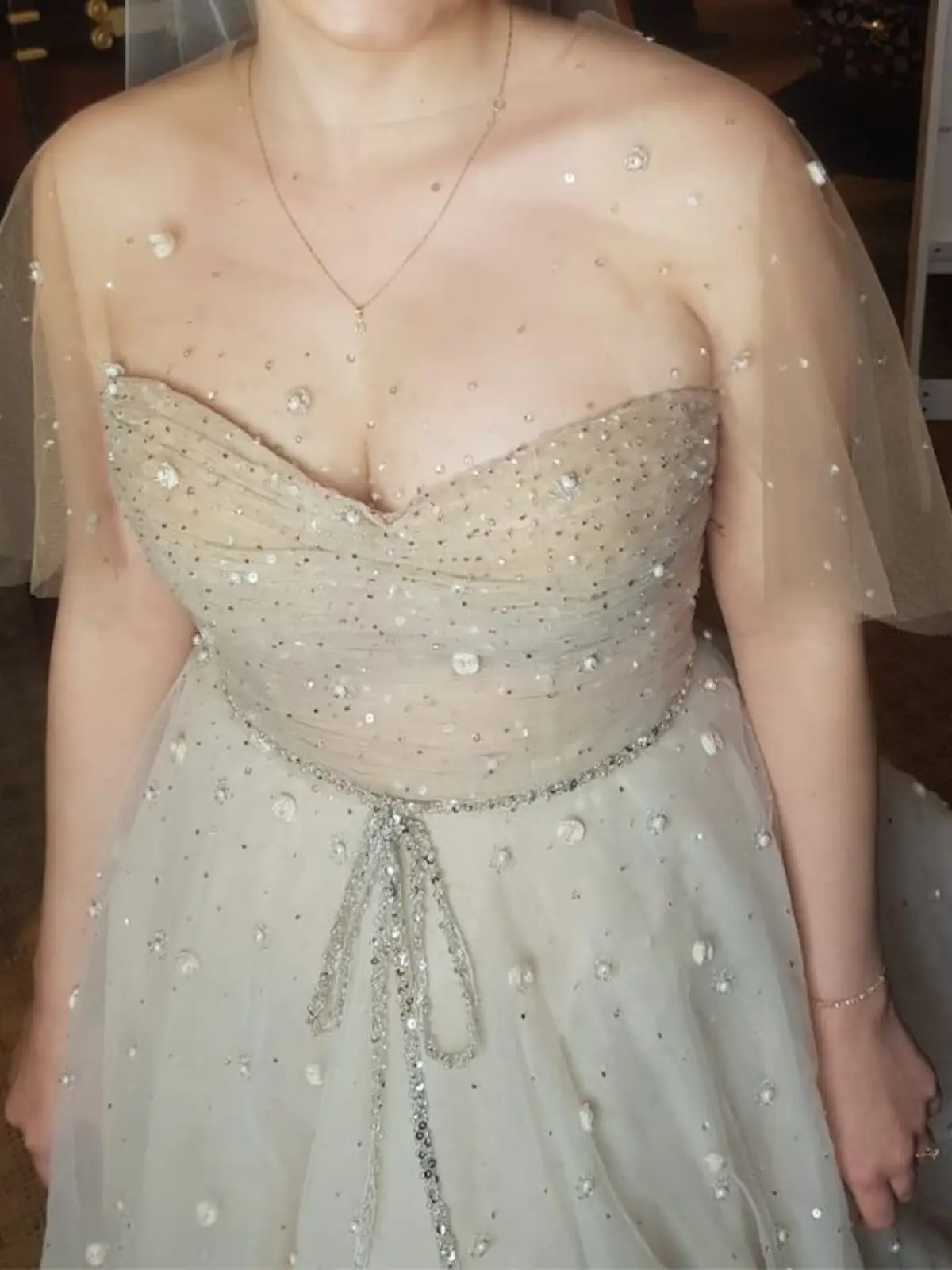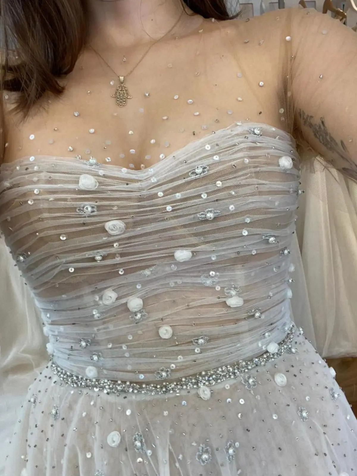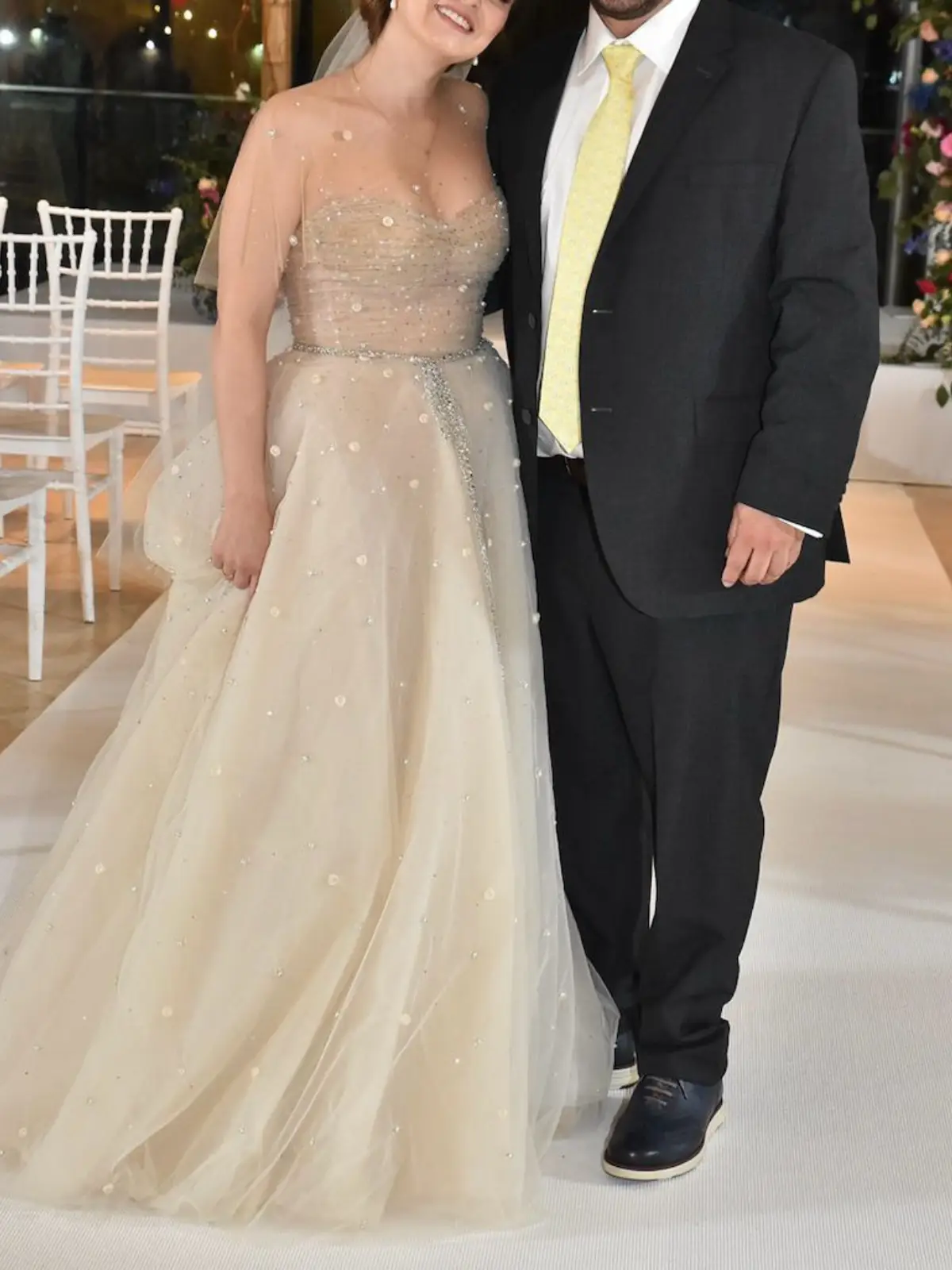 Vestido de novia, modelo Adika de la diseñadora Liz Martinez. Corte de princesa, tul color nude con hermosos detalles en el escote y en mangas invisibles. Se utilizó en diciembre de 2021, por 5 horas.