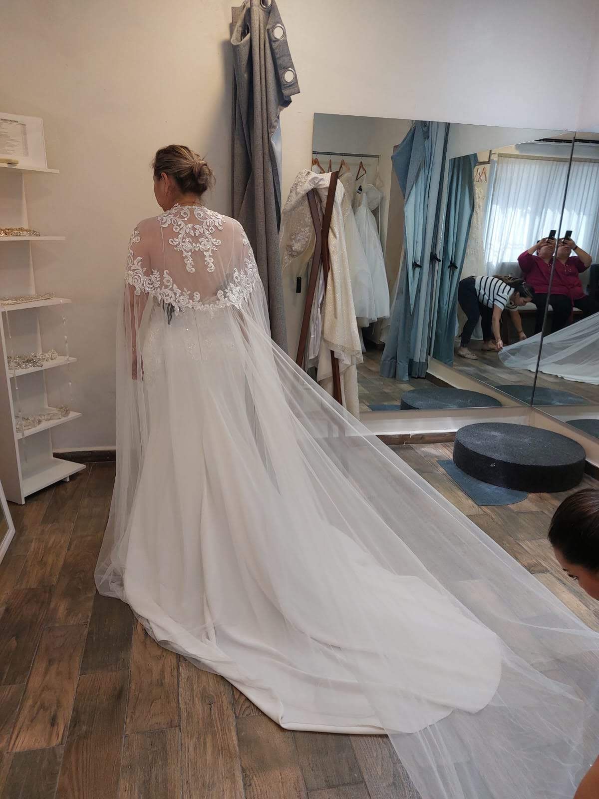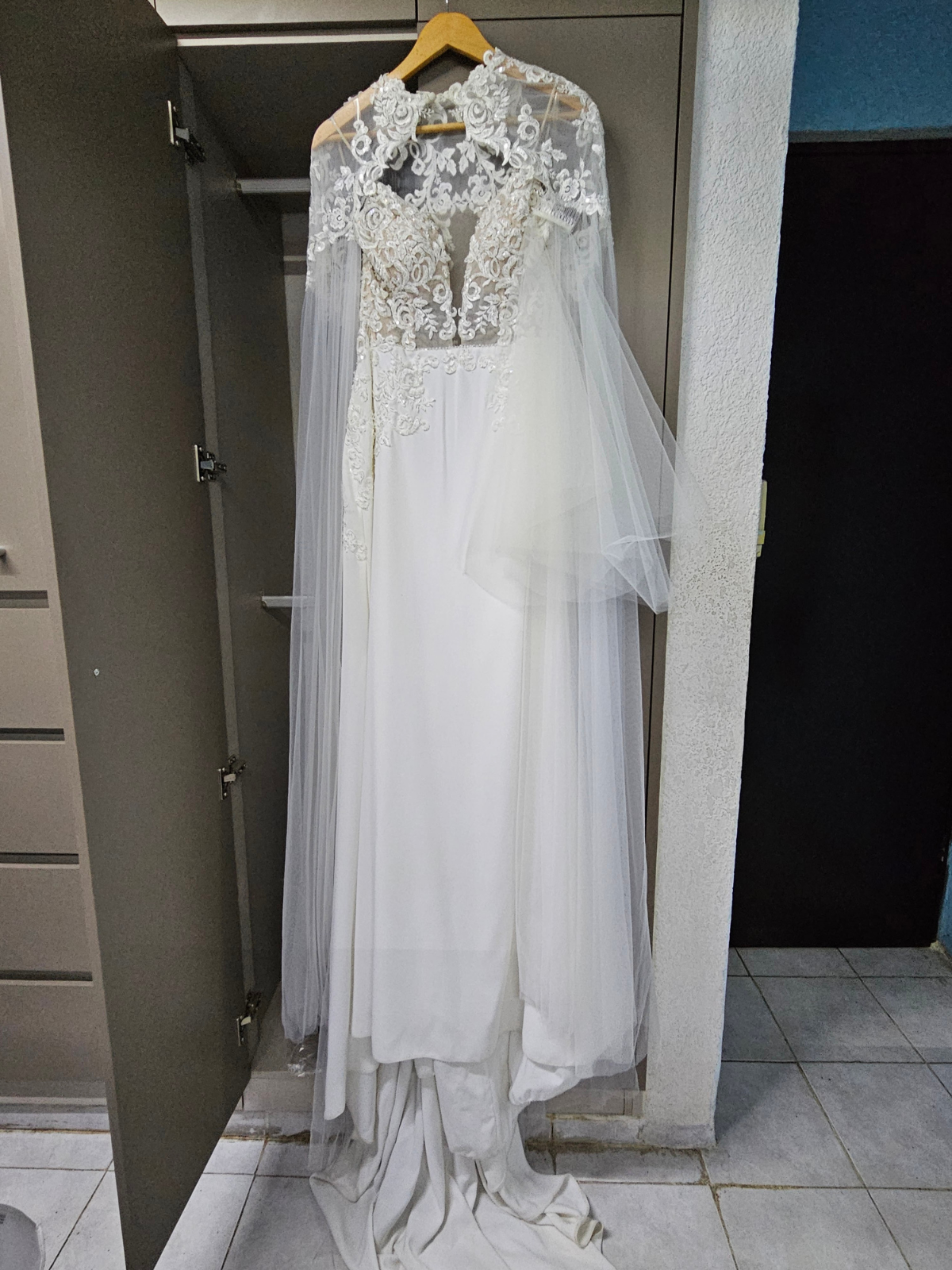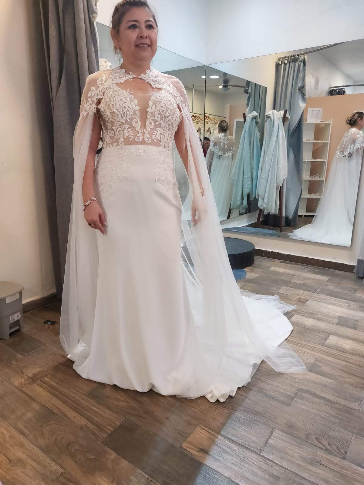 Tiene una capa que se retira, y la cola sale del largo del vestido, un escote hasta la cintura qué se ve sexy y elegante al retirar la capa de tul, viene acompañado de un velo corto.