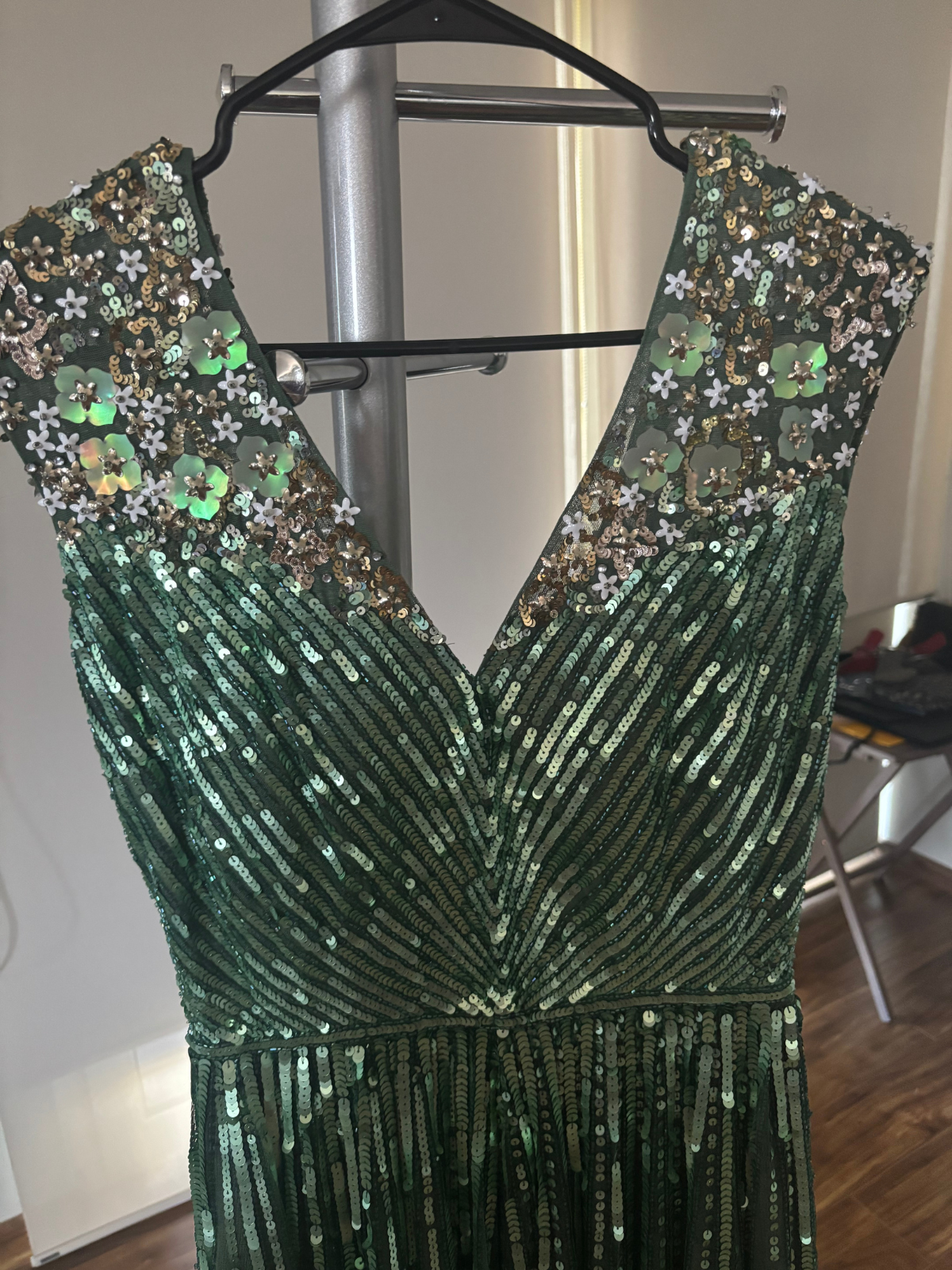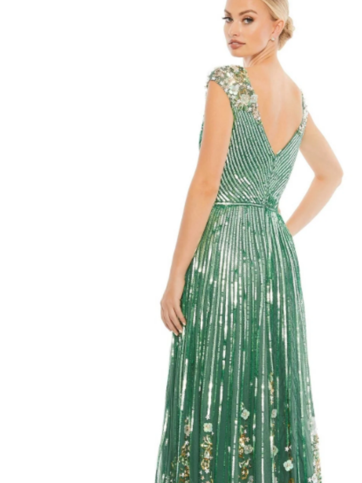 El vestido es el modelo 5223 de la marca Mac Duggal de corte A tiene una capa de red adornada con lentejuelas y hermosas aplicaciones florales, escote en V en el frente y en espalda, mangas cortas. Es talla 8 tuvo un ajuste en la cintura de unos 2 cms. Esta bellisimo el vestido y esta en condicion impecable.