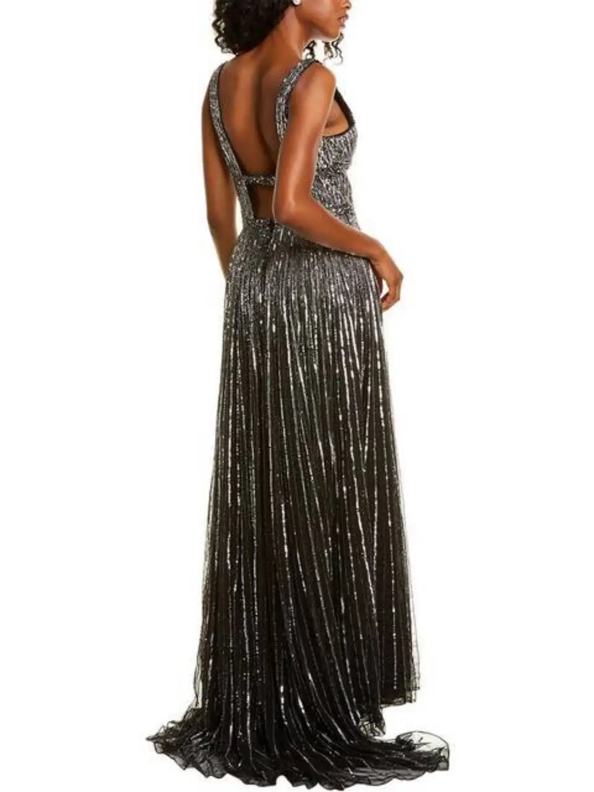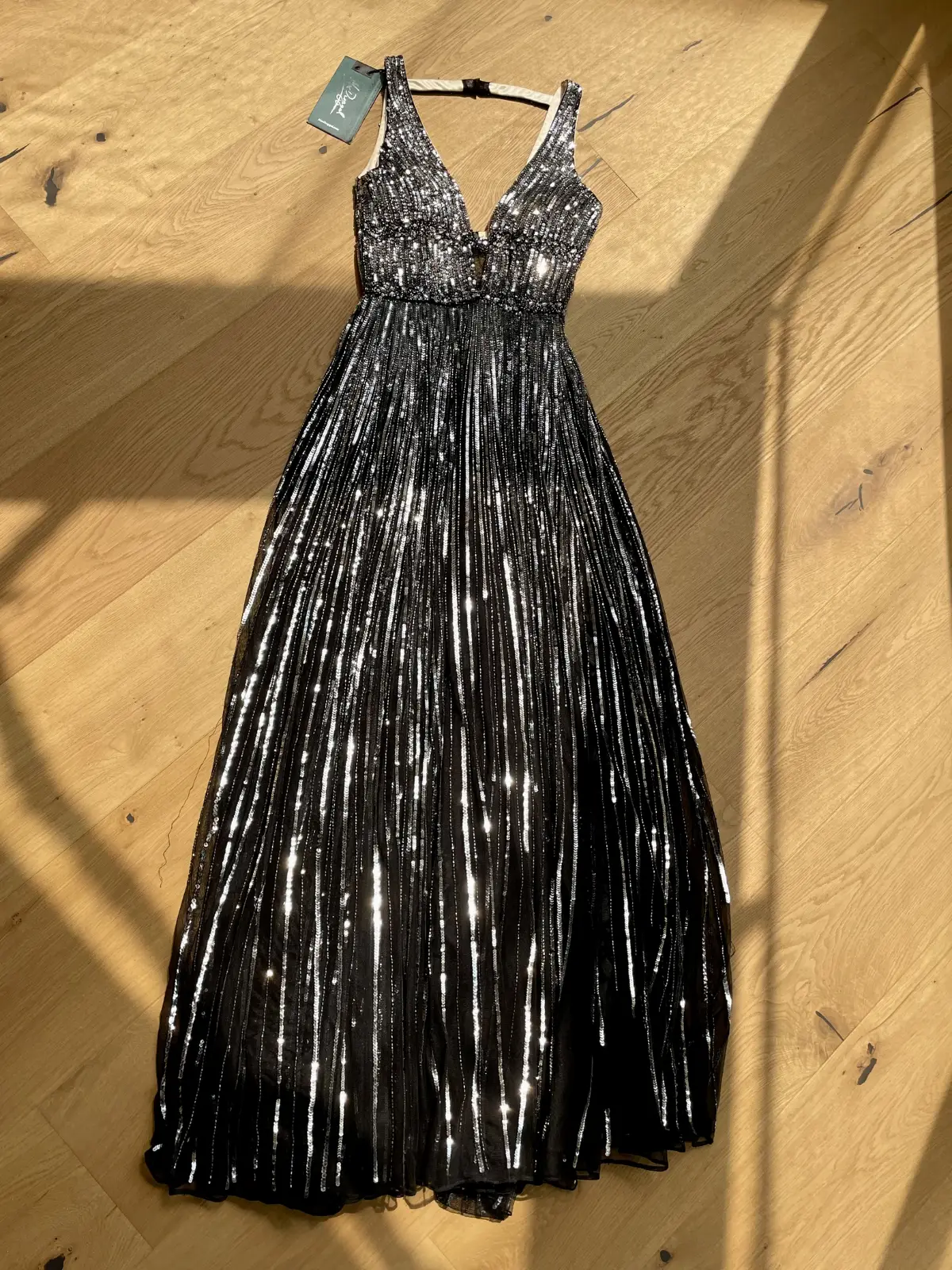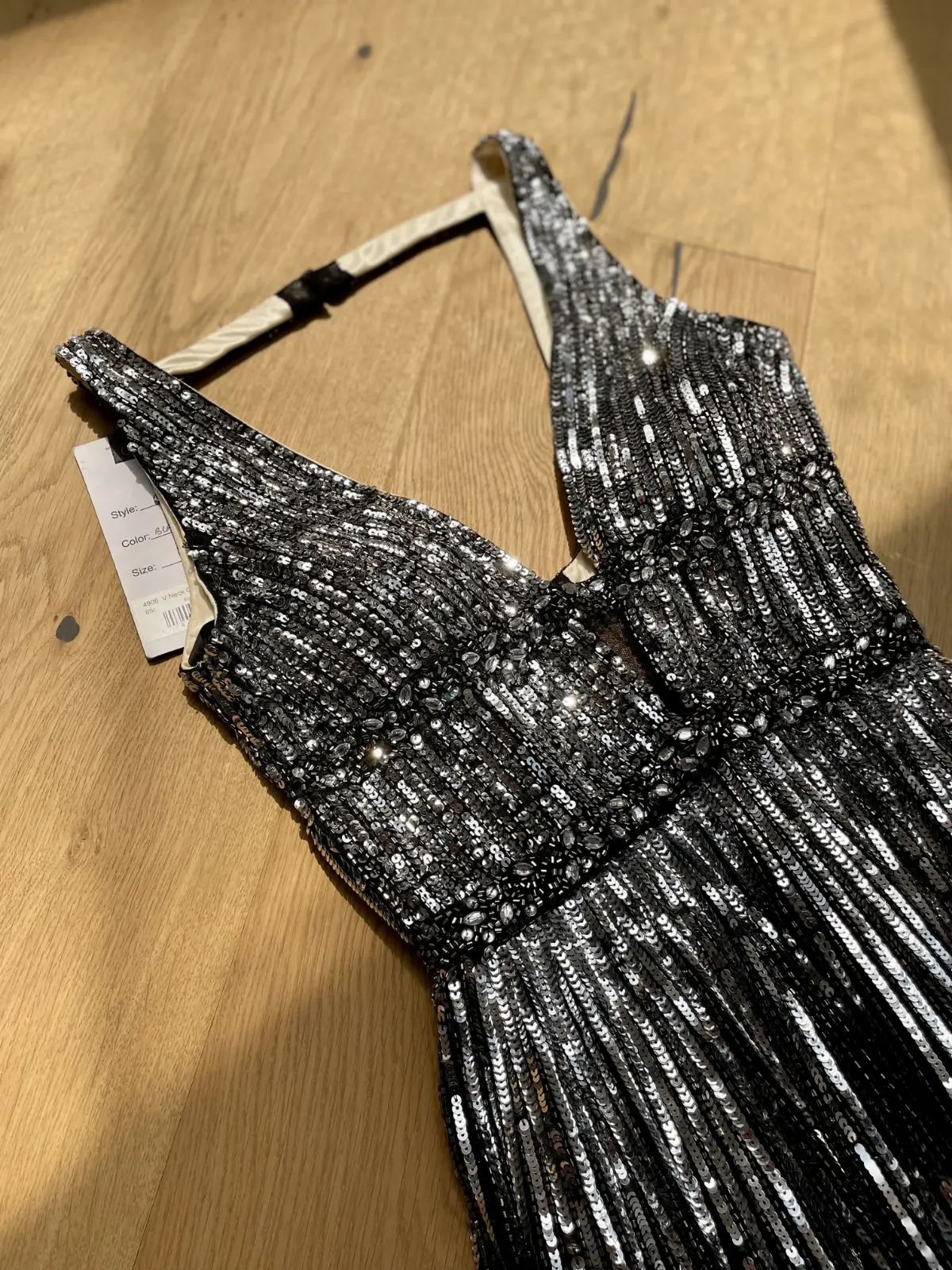 Vestido de lentejuelas negro con plateado talla 2 con espalda abierta y frente en V. Todas las lentejuelas están reforzadas y tiene copas para no tener que ponerse bracier. Tiene una caída muy bonita