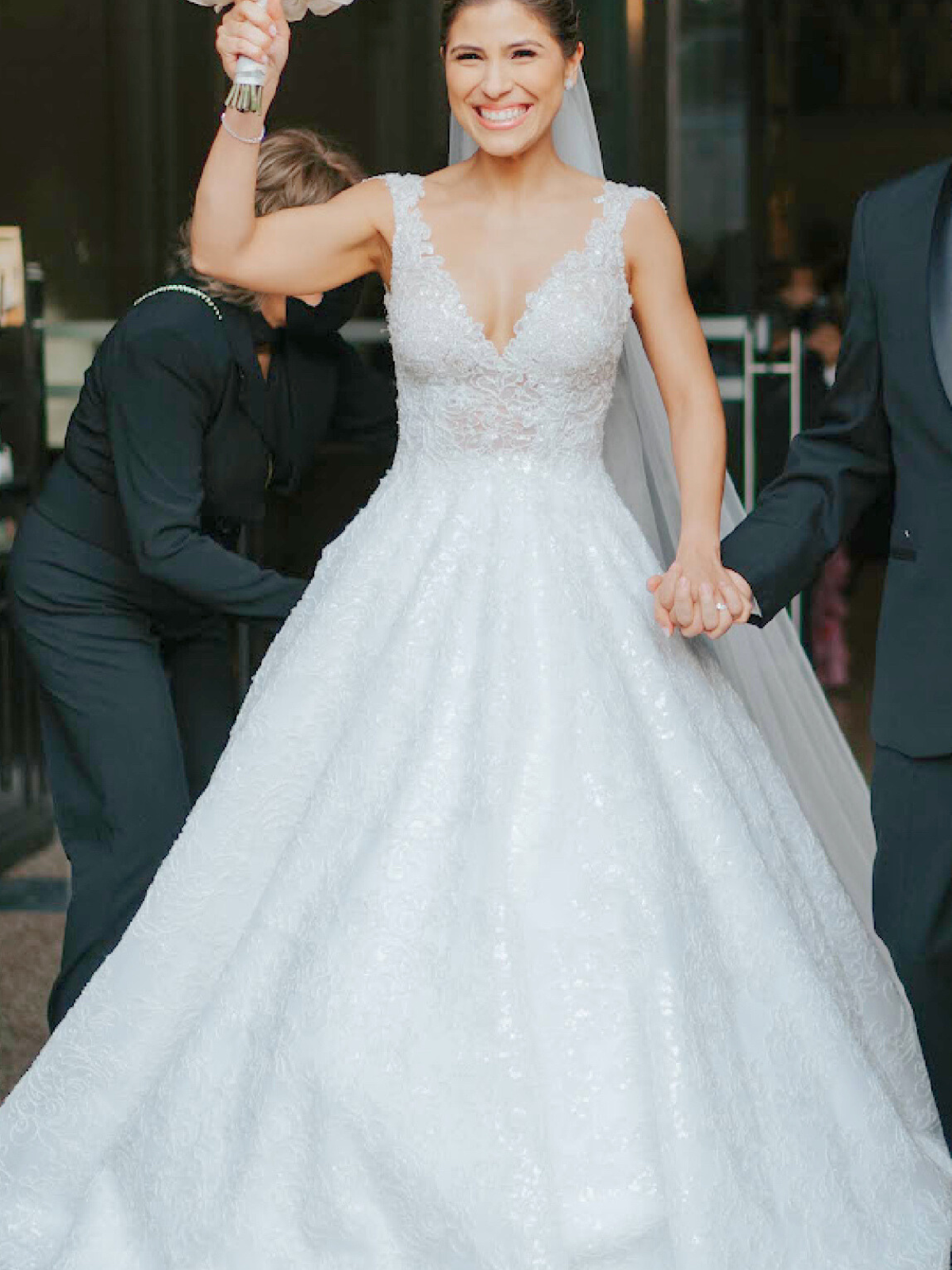 Vestido de novia corte A usado una vez. Diseñado por la diseñadora española Marcela de Cala con tela libanesa. Acabados de encaje y brillo en todo el traje, espalda en corte V.