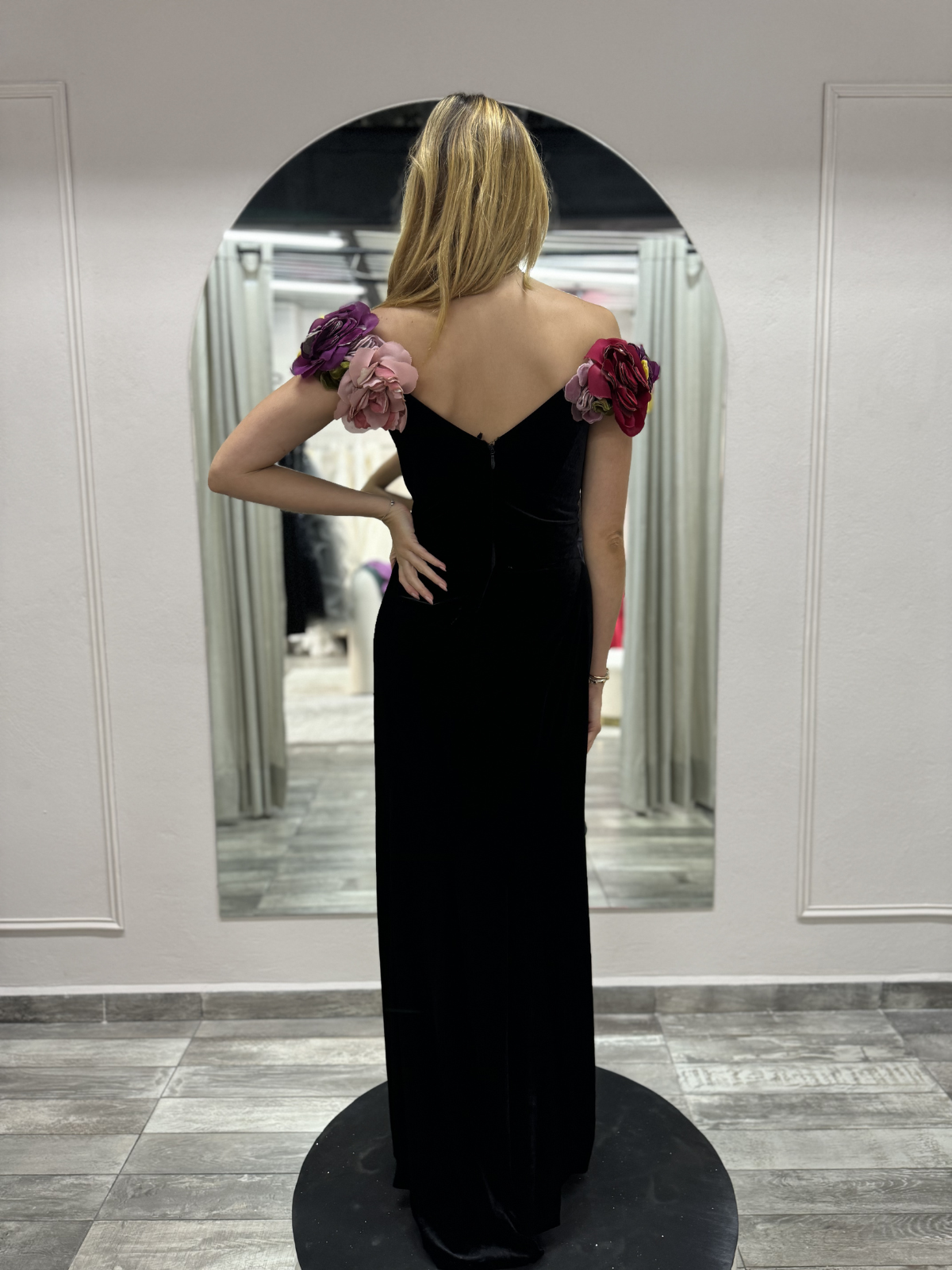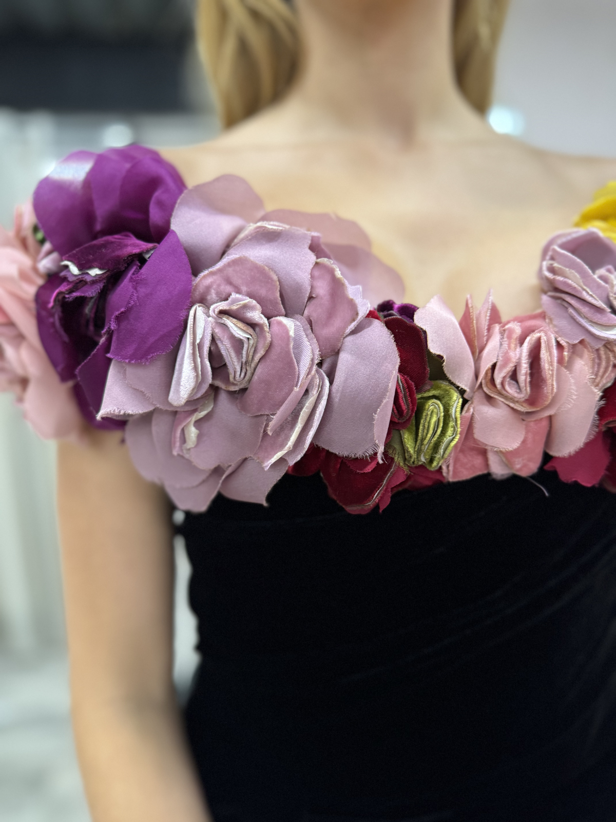 Hermoso vestido de velvet marca Marchesa con aplicaciones de flores.