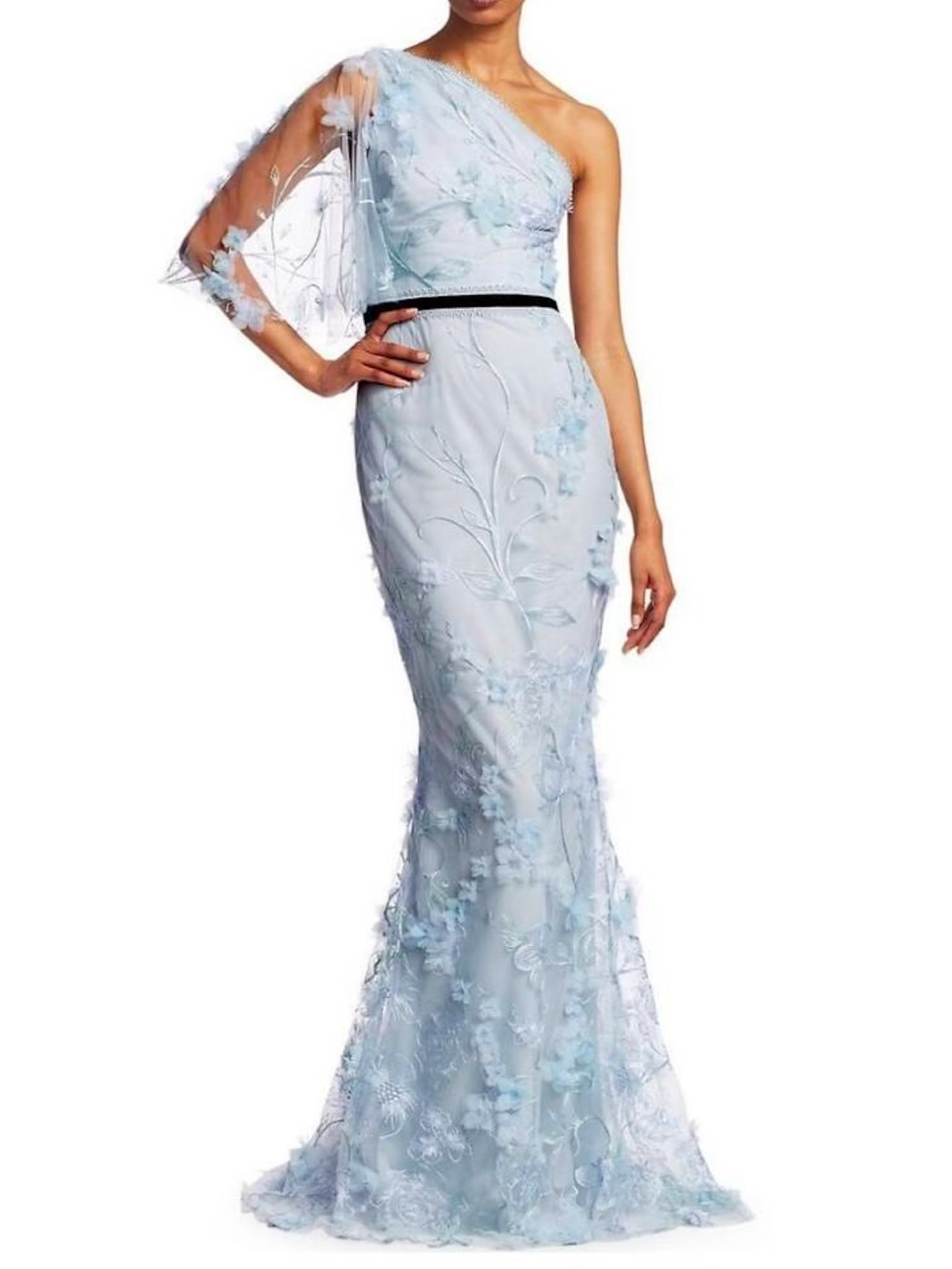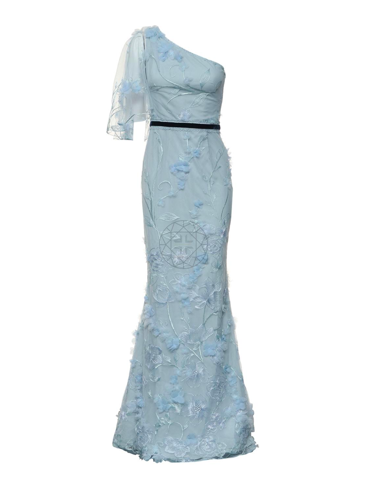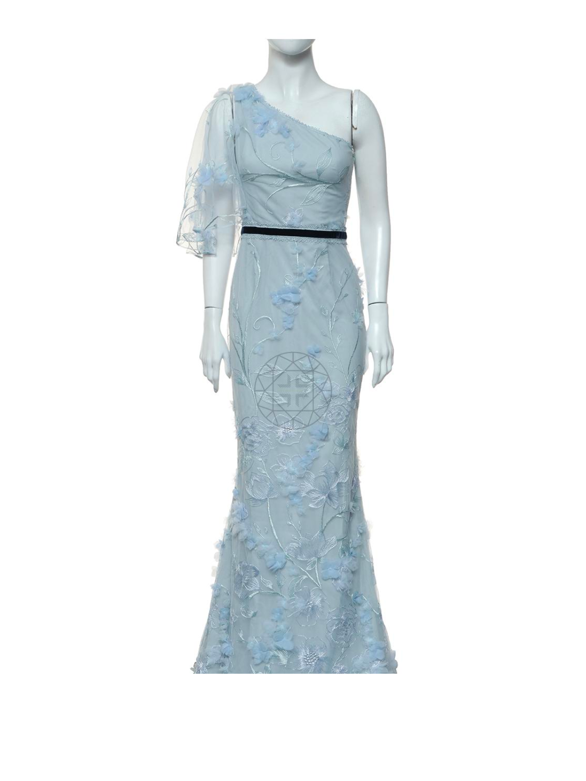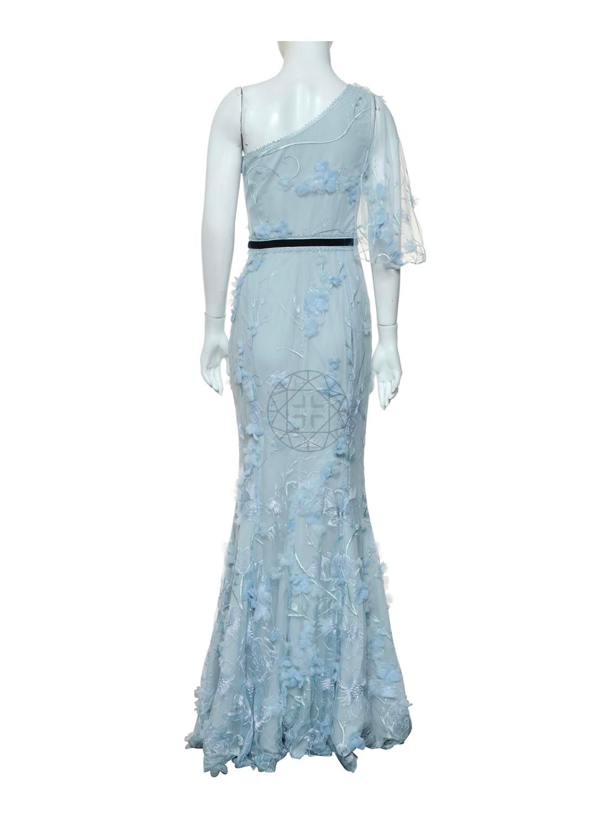 Descripción del producto: Vestido azul claro en corte de sirena con aplicaciones de flores en tul y cinturón de terciopelo azul marino.