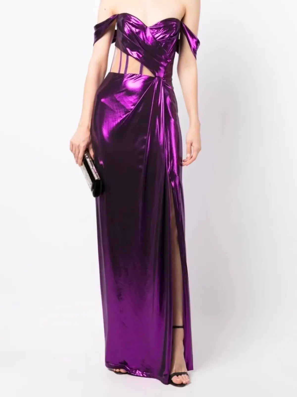 Hermoso vestido morado metalico, con apertura en el dorso.