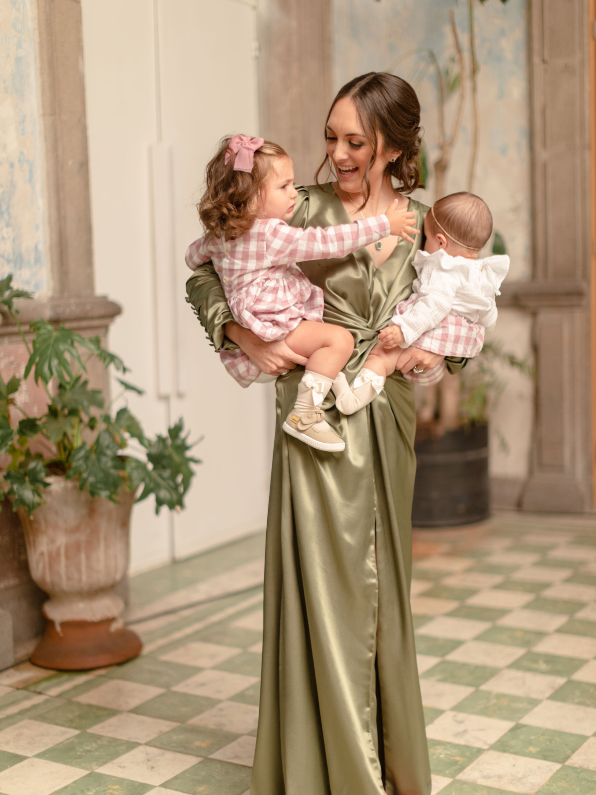 Vestido de alta costura para ser la invitada ideal en color verde militar satinado