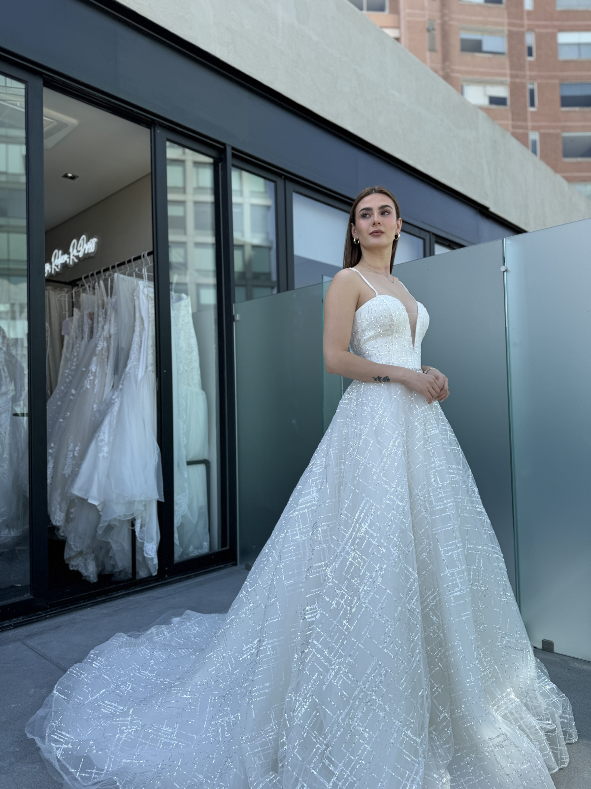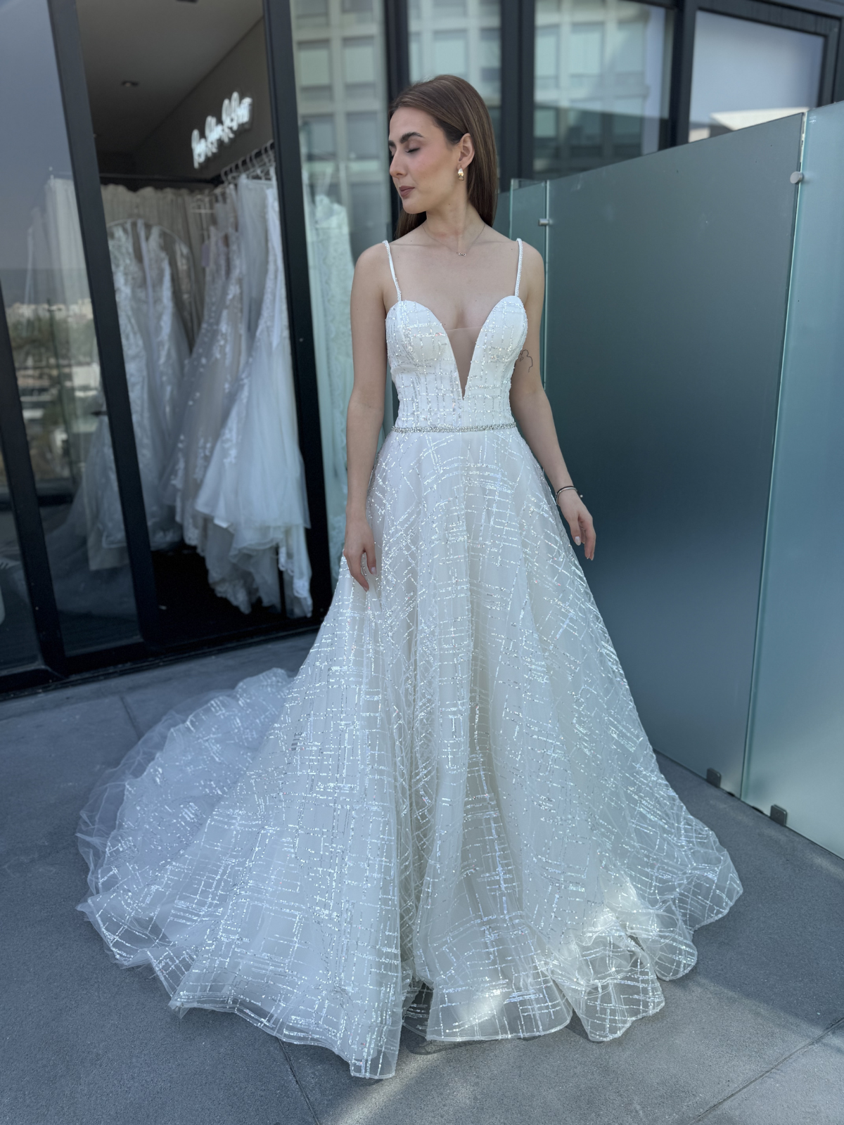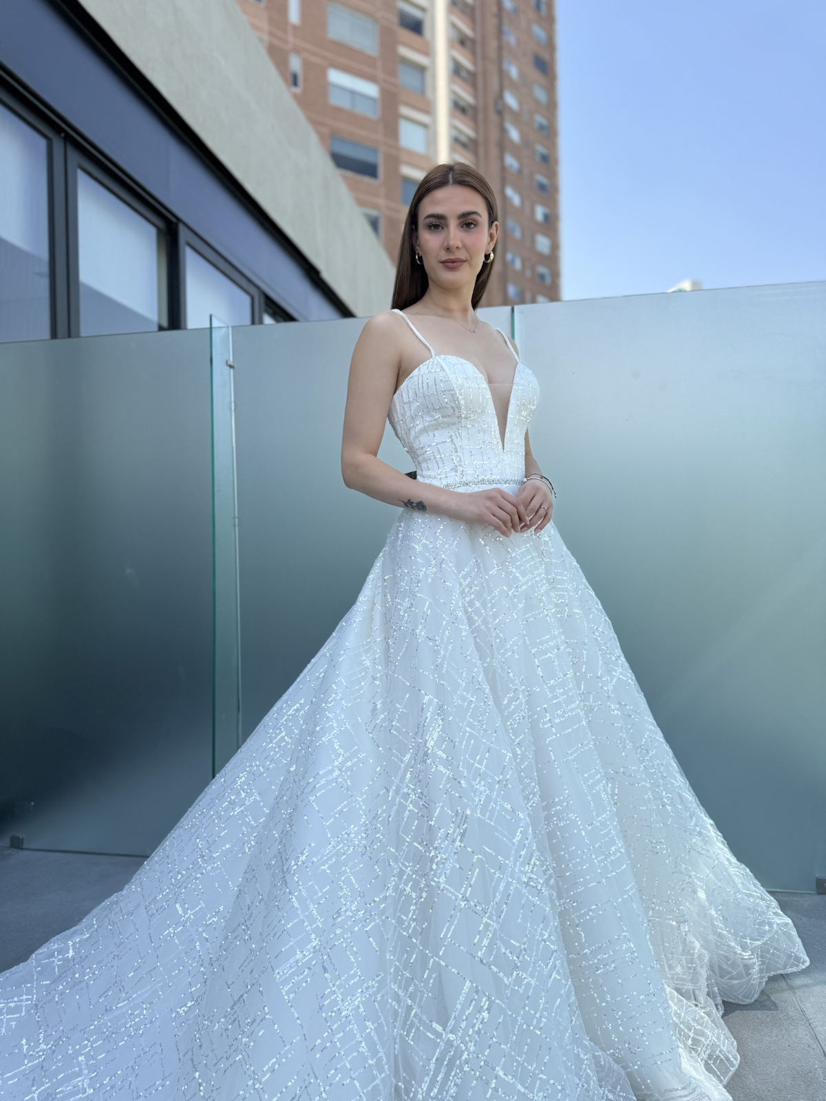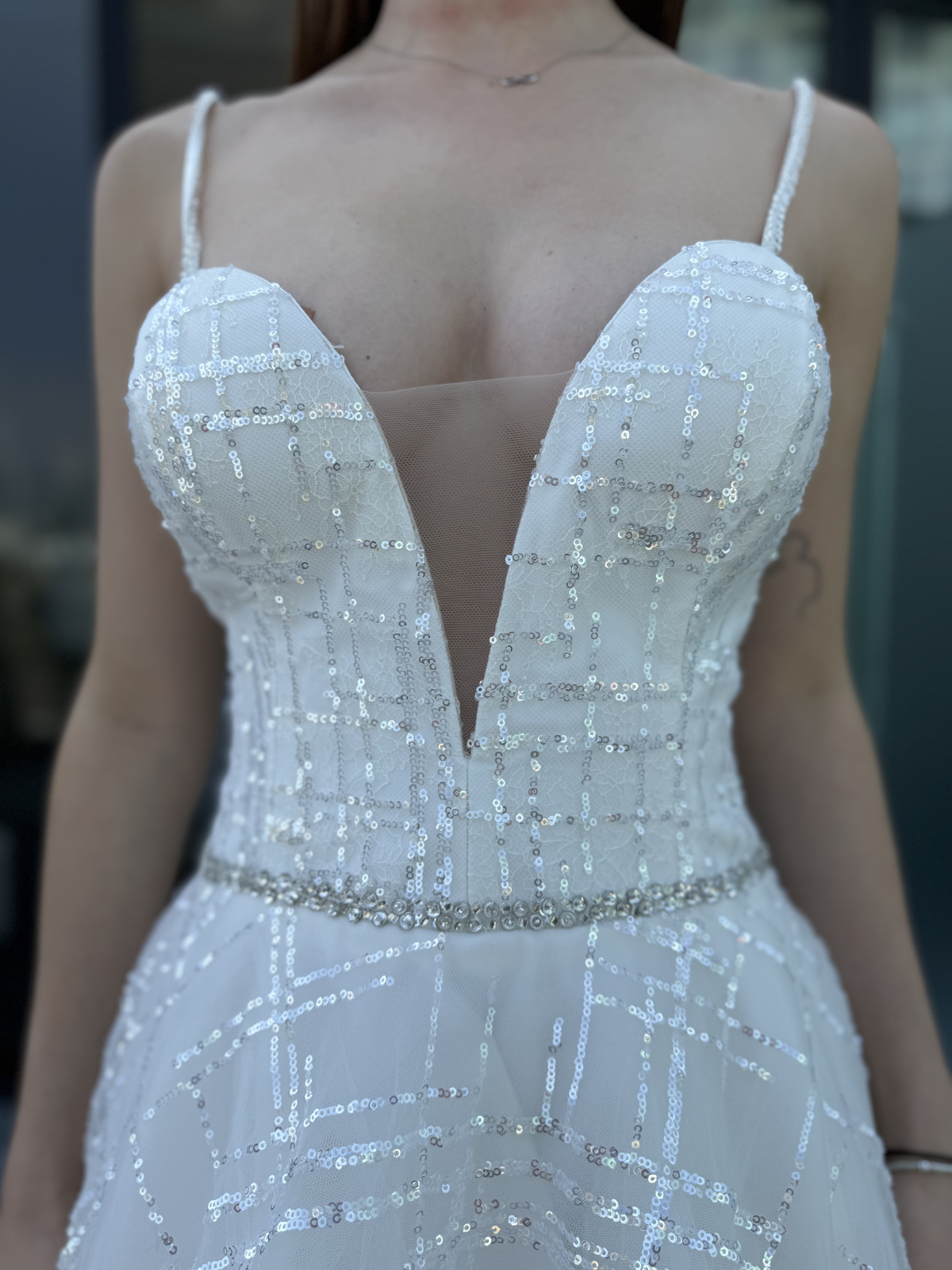 Vestido princesa, falda en Tul, talle bordado en pedrería. Color Ivory.