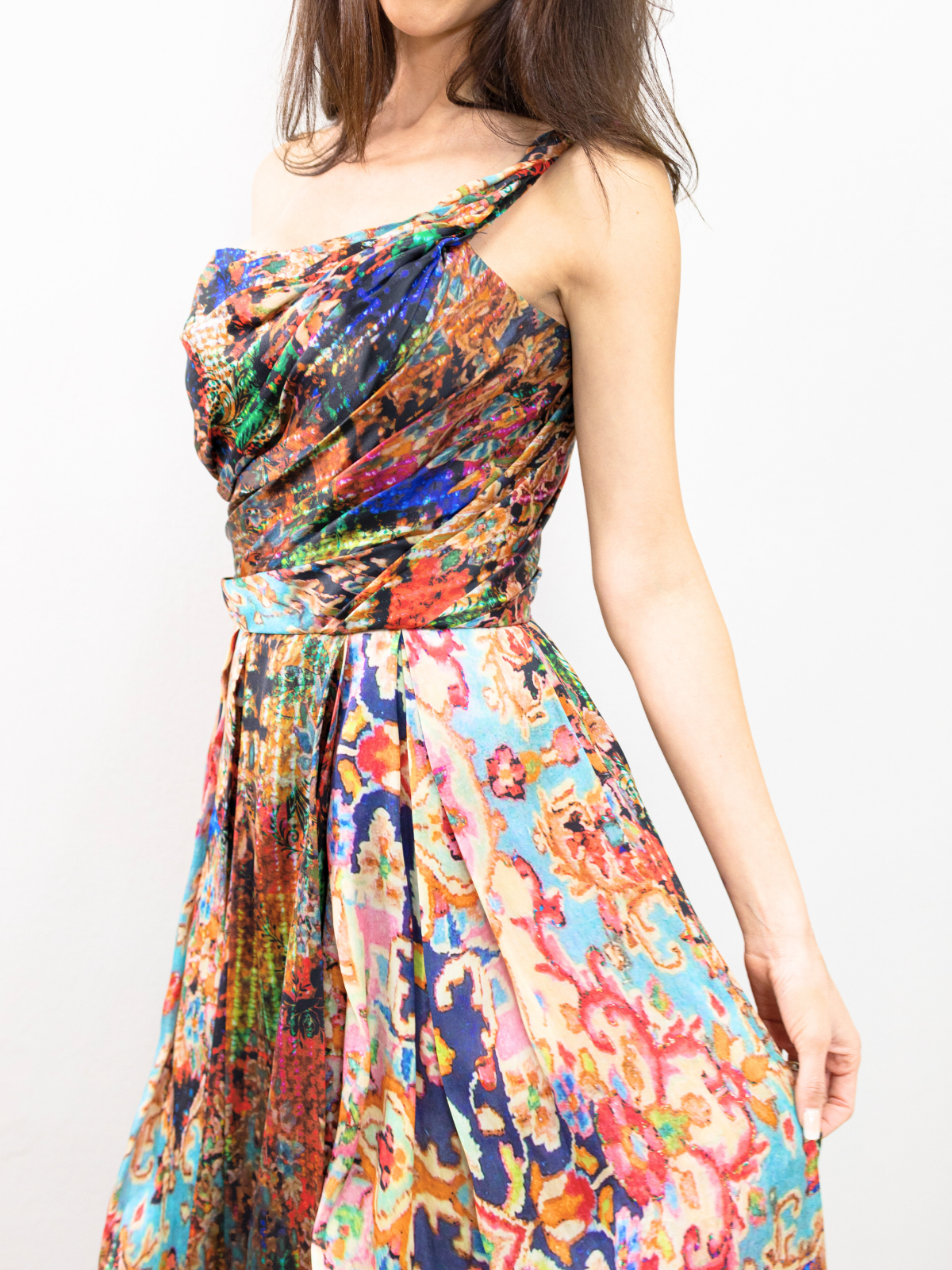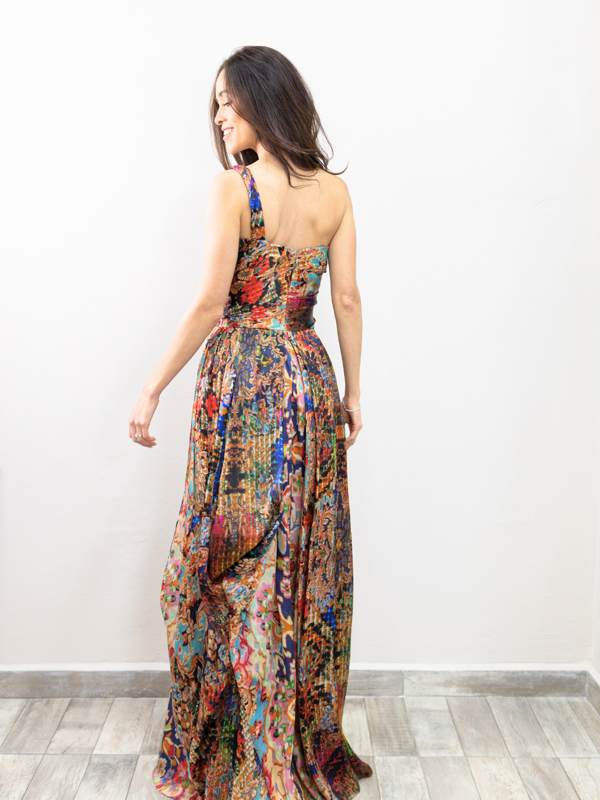 Hermoso vestido multicolor, es de pasarela y un diseñador espectacular. Lo use para la boda de mi hijo, es super comodo y elegante.