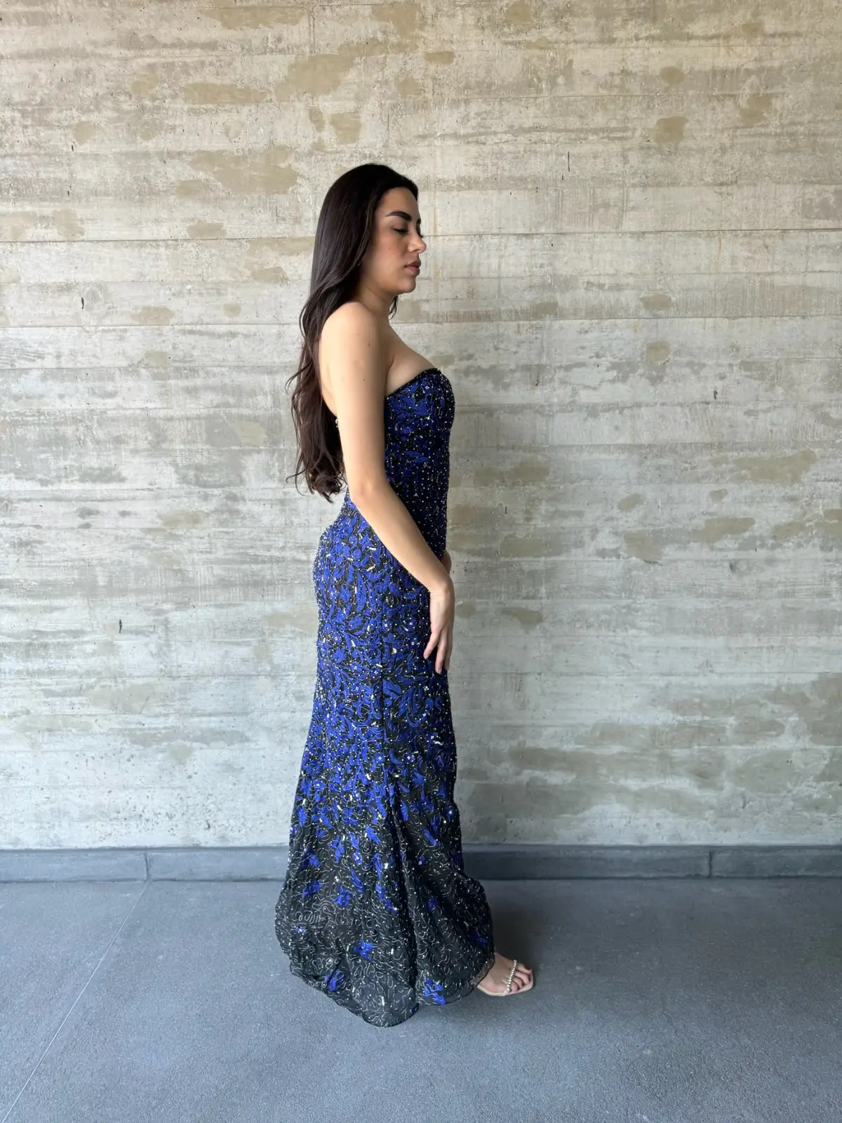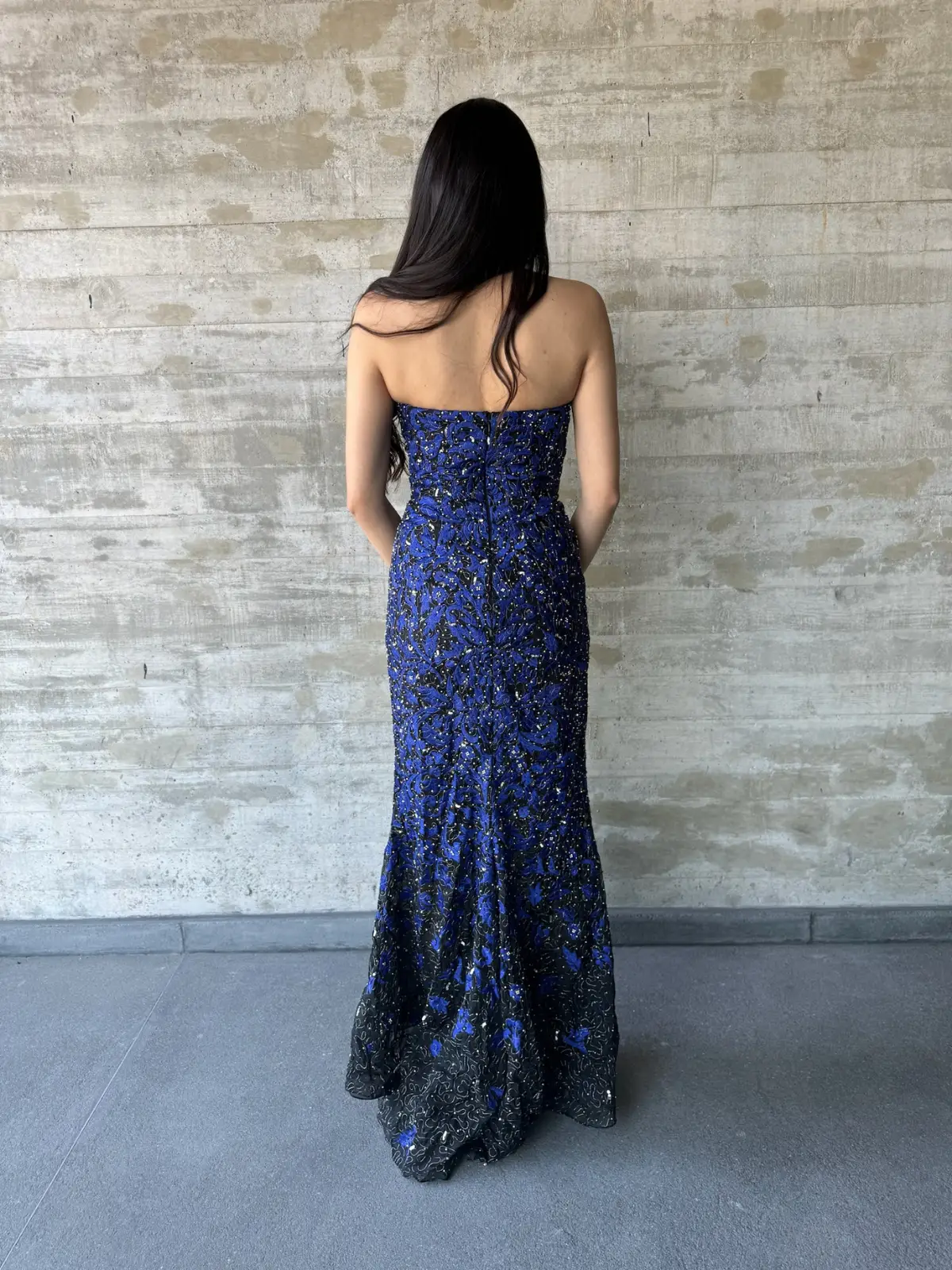 Vestido negro strapless bordado con hilos métalicos, cristales y piedras.